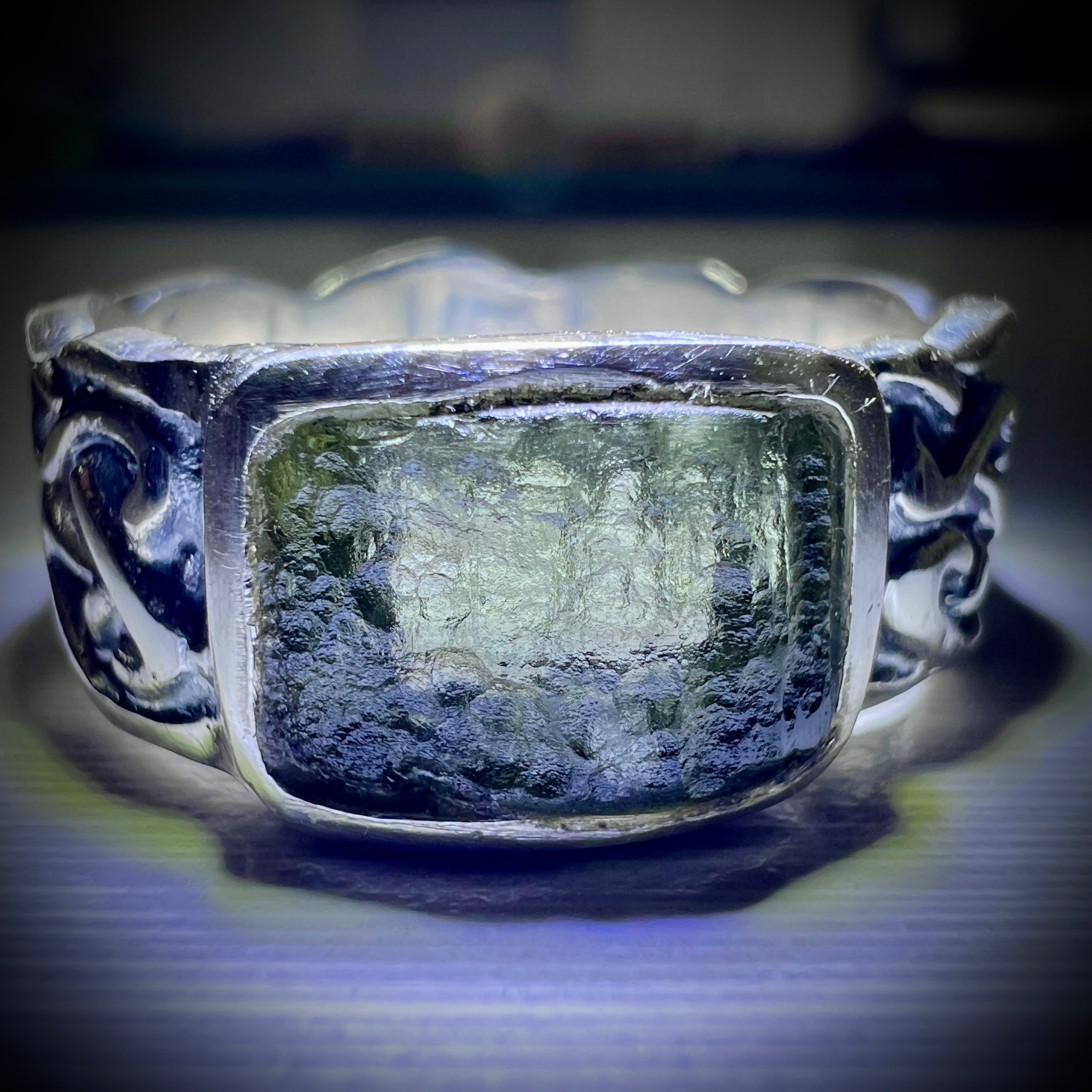 A handcrafted sterling silver ring featuring a genuine 0.6-gram Moldavite, set in a rectangular stone design with a Celtic-inspired thick band. The intricate Celtic motifs honor tradition and symbolize interconnectedness, strength, and protection, complementing Moldavite’s raw cosmic energy.