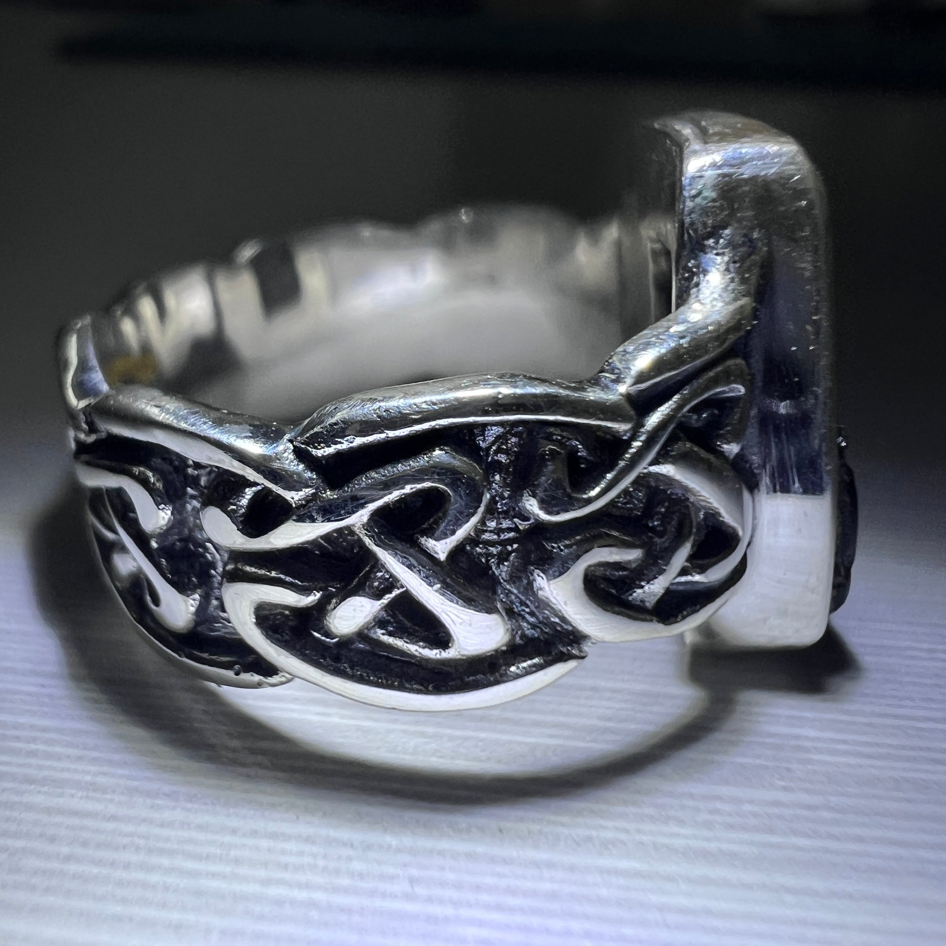 Moldavite is associated with transformation and spiritual growth, while Celtic motifs represent heritage, continuity, and protection, making this ring both a meaningful and stylish statement piece.
