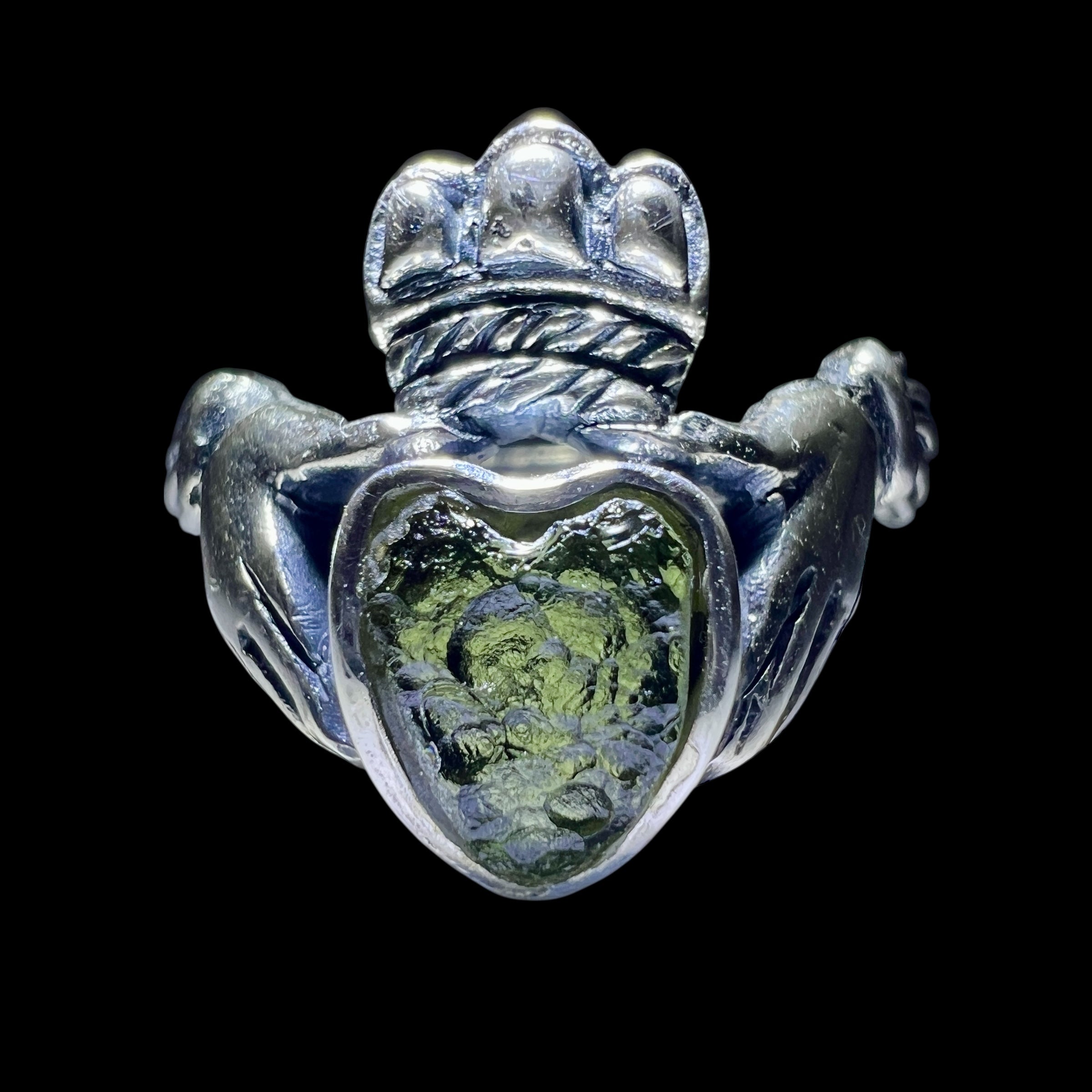 The traditional Claddagh design represents love (heart), loyalty (crown), and friendship (hands) — values deeply intertwined with the spiritual essence of Moldavite itself. This fusion of Celtic symbolism and the cosmic origin of Moldavite creates a piece that’s both meaningful and powerful — a symbol of connection across time and cultures.