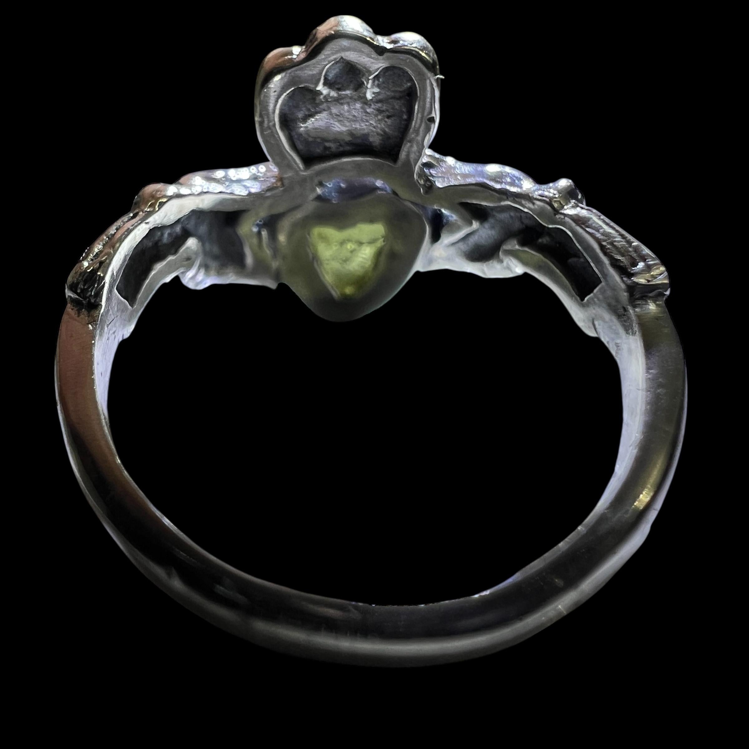Hand-crafted from solid sterling silver, this unique Claddagh ring features a genuine Moldavite from Chlum weighing 0.4 grams.