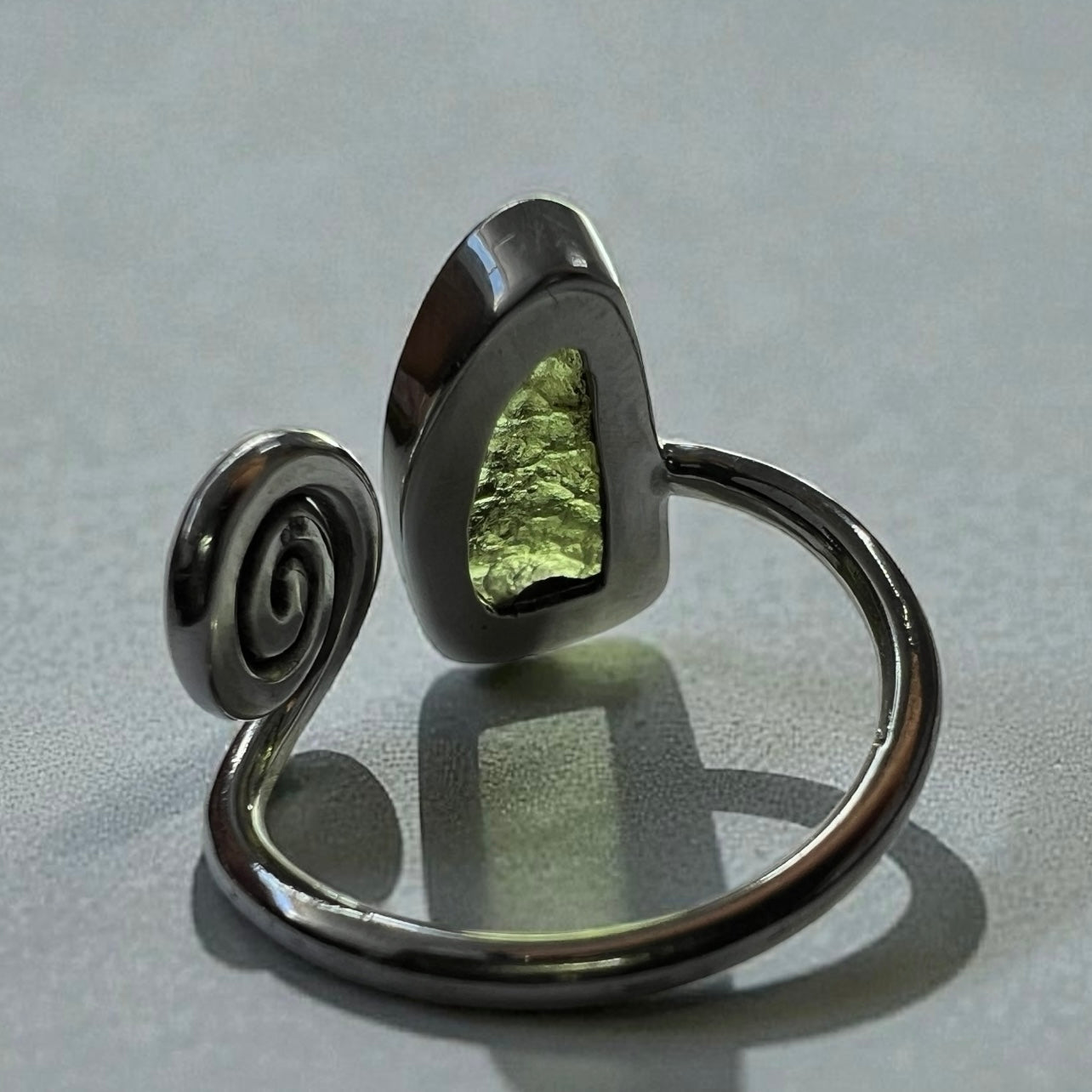 💫 Spiral Oval Moldavite Silver Ring – Open Size 6 (N), Adjustable up to 1–2 Sizes