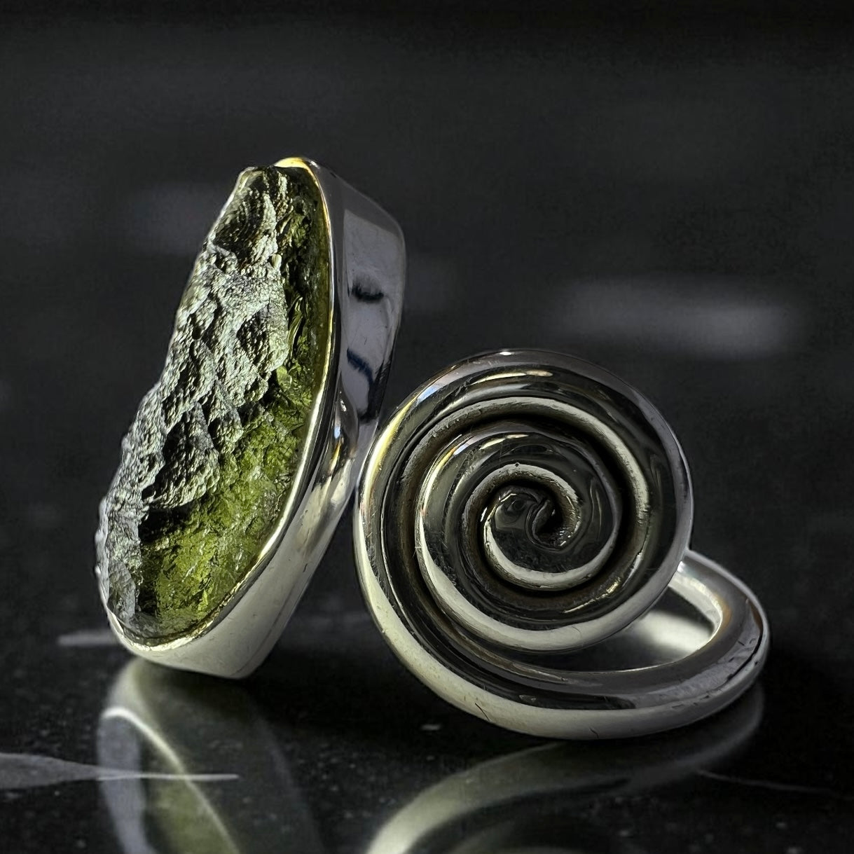 Elegant and full of movement, this Spiral Oval Moldavite Silver Ring captures the natural beauty and cosmic energy of authentic Moldavite. The raw, oval-shaped Moldavite glows in shades of olive and forest green, its textured surface reflecting the light with otherworldly brilliance.