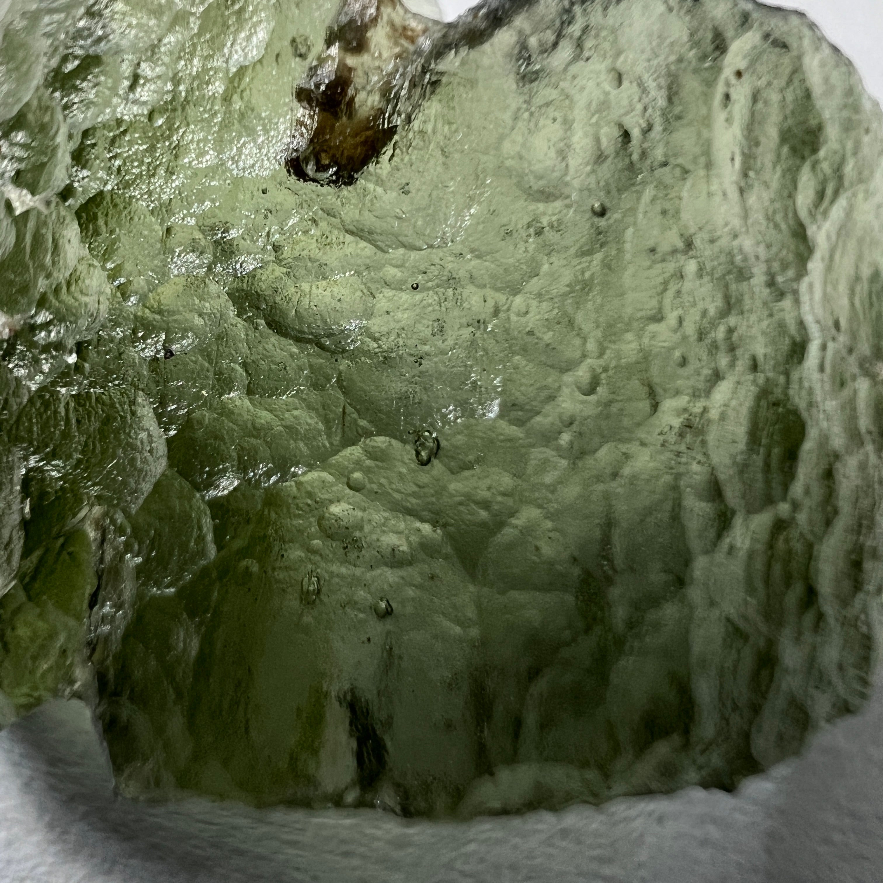 Moldavite is a rare tektite or meteoric glass, caused by an asteroid impact 15mil. years ago. The intense, 10,000°c+ temperatures of the strike vapourised the asteroid, target rock and sand, flinging the molten substance high into the atmosphere.
