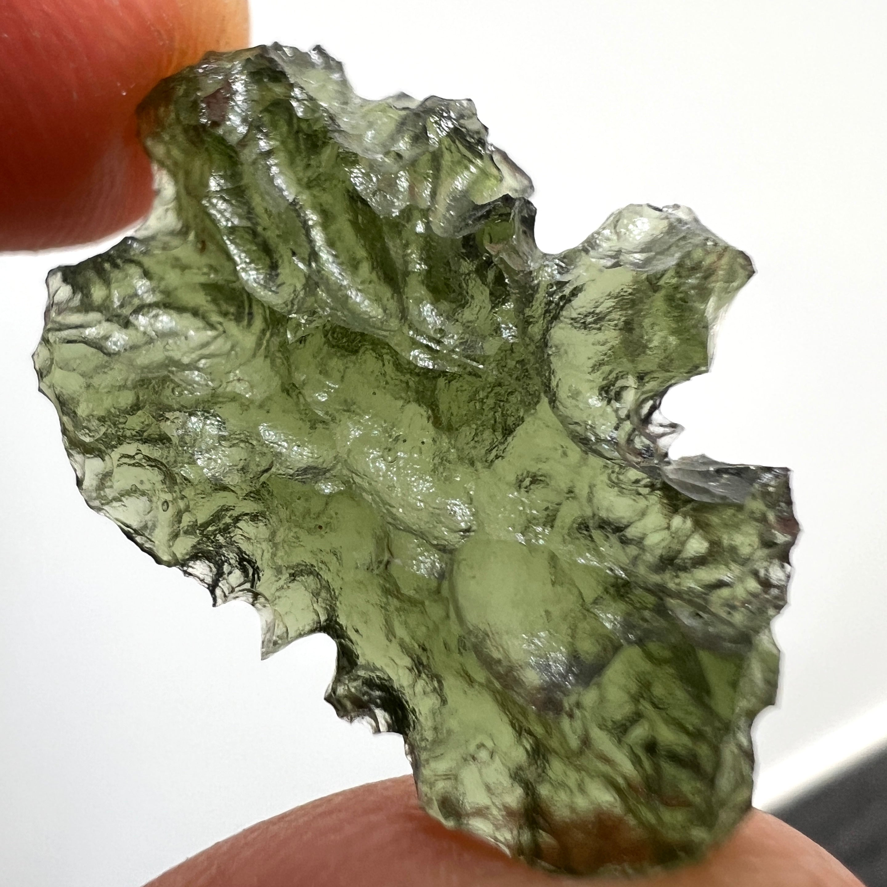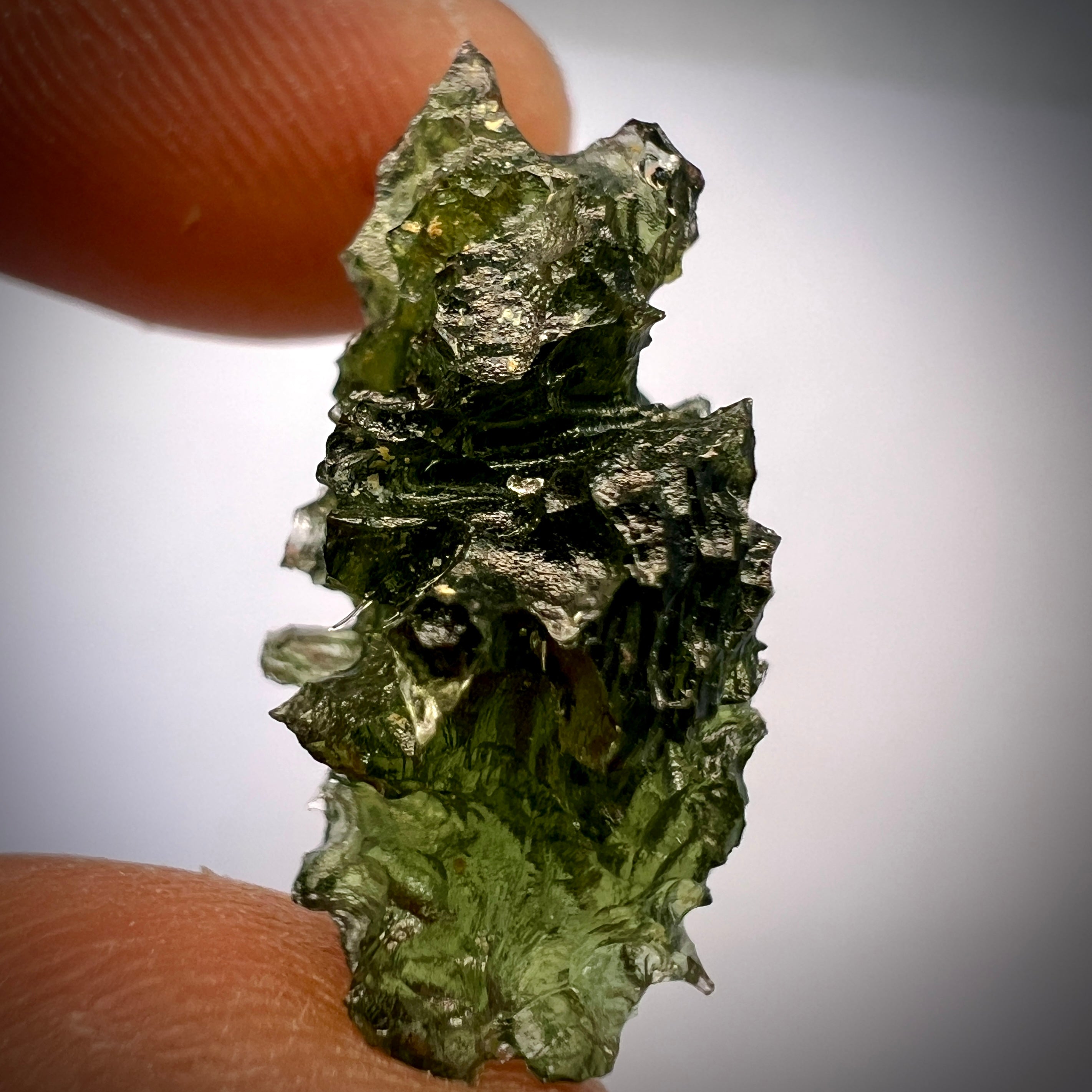 This 2.12g natural Moldavite comes from Marouškovо Pole, Czech Republic, a locality celebrated for its finely textured and energetically balanced stones. The piece shows a well-defined natural surface, with intricate ridges and delicate sculpting that formed under extreme heat and pressure millions of years ago. Its deep olive-green color reveals soft translucence under light, bringing out the stone’s natural depth and inner glow.