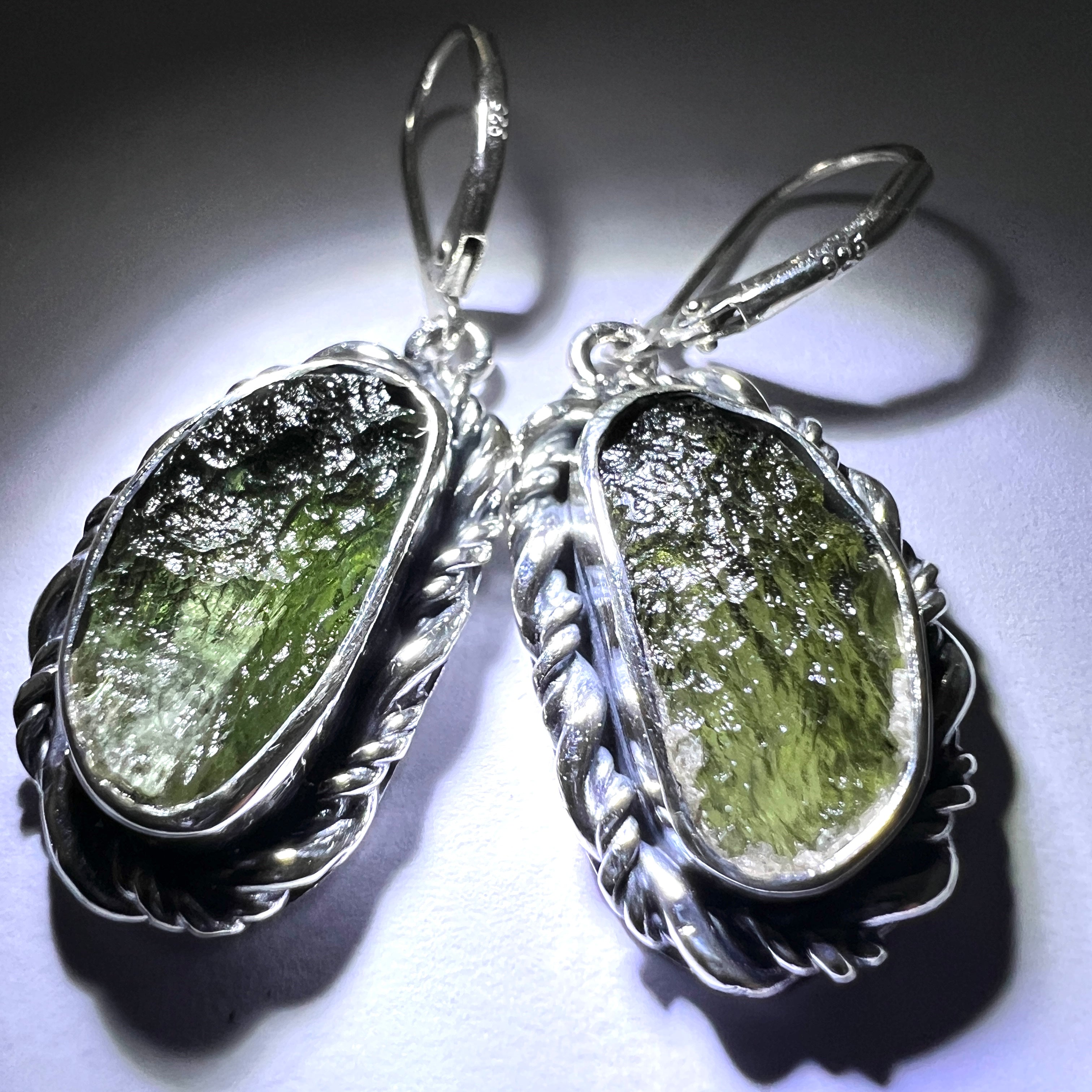 Each earring is set with a natural Moldavite gemstone from Chlum in the Czech Republic, its deep green radiance contrasting beautifully with the cool luster of silver. Together, they create a visual harmony that feels both timeless and contemporary.