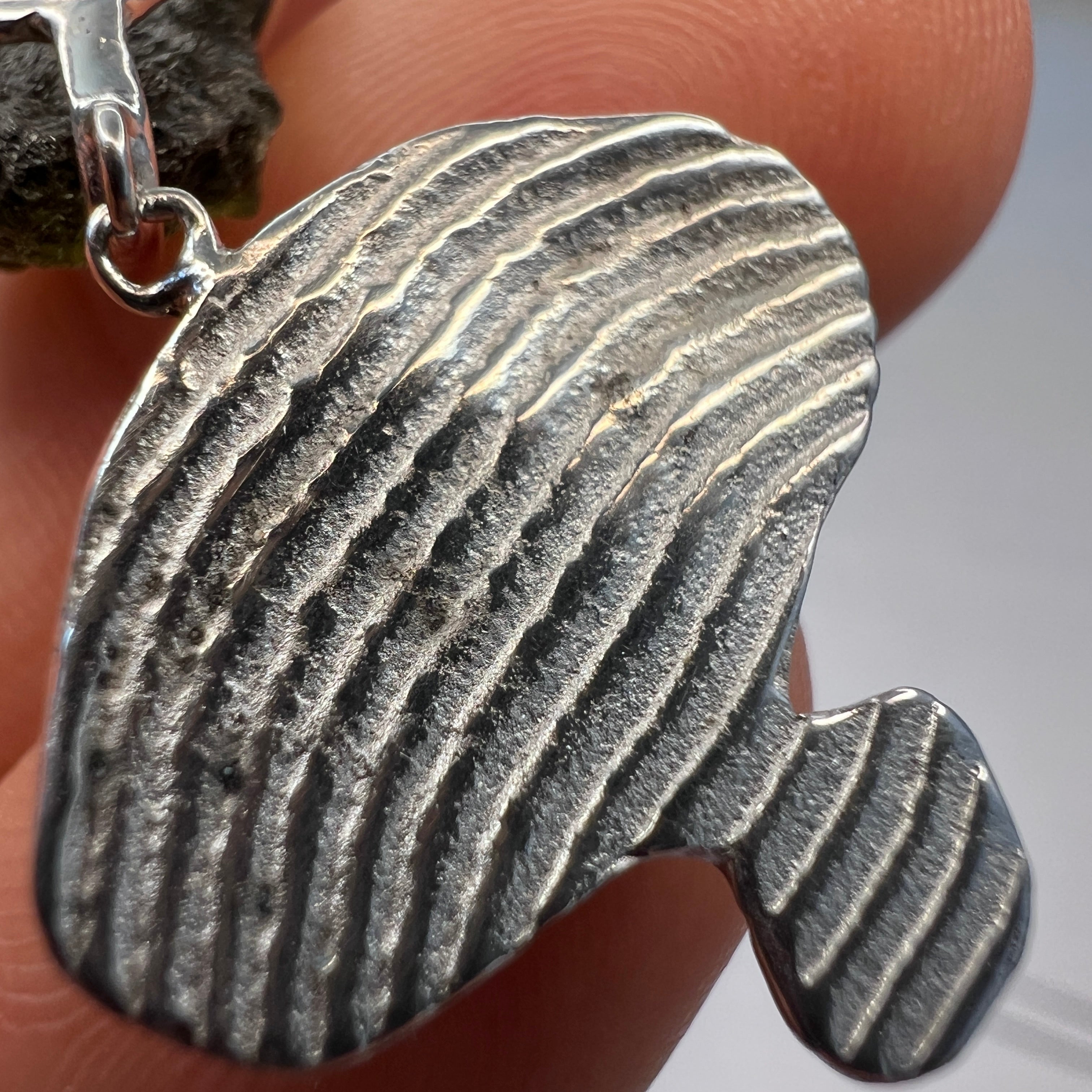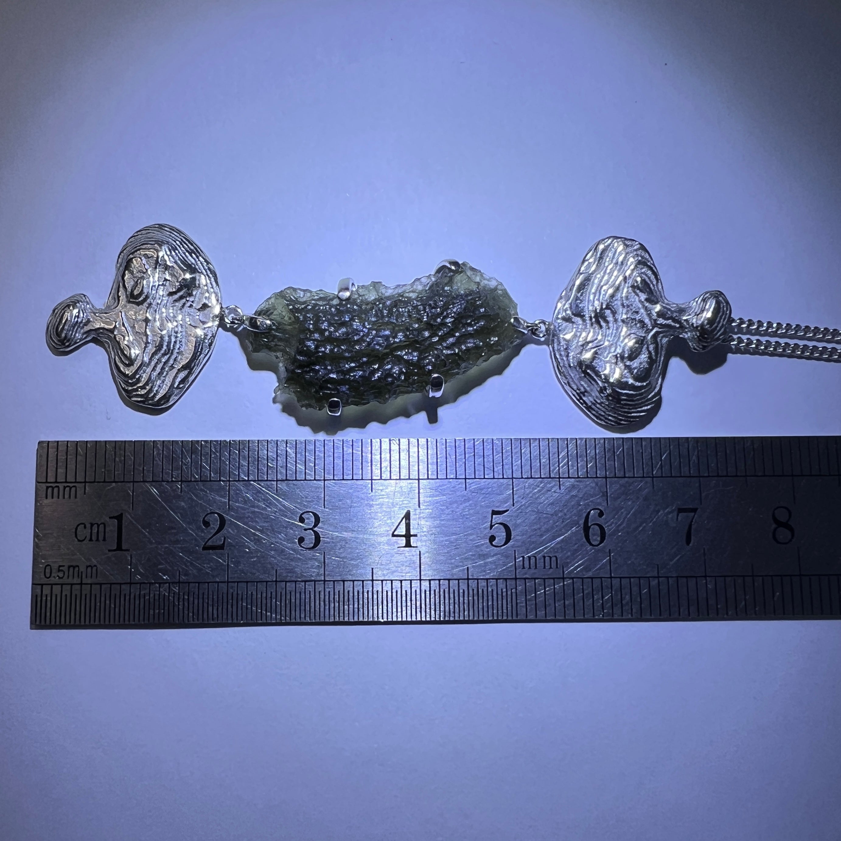 Tail-like design Moldavite necklace featuring a 2.6g genuine natural Moldavite sourced from Malý Chlum, Czech Republic, set in rhodium-plated silver to help prevent tarnish and corrosion while maintaining a lasting shine.