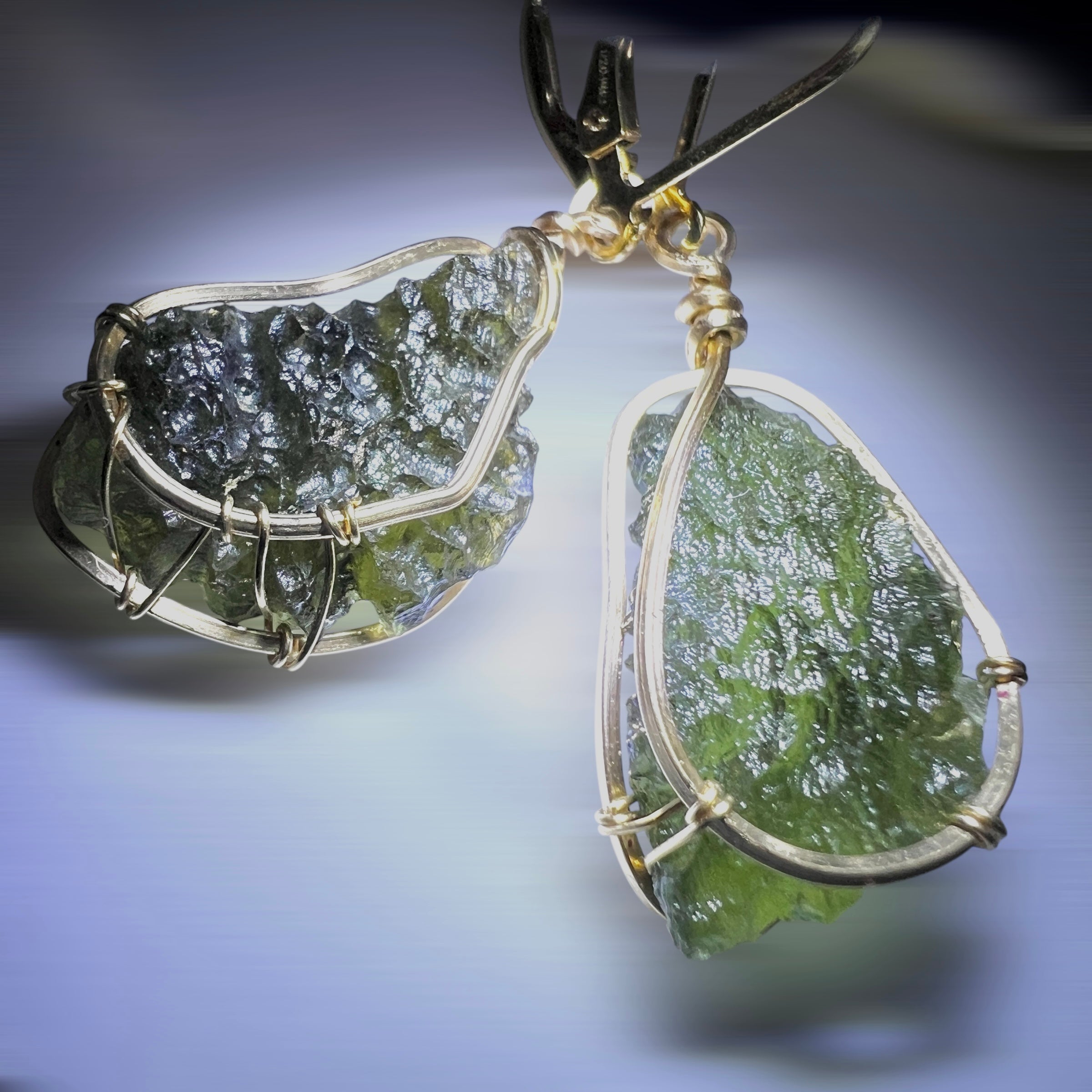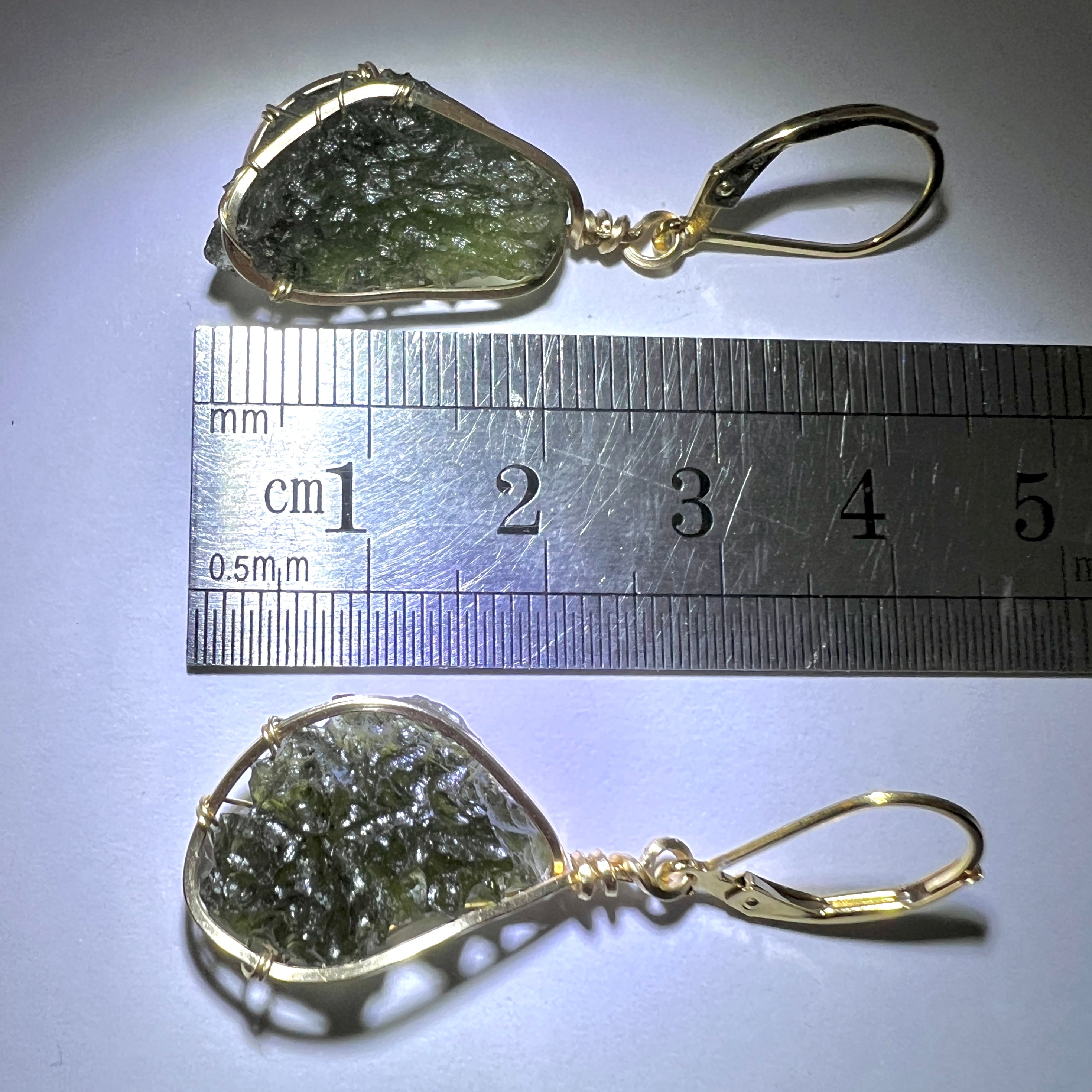 A stunning pair of Moldavite earrings, each featuring hand-selected, closely matched specimens from the famed Chlum locality — weighing just 0.22 grams apart (1.29 & 1.51g). These rare twins are wrapped delicately in 14k gold fill, allowing their natural shape and vibrant green glow to speak for themselves.