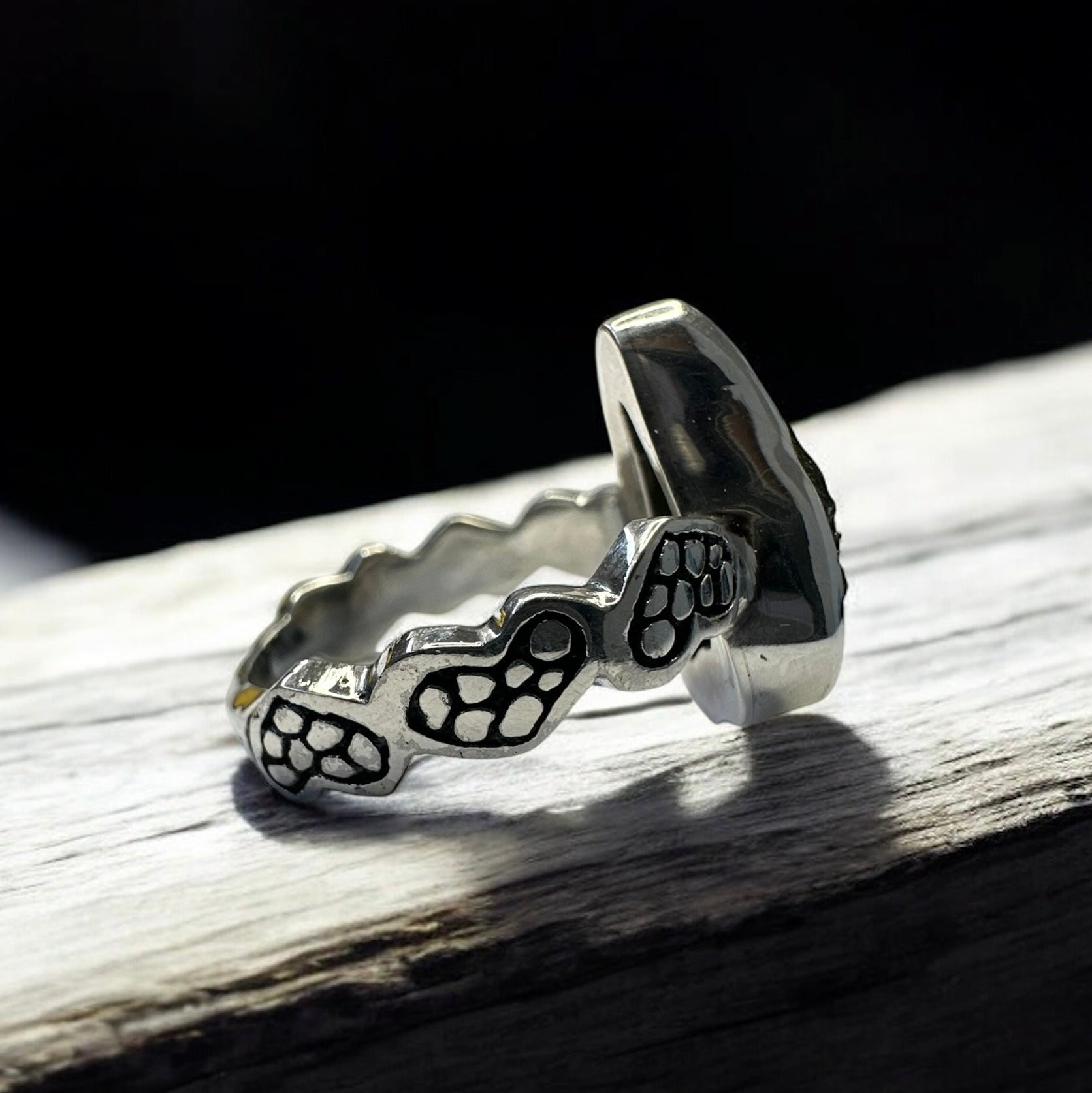 Expertly set in a handcrafted .925 sterling silver band, the ring combines timeless artistry with a modern, refined silhouette. The triangular cut enhances the Moldavite’s natural radiance while symbolising ascension and unity — a connection between Earth and the divine.