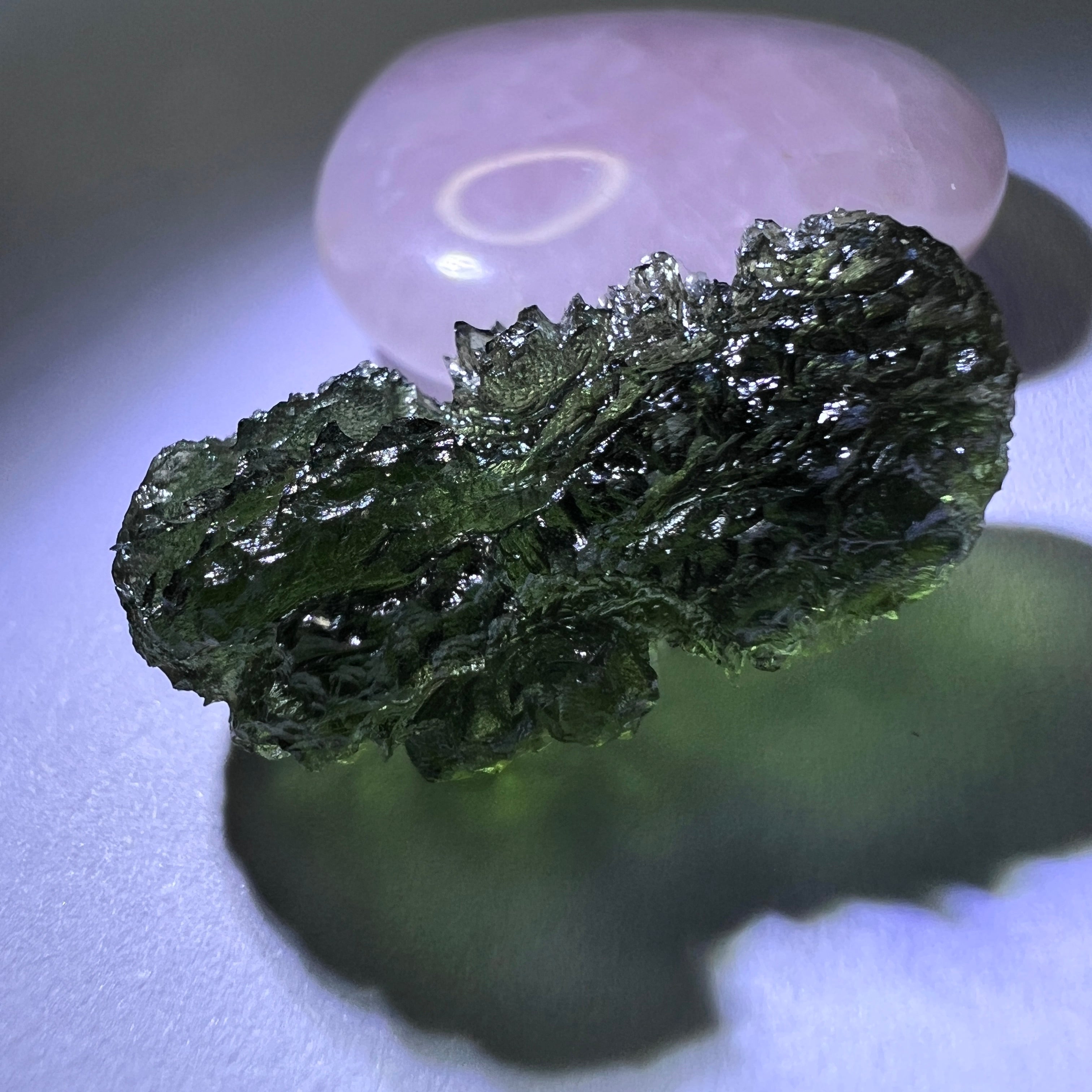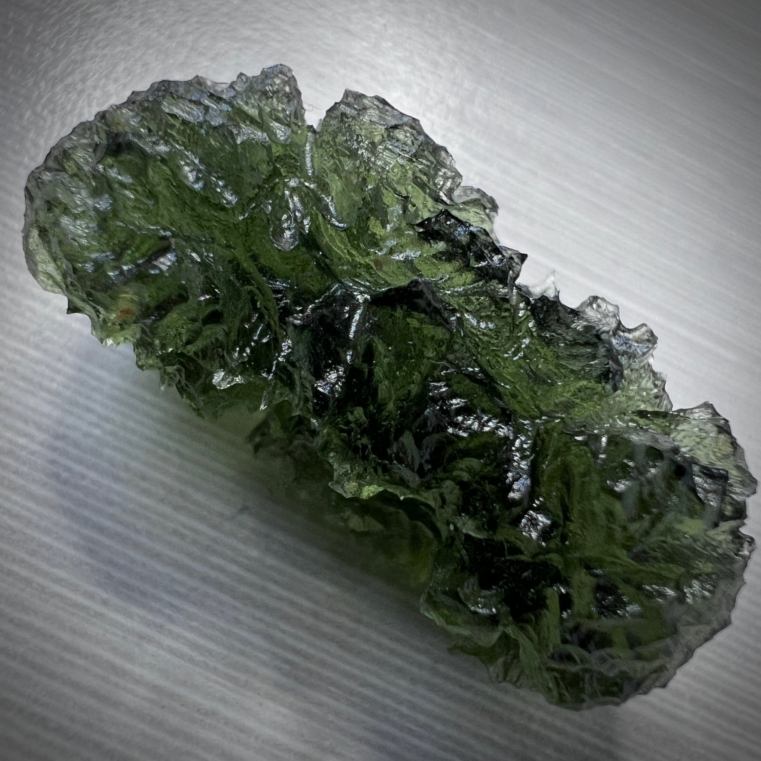 Absolutely immaculate 4.08-gram Moldavite from the highly sought-after Maly Chlum locality. This exceptional specimen features a rare cylindrical form with perfectly preserved sculpting and beautifully even texture across the entire surface. The clarity and translucence are outstanding, allowing light to glow through the glass with vivid depth and character. A truly prize specimen from one of the most acclaimed Moldavite locations.