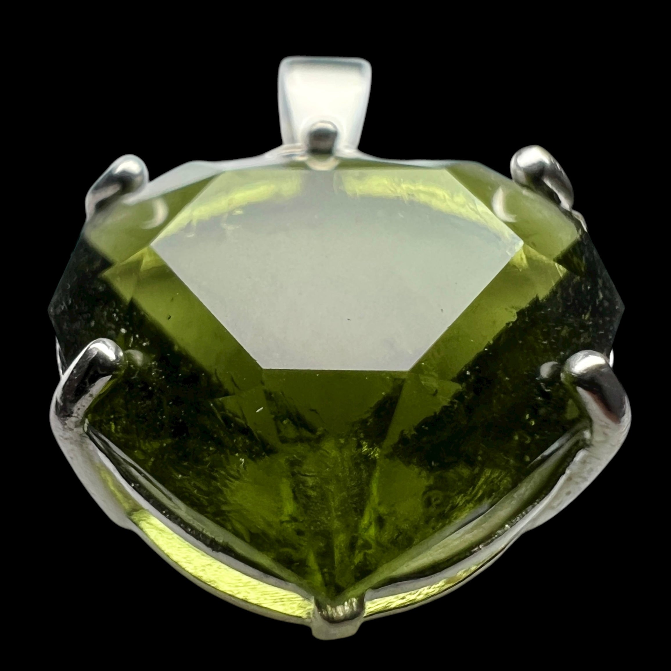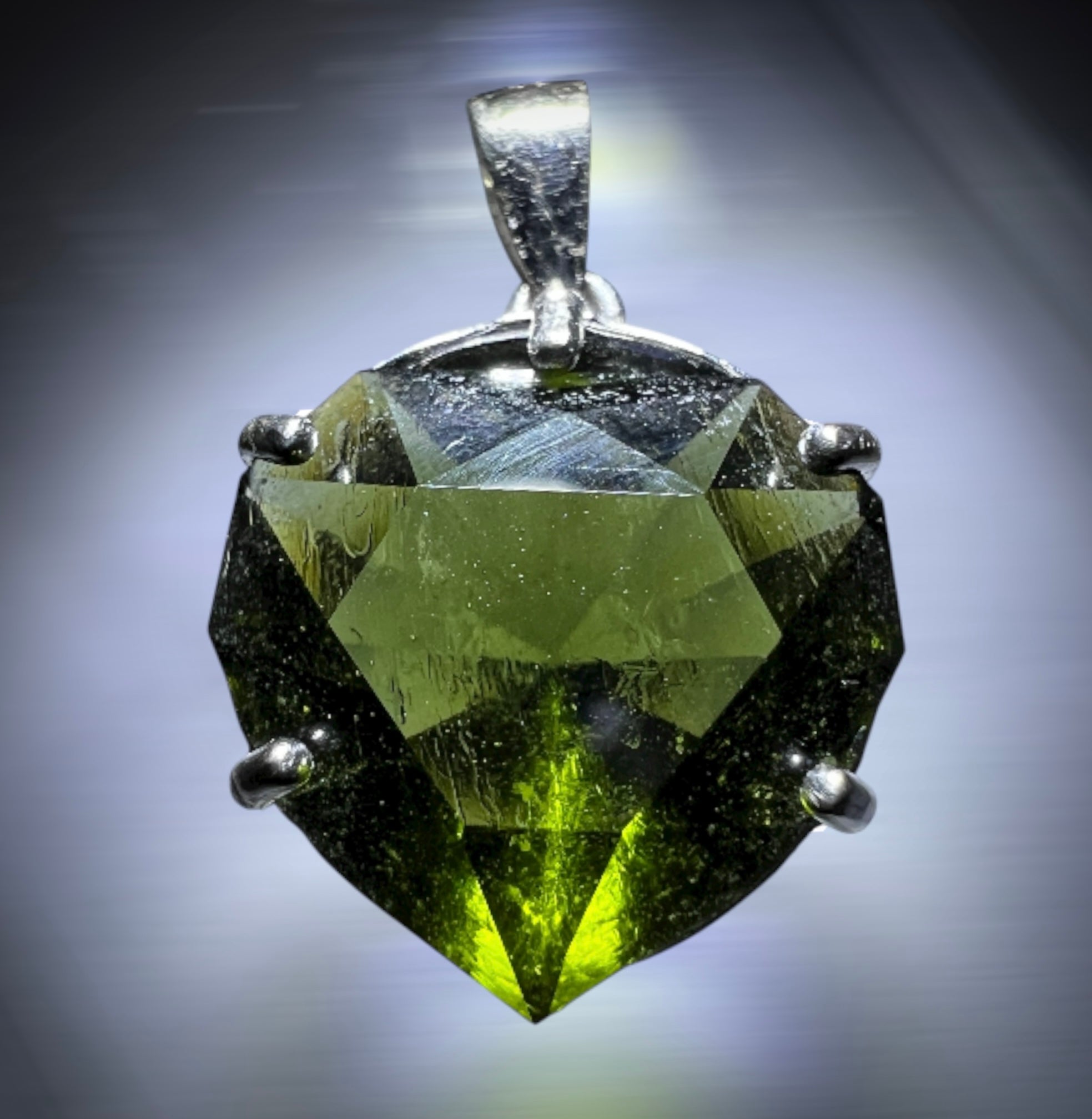 A captivating pendant showcasing a heart-cut faceted Moldavite, weighing 5.97 ct (14 × 13 mm).