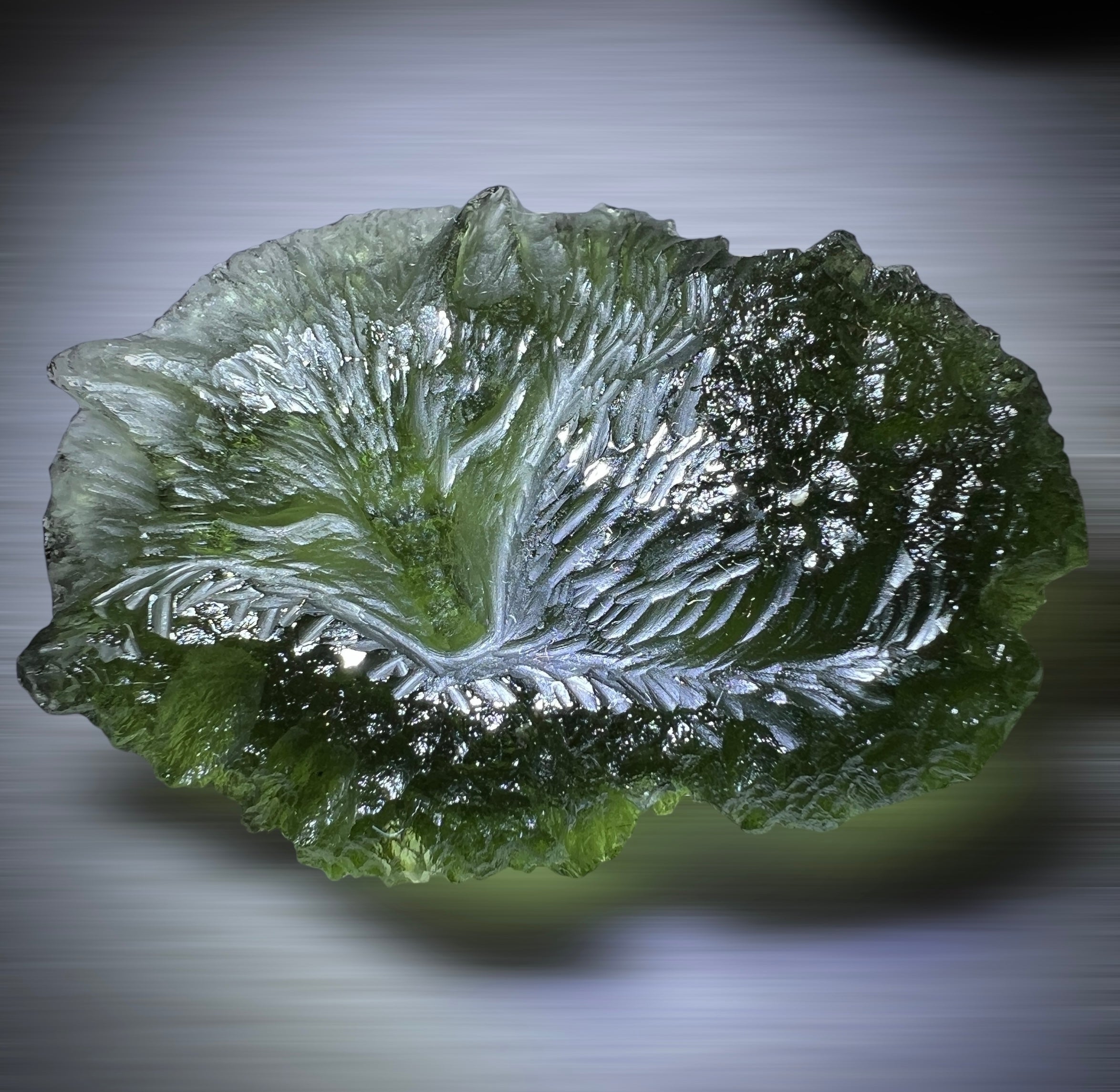 Moldavite is a rare tektite or meteoric glass, caused by an asteroid impact 15mil. years ago. The intense, 10,000°c+ temperatures of the strike vapourised the asteroid, target rock and sand, flinging the molten substance high into the atmosphere.