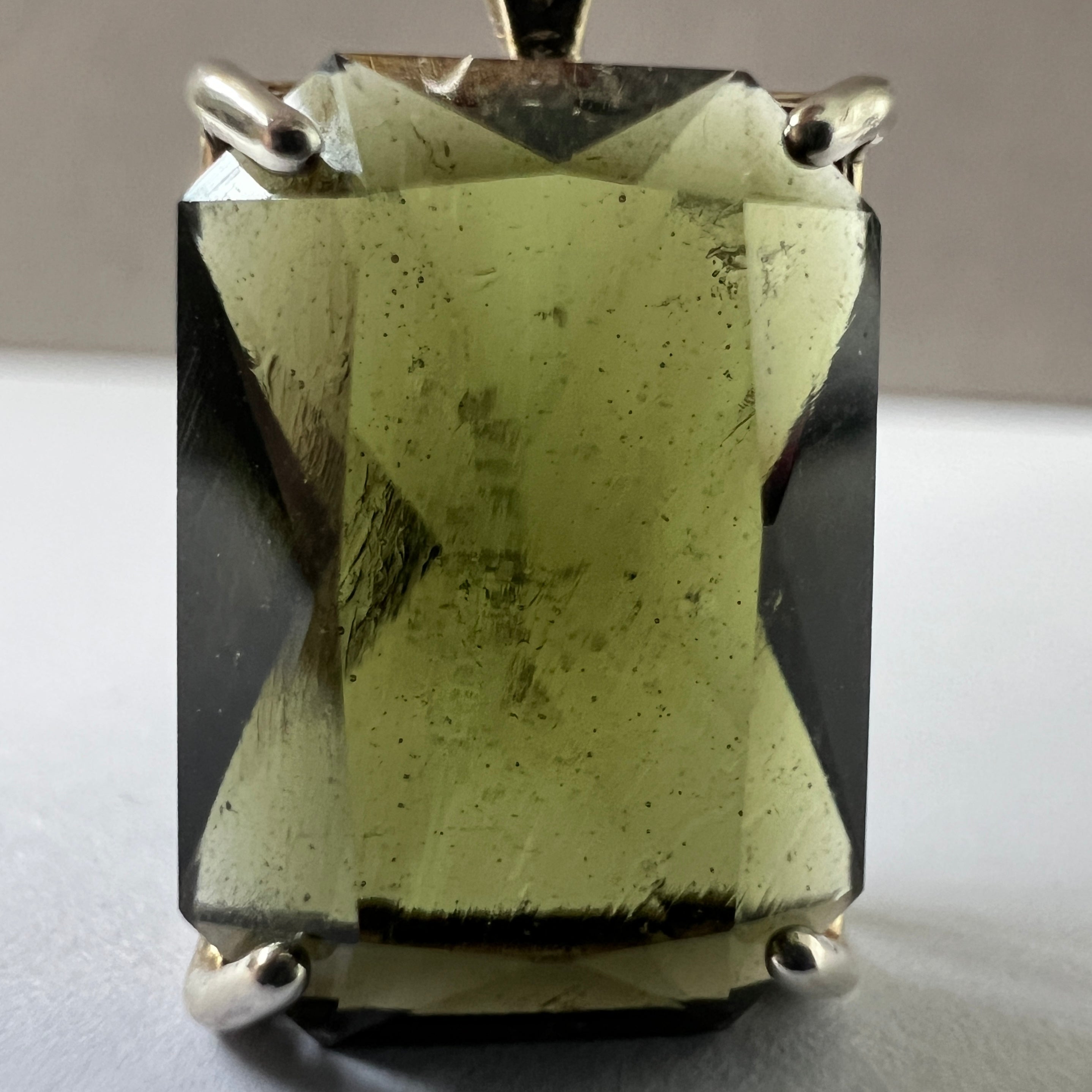 The 7.06ct Moldavite has been expertly cut into a striking emerald design, revealing the depth, brilliance, and natural vibrance of this celestial stone. Set in sterling silver and paired with a hypoallergenic stainless steel chain, it offers both lasting beauty and practical wearability. Handcrafted in the Czech Republic by a renowned father-daughter duo—legends in the Moldavite world for decades—this pendant is a true labor of love. Cut and polished entirely by hand from a larger raw specimen, it features a clean faceted emerald shape that radiates both cosmic power and refined elegance.