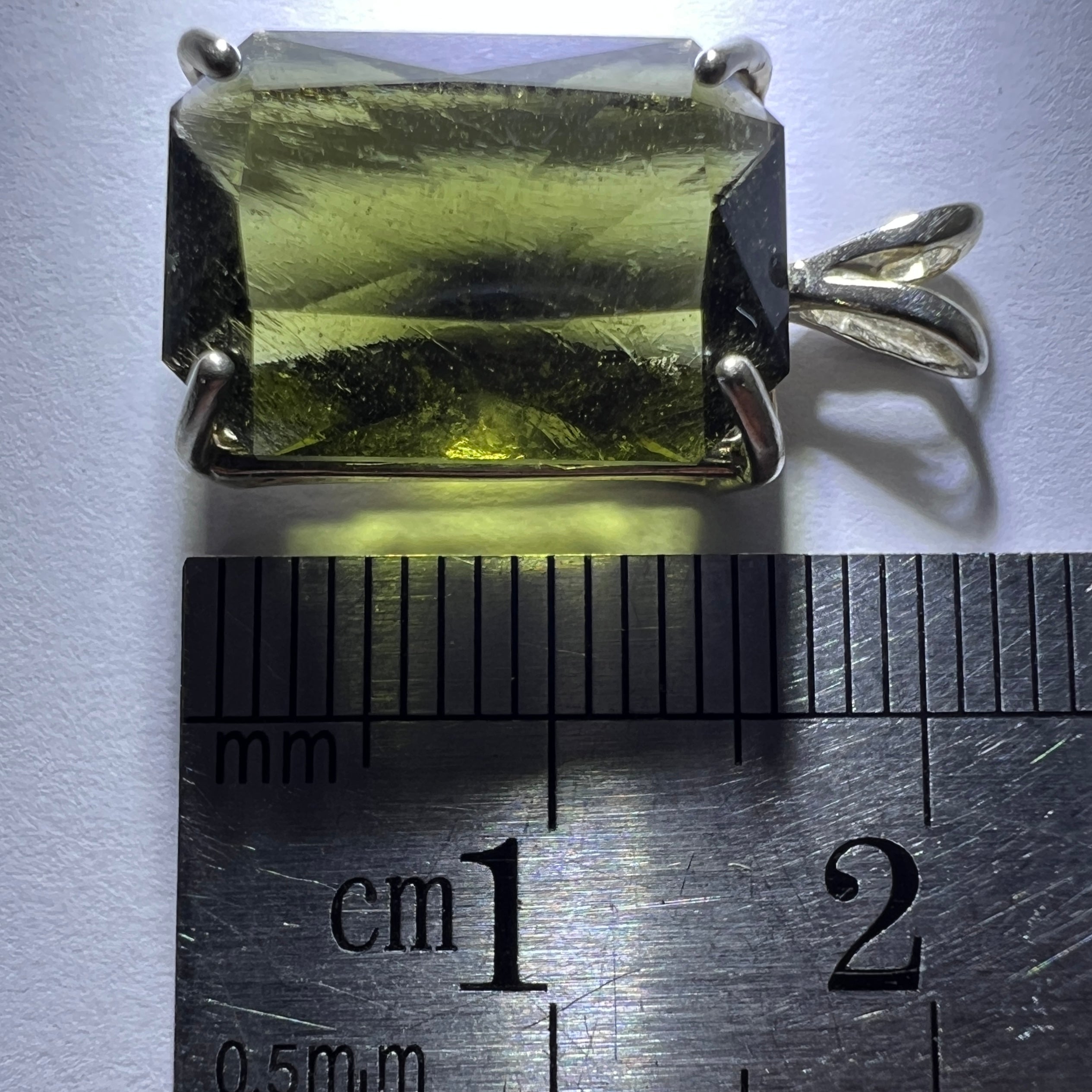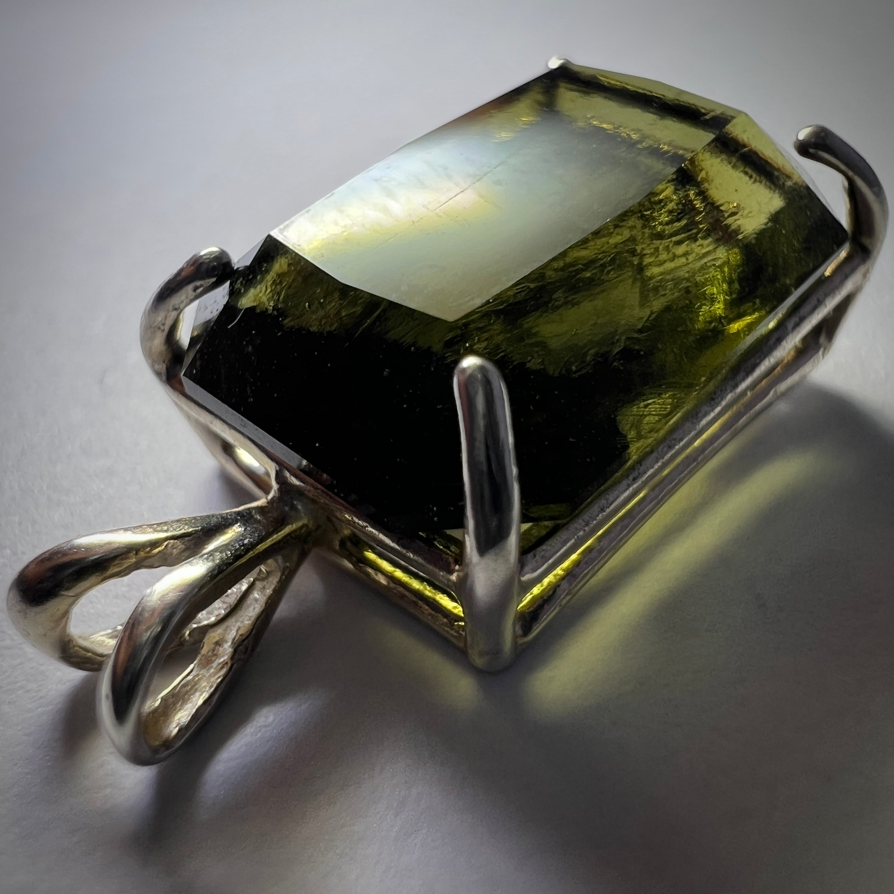 The 7.06ct Moldavite has been expertly cut into a striking emerald design, revealing the depth, brilliance, and natural vibrance of this celestial stone. Set in sterling silver and paired with a hypoallergenic stainless steel chain, it offers both lasting beauty and practical wearability. Handcrafted in the Czech Republic by a renowned father-daughter duo—legends in the Moldavite world for decades—this pendant is a true labor of love. Cut and polished entirely by hand from a larger raw specimen, it features a clean faceted emerald shape that radiates both cosmic power and refined elegance.