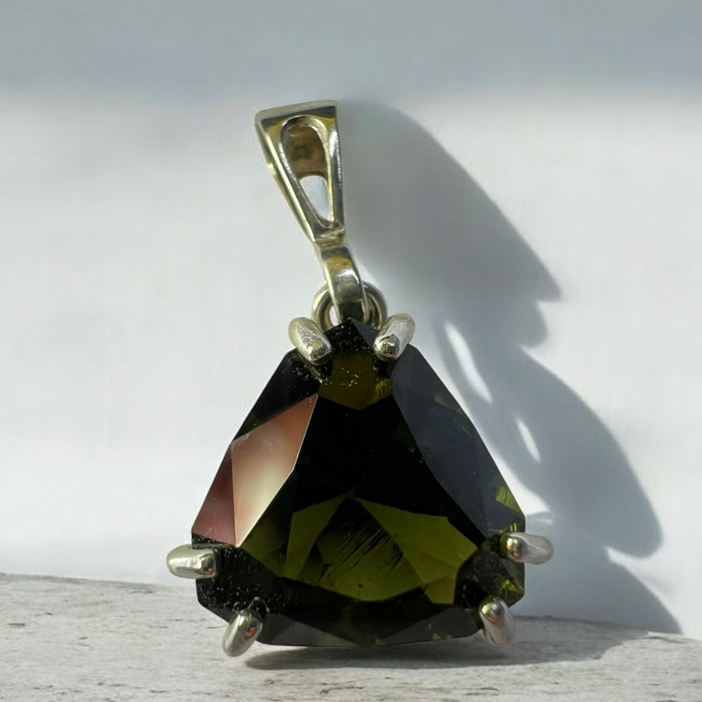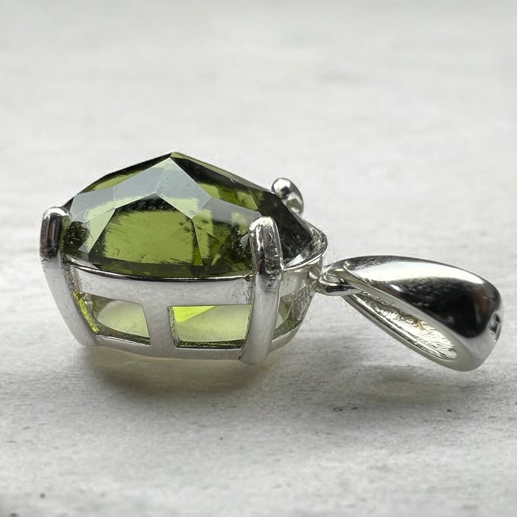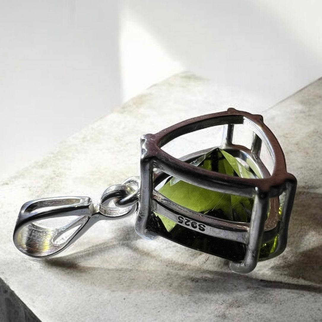 A captivating pendant showcasing a triangle-cut faceted Moldavite, weighing 6.05 ct (12.5 × 12.5 mm).