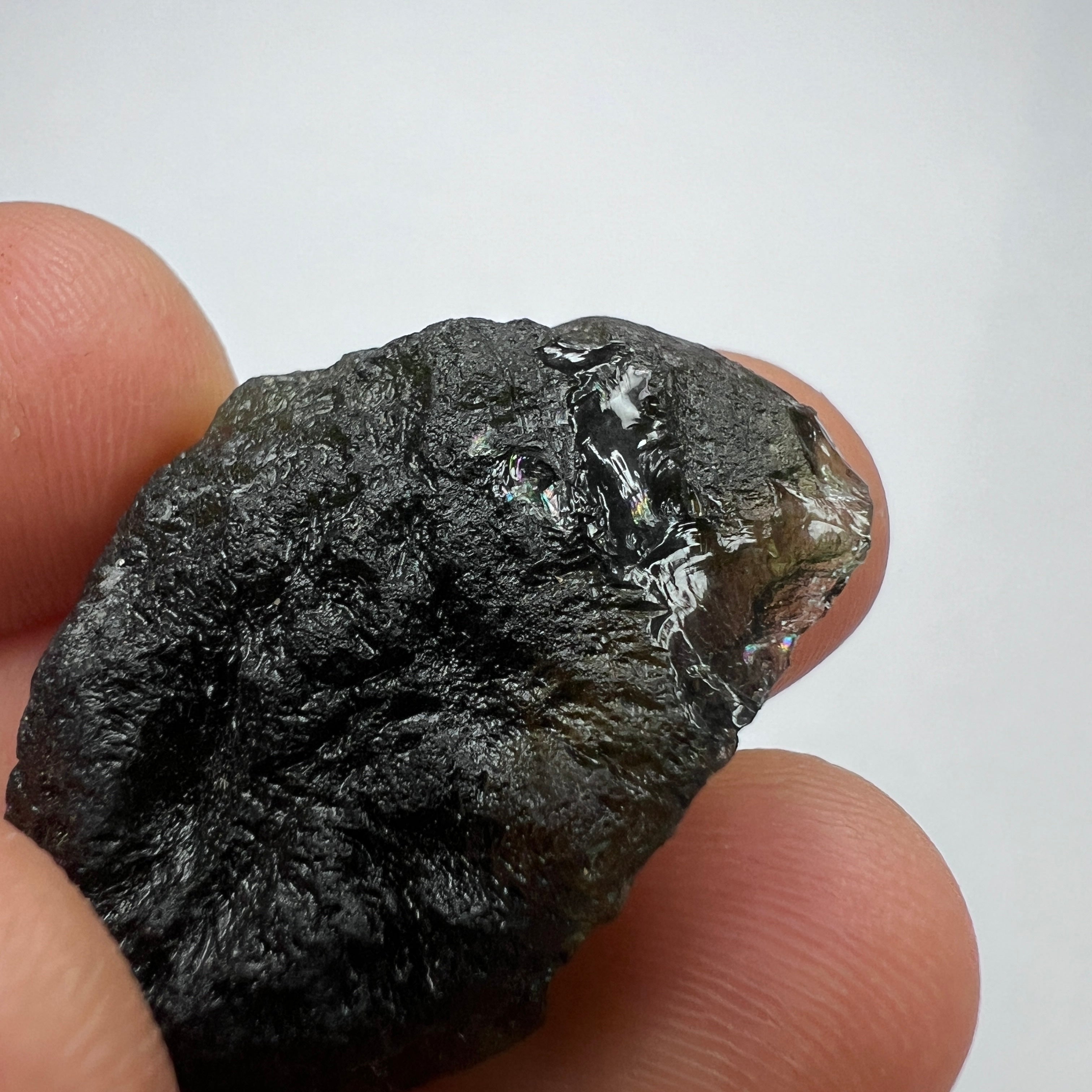 Moldavite is a rare tektite or meteoric glass, caused by an asteroid impact 15mil. years ago. The intense, 10,000°c+ temperatures of the strike vapourised the asteroid, target rock and sand, flinging the molten substance high into the atmosphere.
