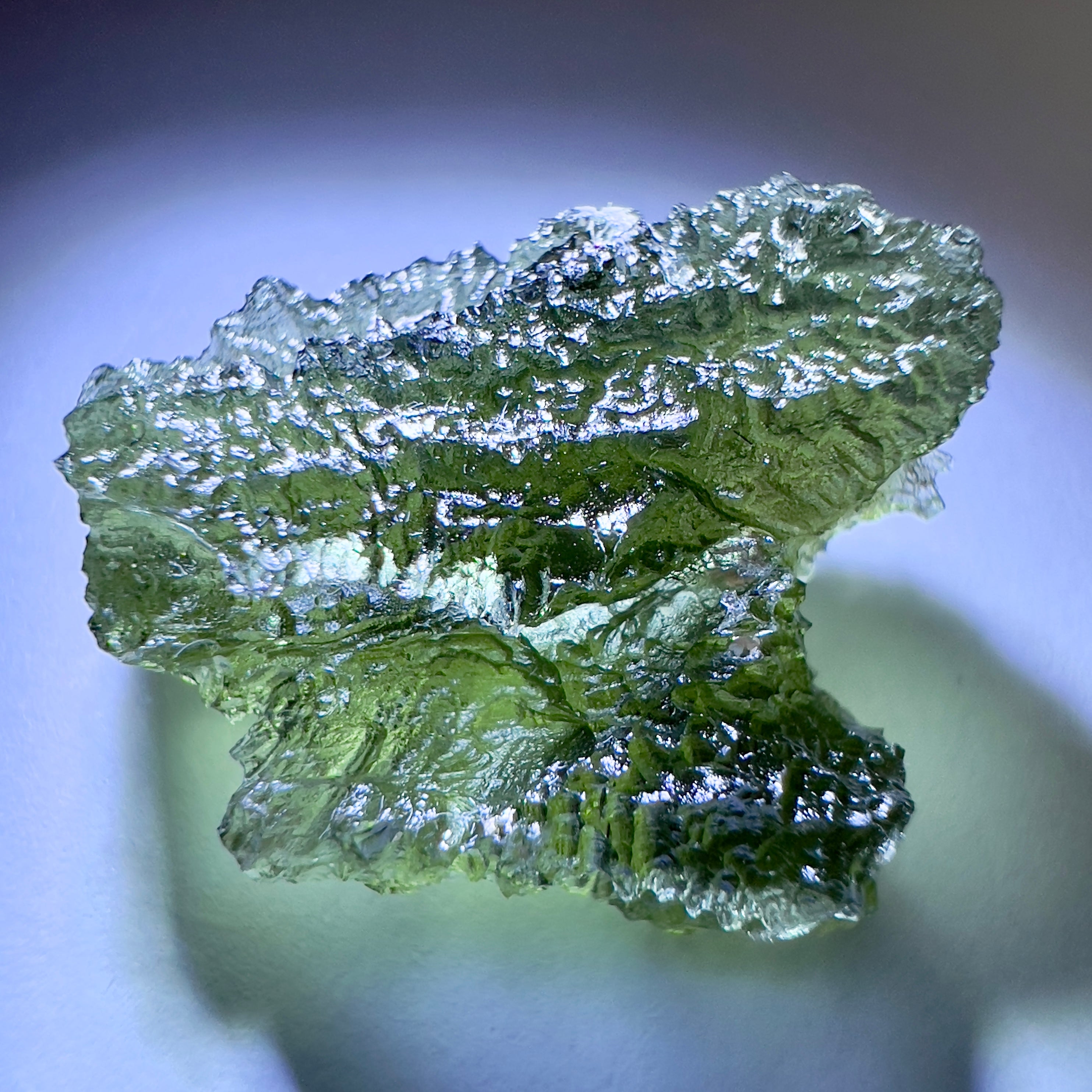 Moldavite is a rare tektite or meteoric glass, caused by an asteroid impact 15mil. years ago. The intense, 10,000°c+ temperatures of the strike vapourised the asteroid, target rock and sand, flinging the molten substance high into the atmosphere.