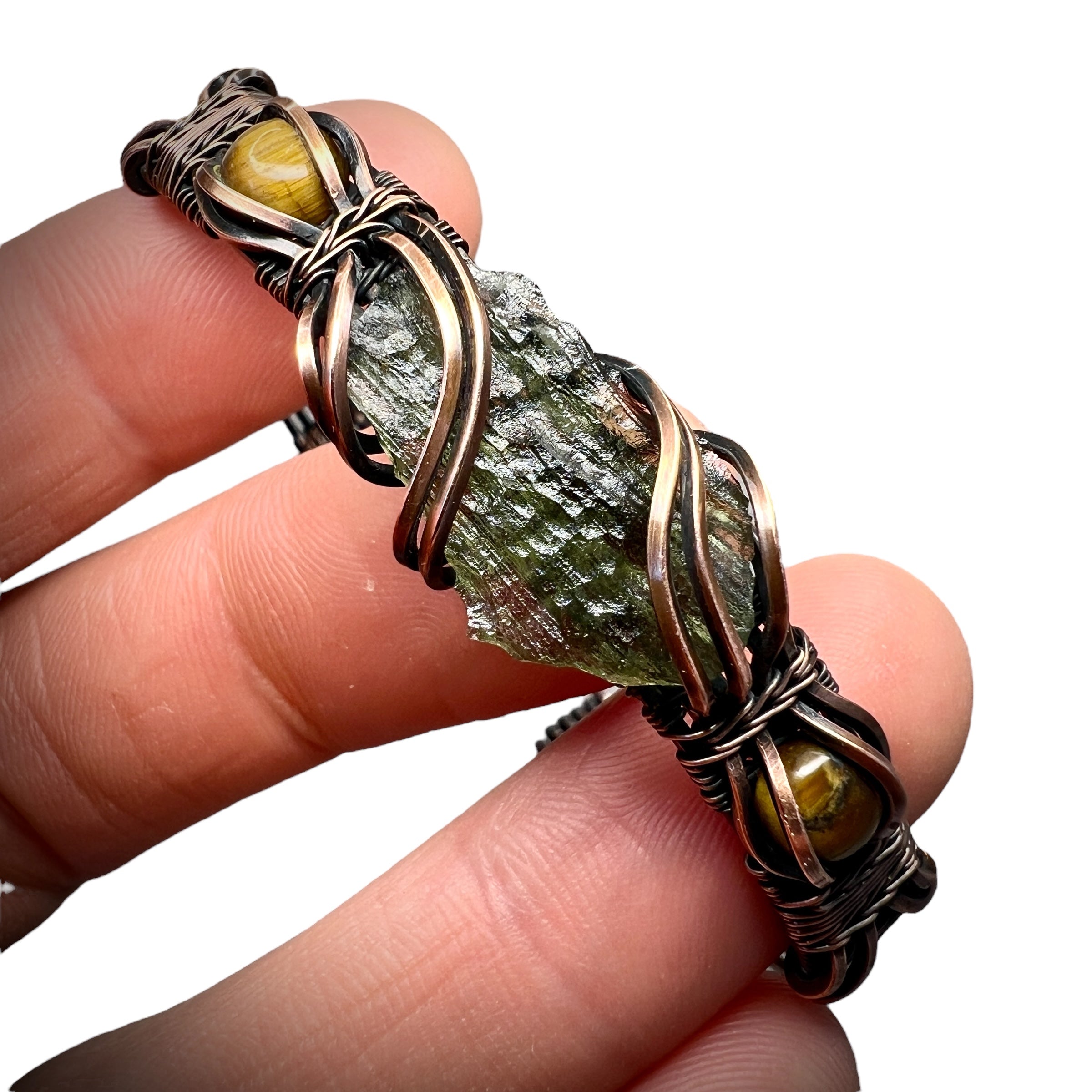 This adjustable copper bracelet features a 1.2g Moldavite from Chlum, beautifully accented with mesmerising tiger's eye stones.