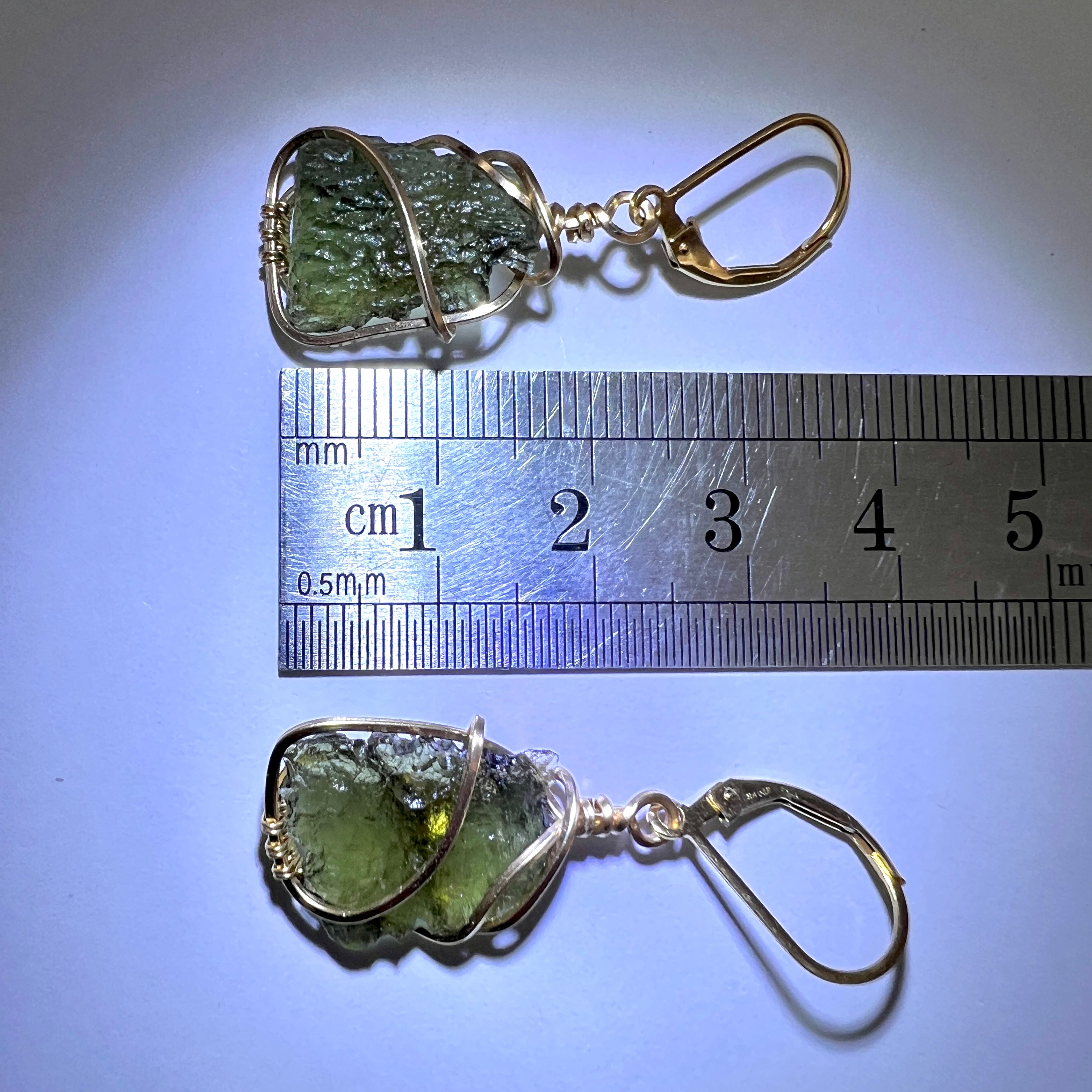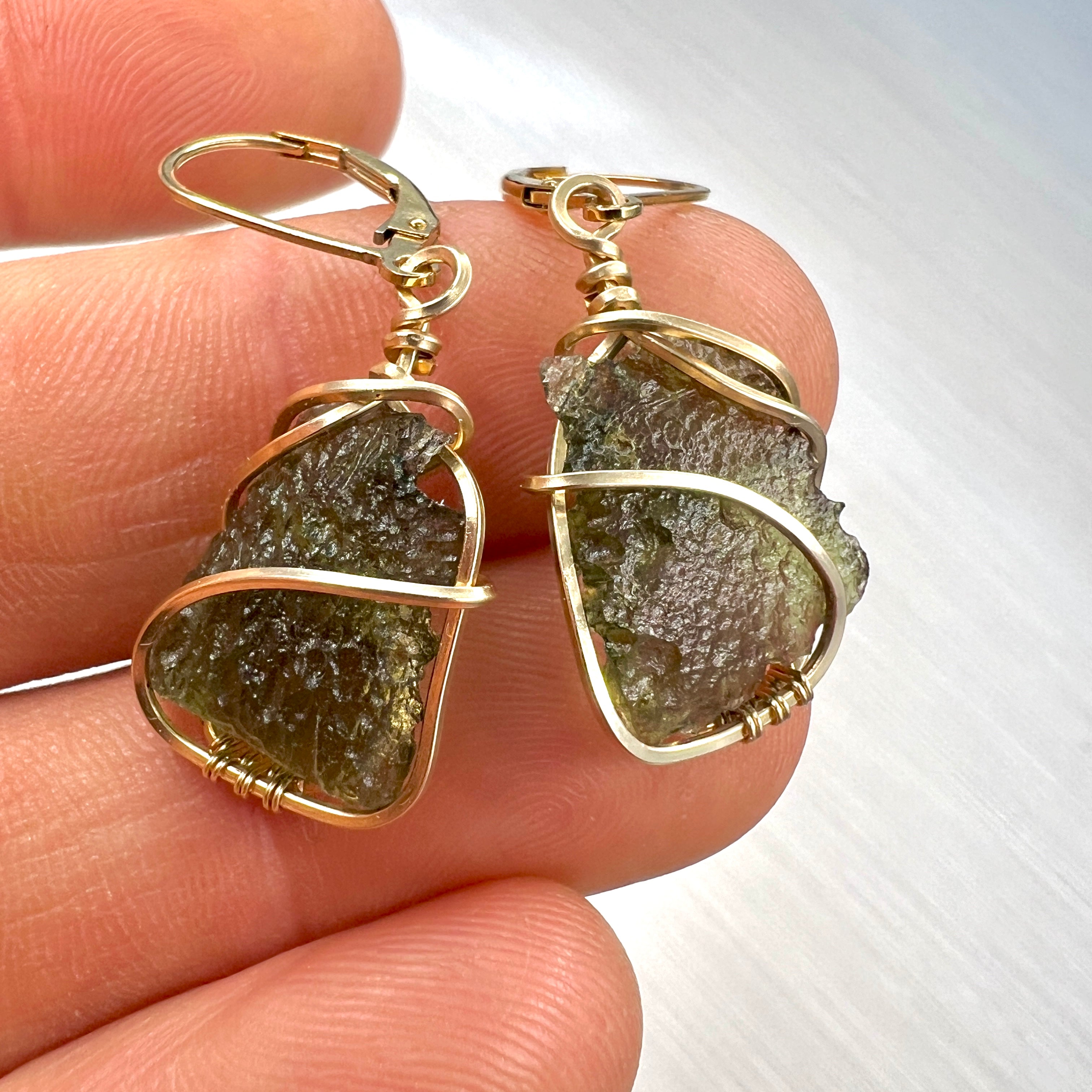 A stunning pair of Moldavite earrings, each featuring hand-selected, closely matched specimens from the famed Chlum locality — weighing just 0.23 grams apart (1.08g & 0.85g). These rare twins are wrapped delicately in 14k gold fill, allowing their natural shape and vibrant green glow to speak for themselves.