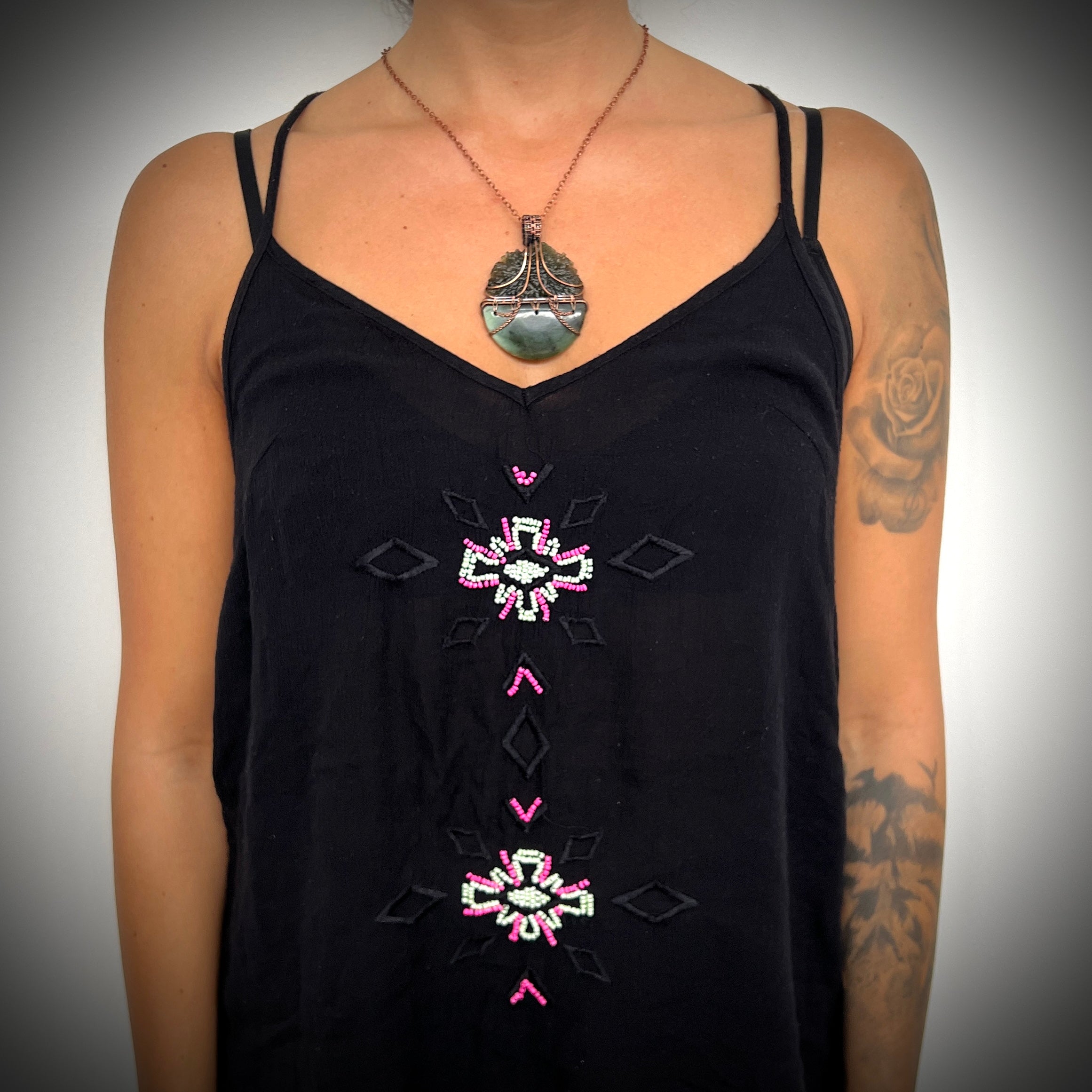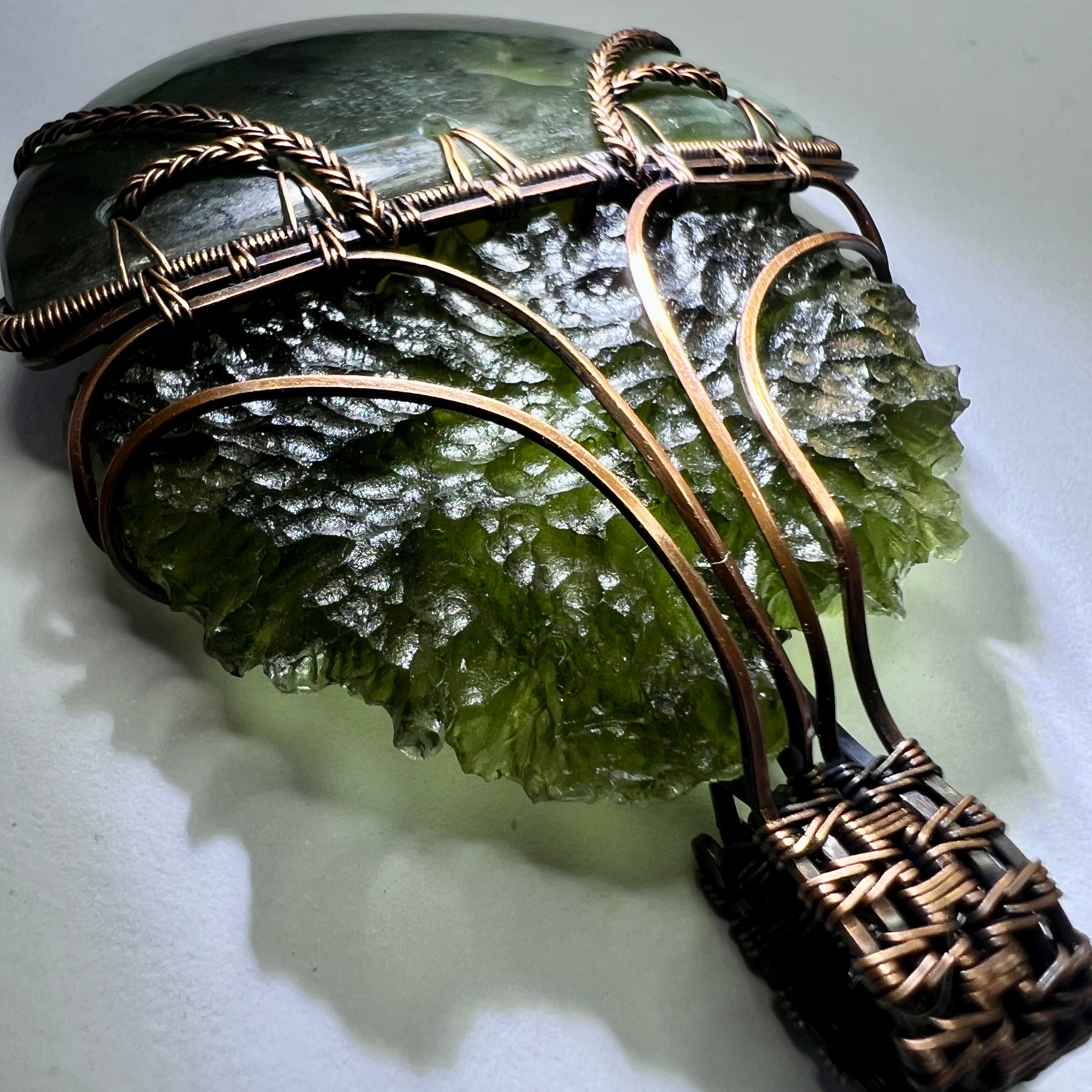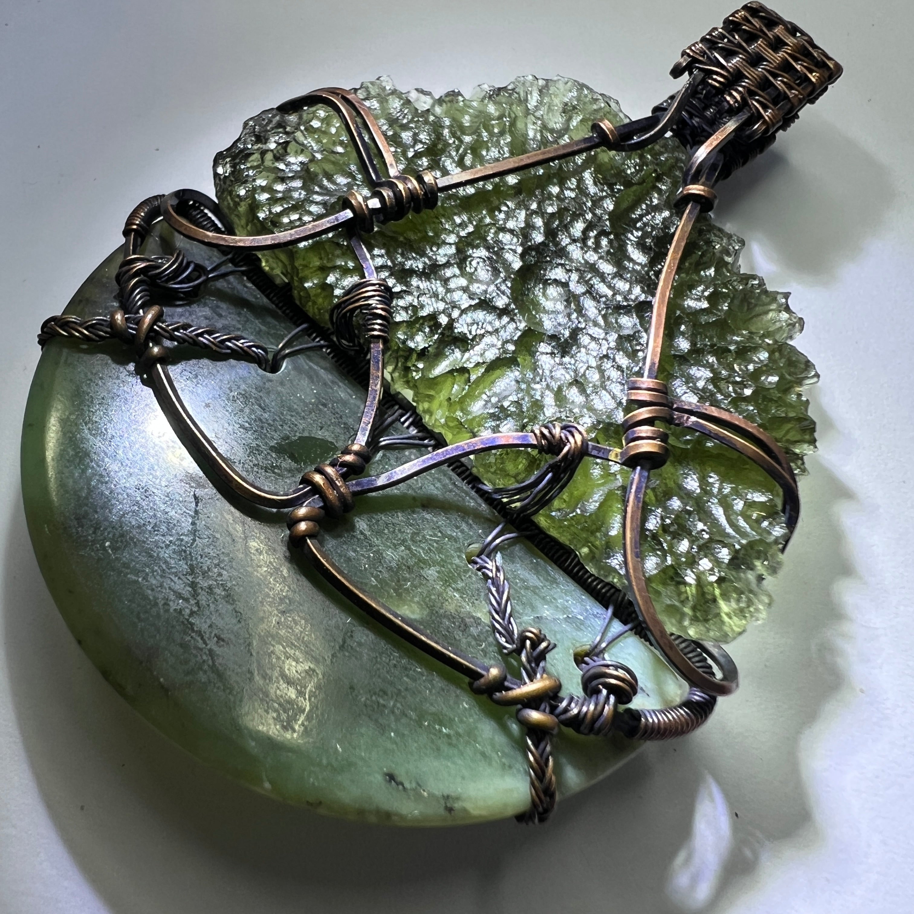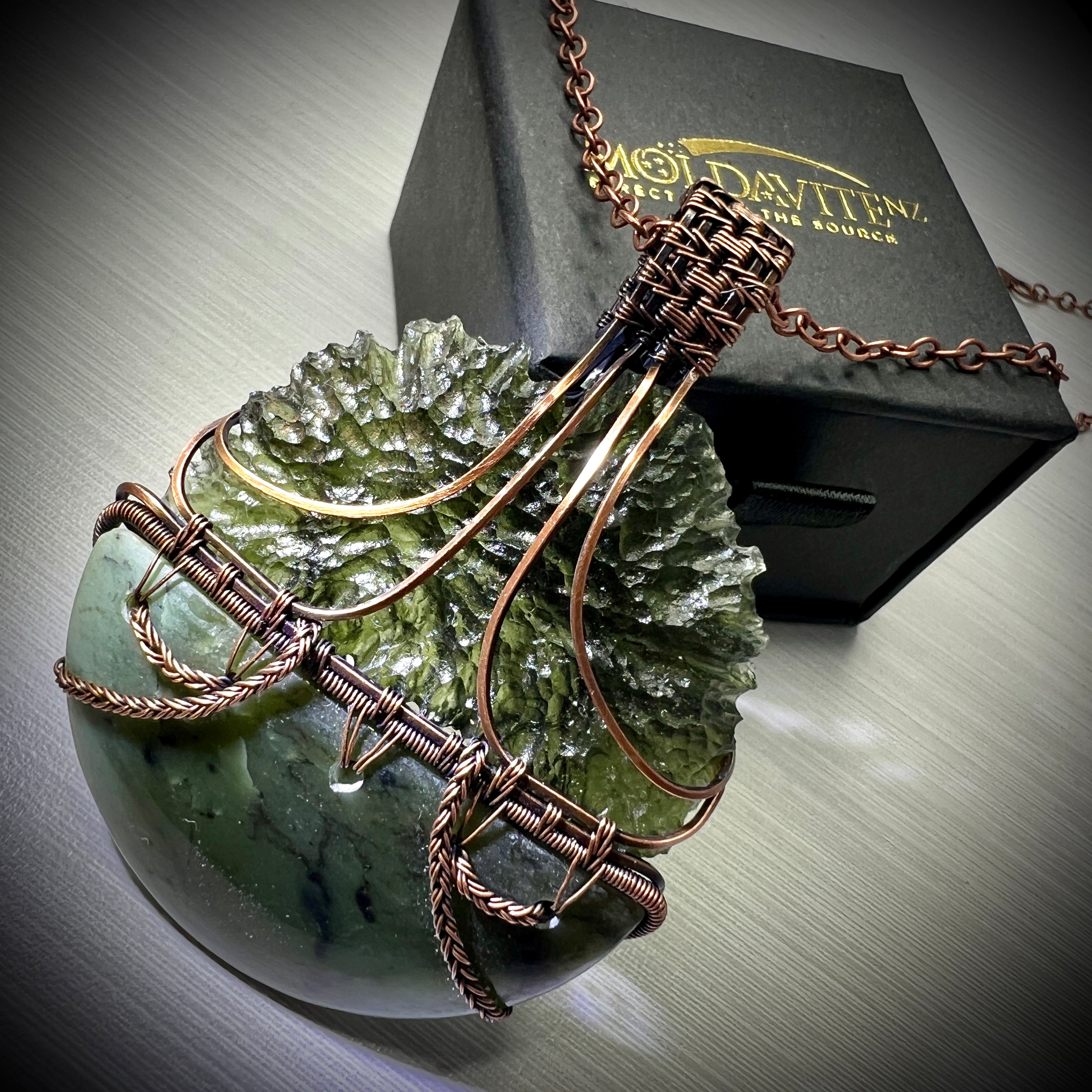 To bind these two worlds into one statement piece, we chose antiqued copper wire wrap, grounding and elemental, uniting both stones while preserving their raw, ancestral character. The result is a truly monumental artefact—symbolic, balanced, and utterly unique.