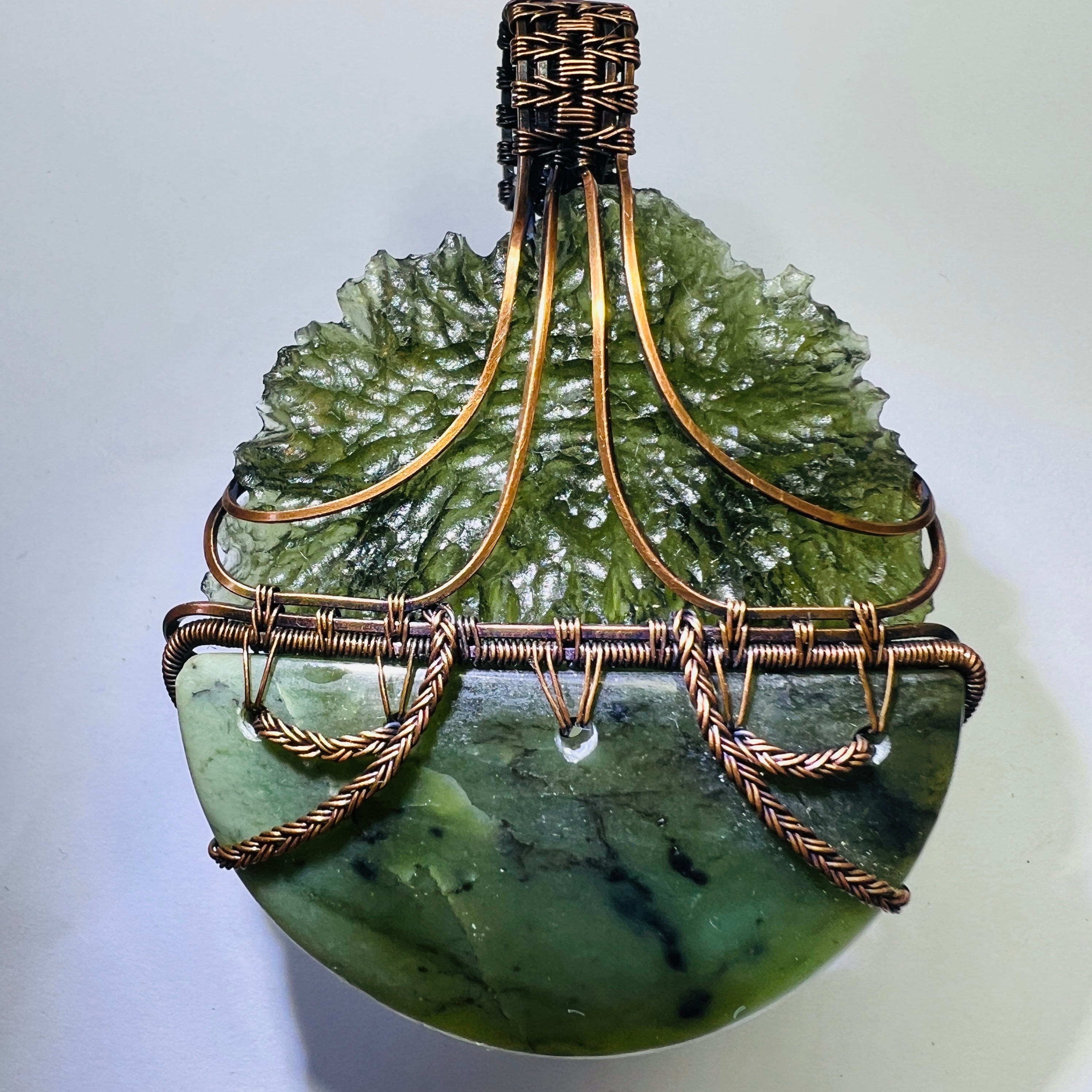 Energetically, the pairing makes perfect sense: Pounamu is grounding, steady, and deeply connected to whakapapa and the land. Moldavite is catalytic, fast-moving, and transformative. One stabilises; the other accelerates. Aesthetically, their natural greens, textures, and histories complement one another so strongly that it feels almost inevitable to unite them.
