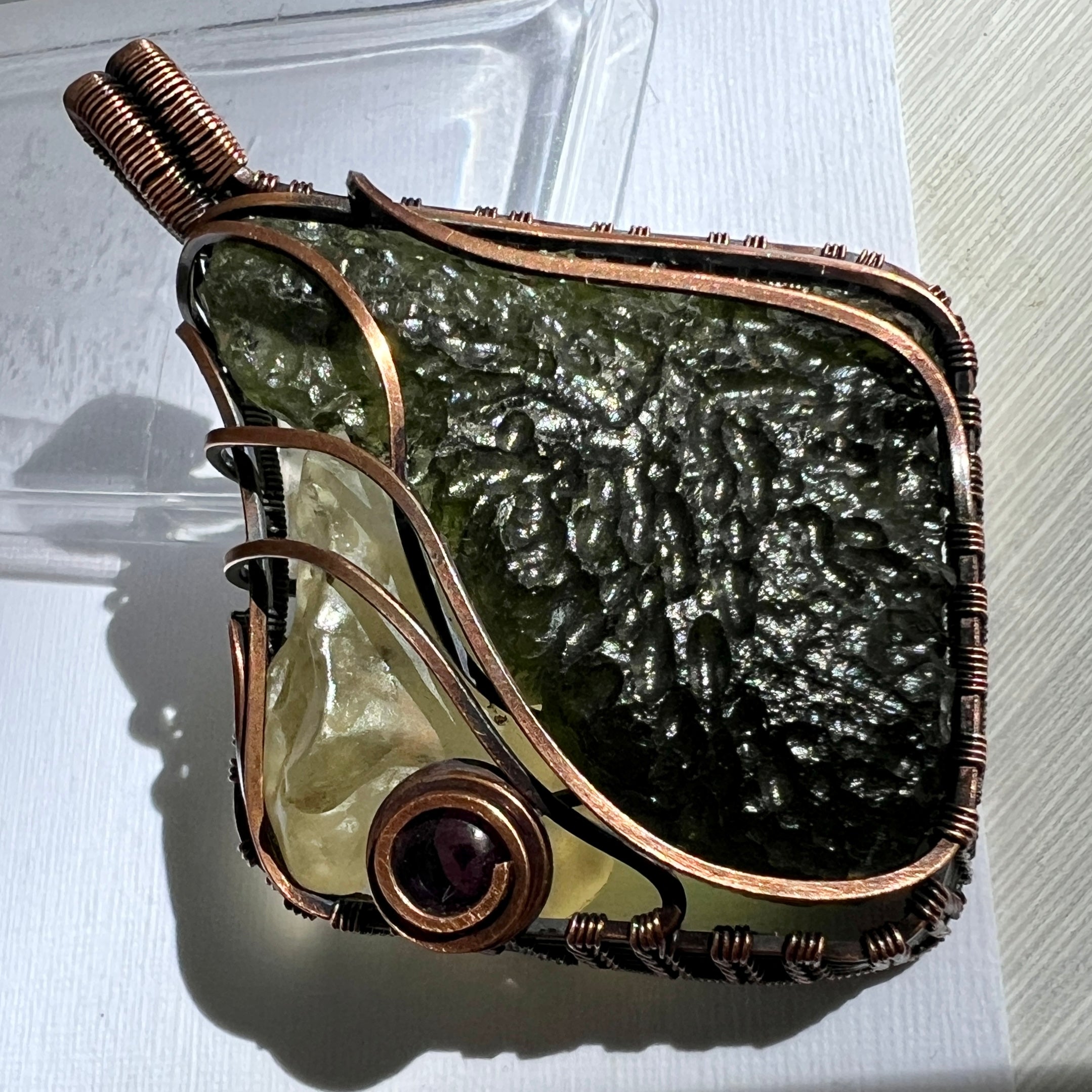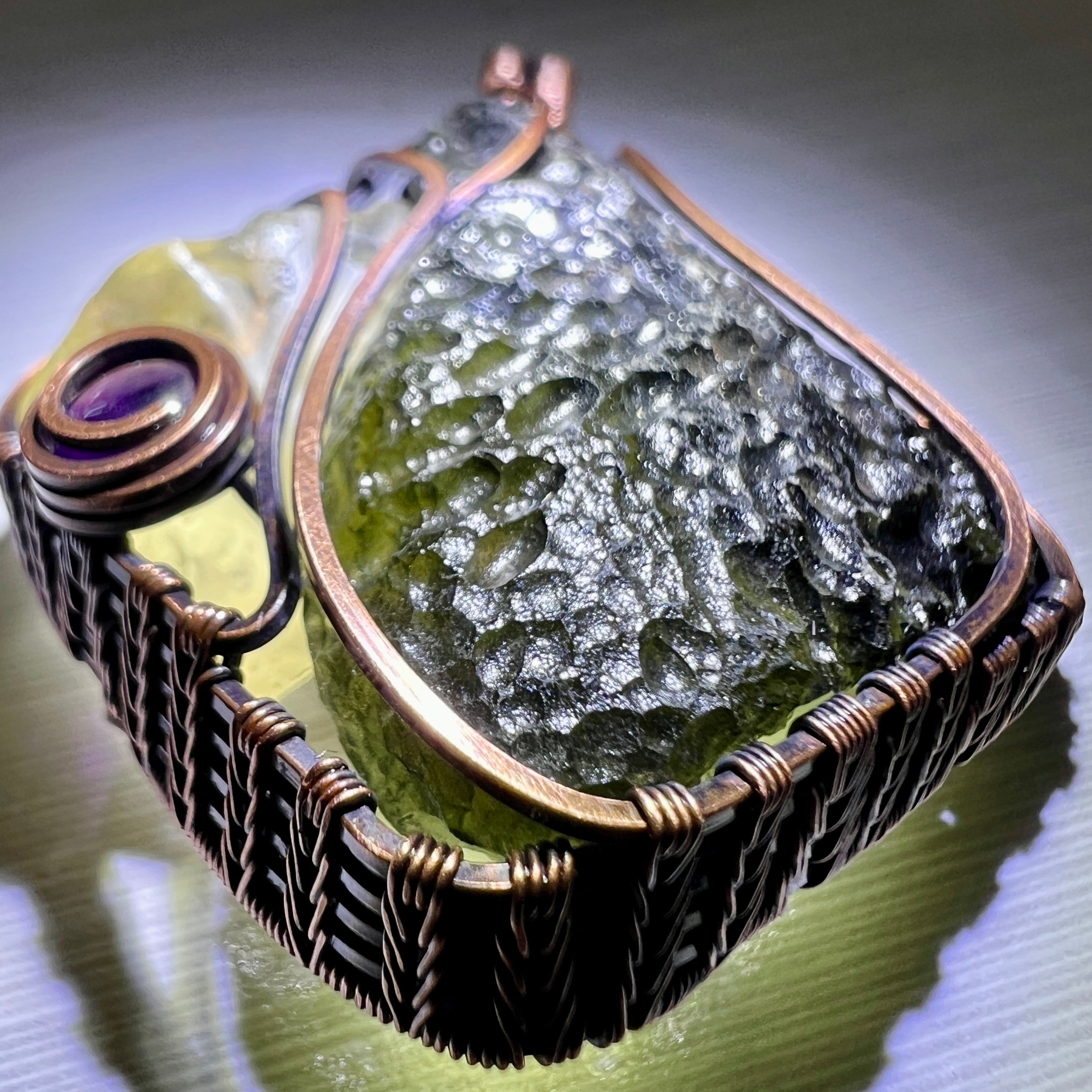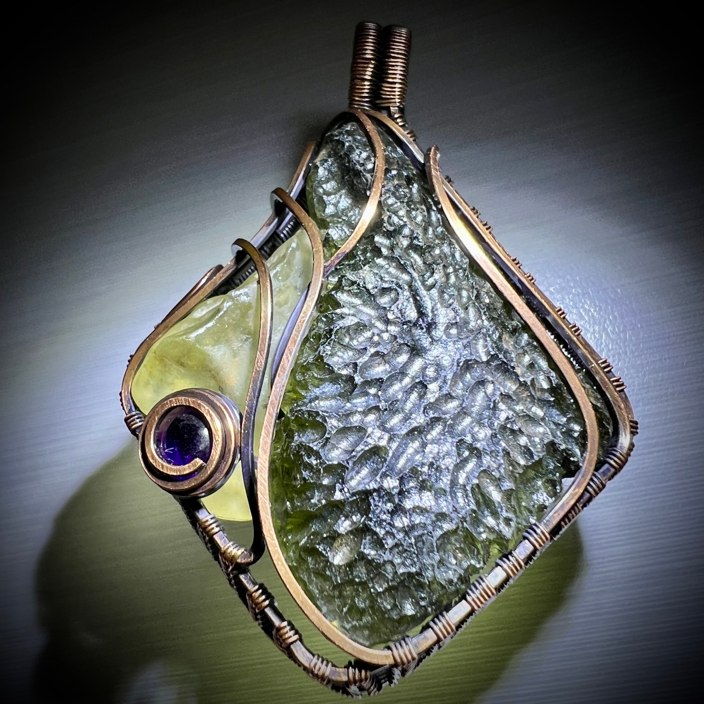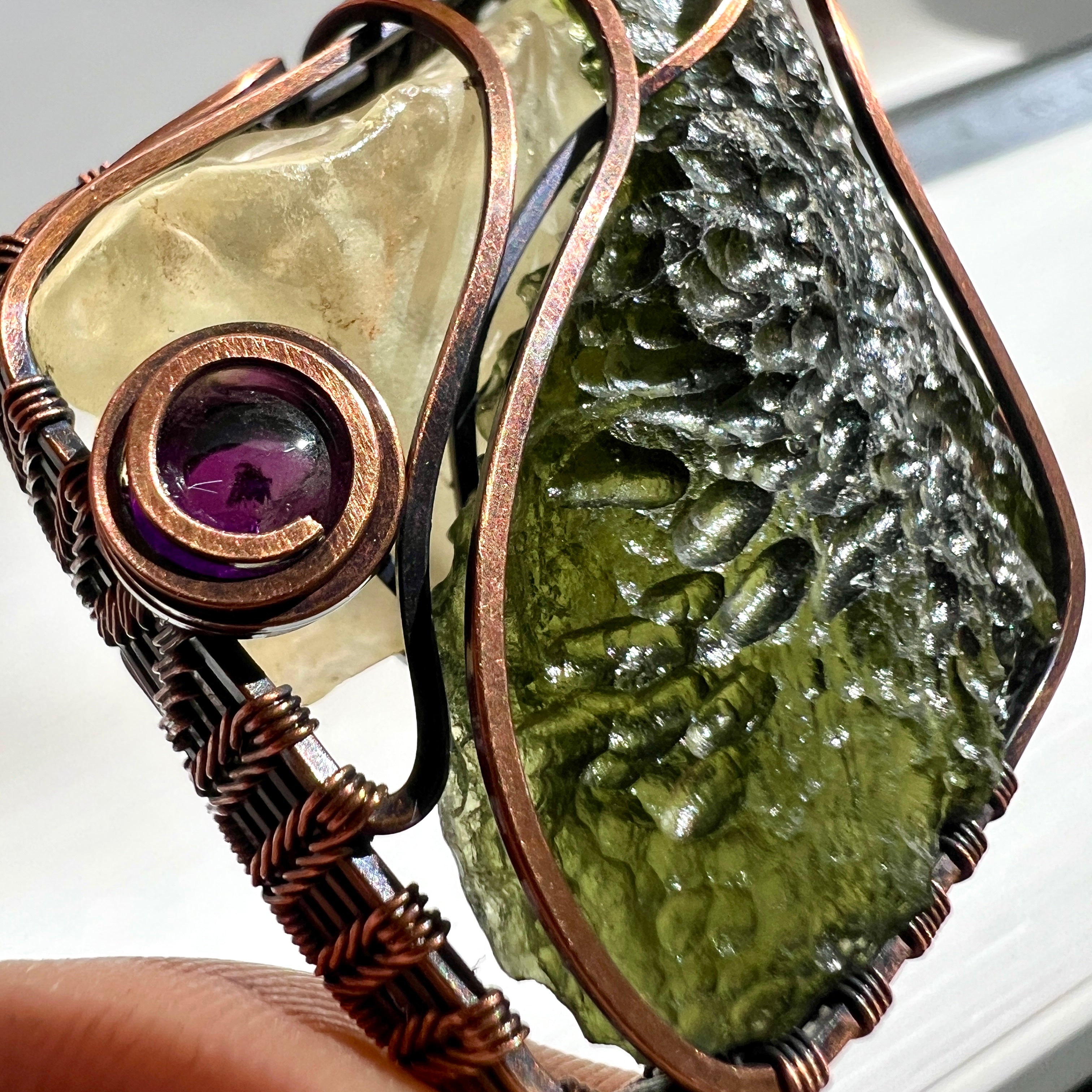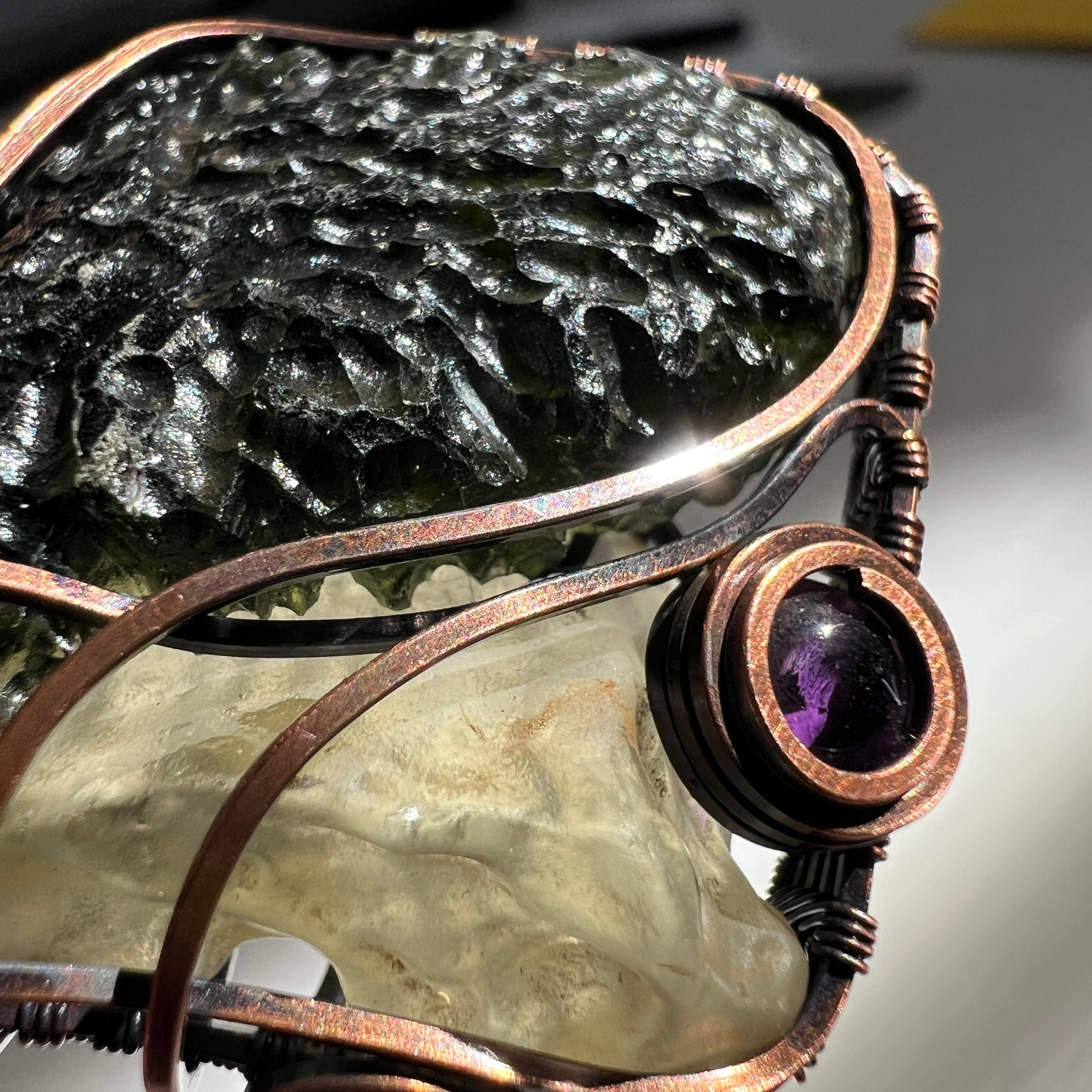 Materials: Antiqued copper, Moldavite (11.2 g Maly Chlum), Amethyst, Libyan Desert Glass