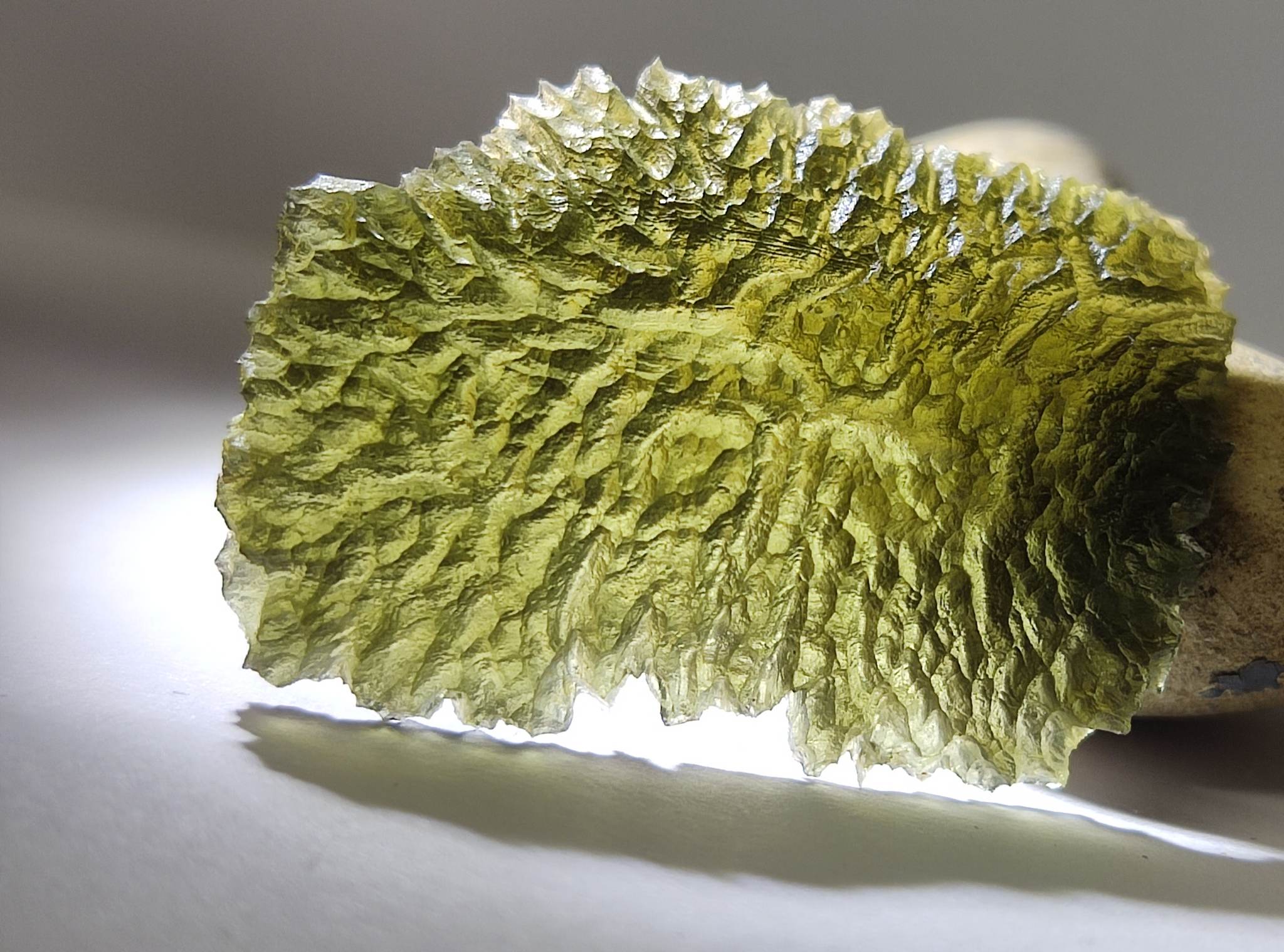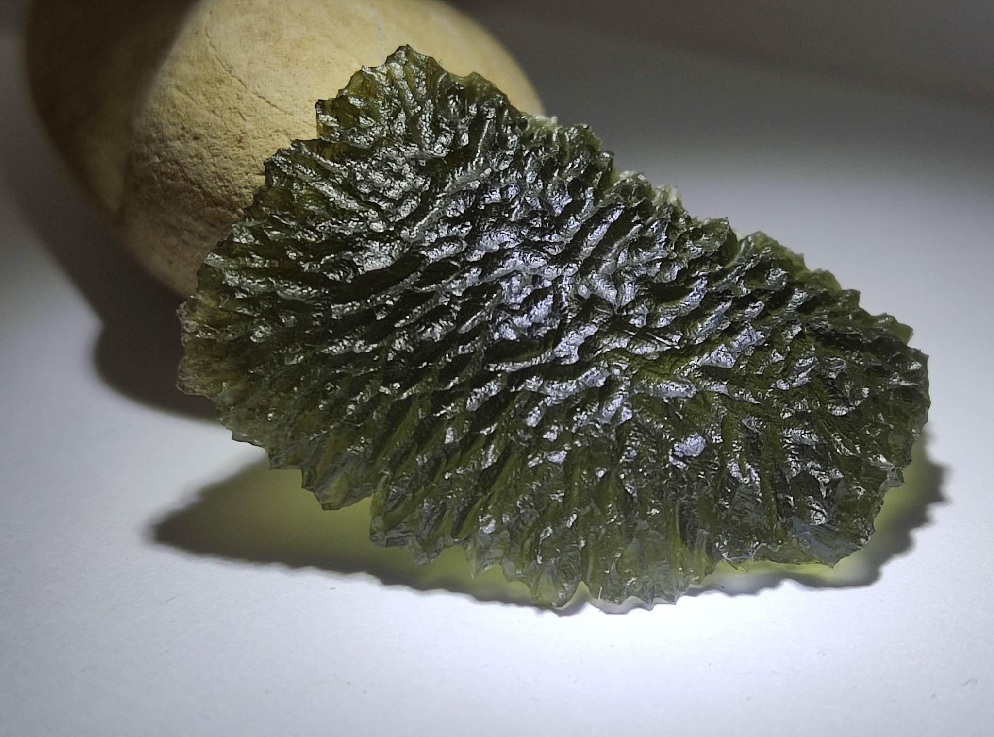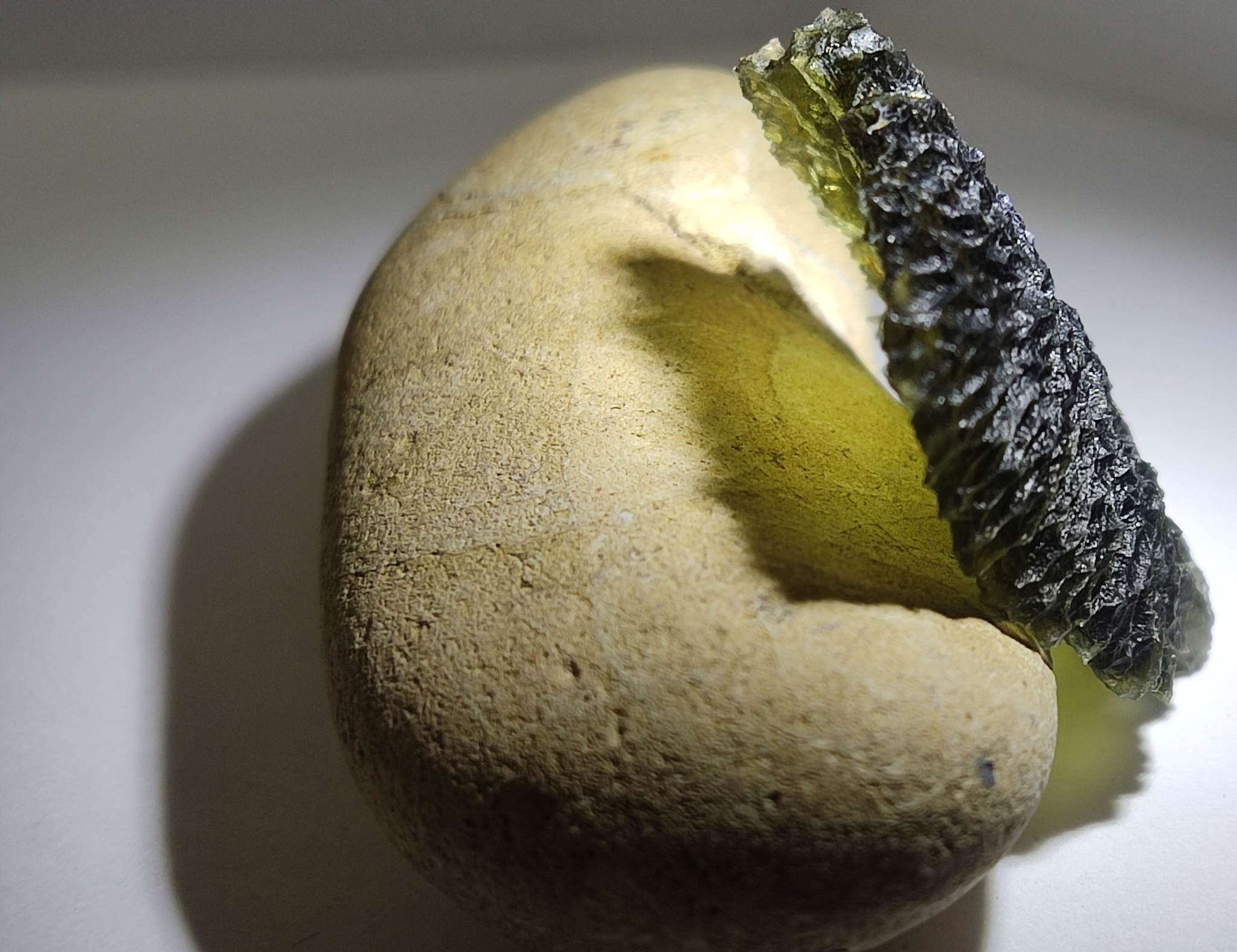 Moldavite is a rare tektite or meteoric glass, caused by an asteroid impact 15mil. years ago. The intense, 10,000°c+ temperatures of the strike vapourised the asteroid, target rock and sand, flinging the molten substance high into the atmosphere.