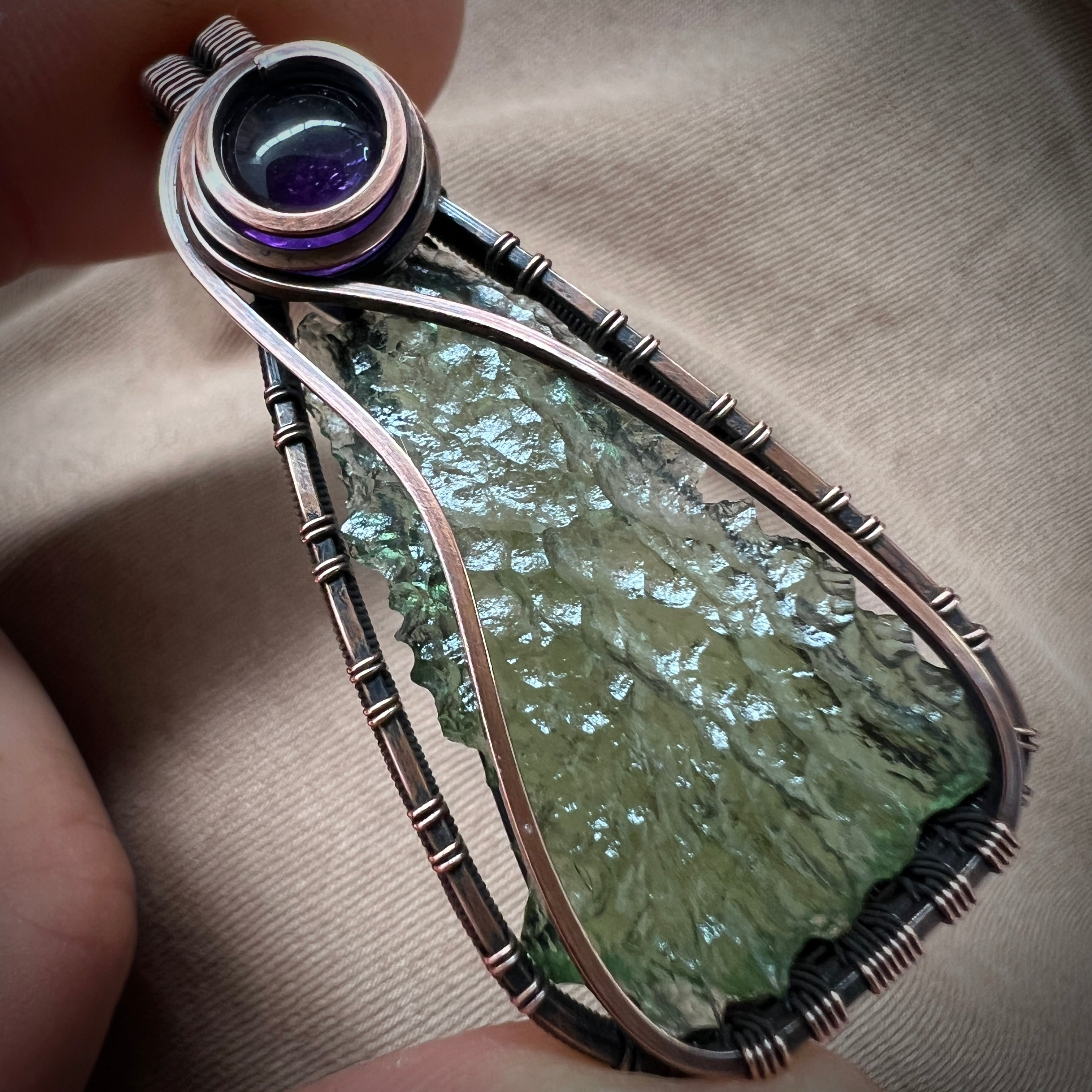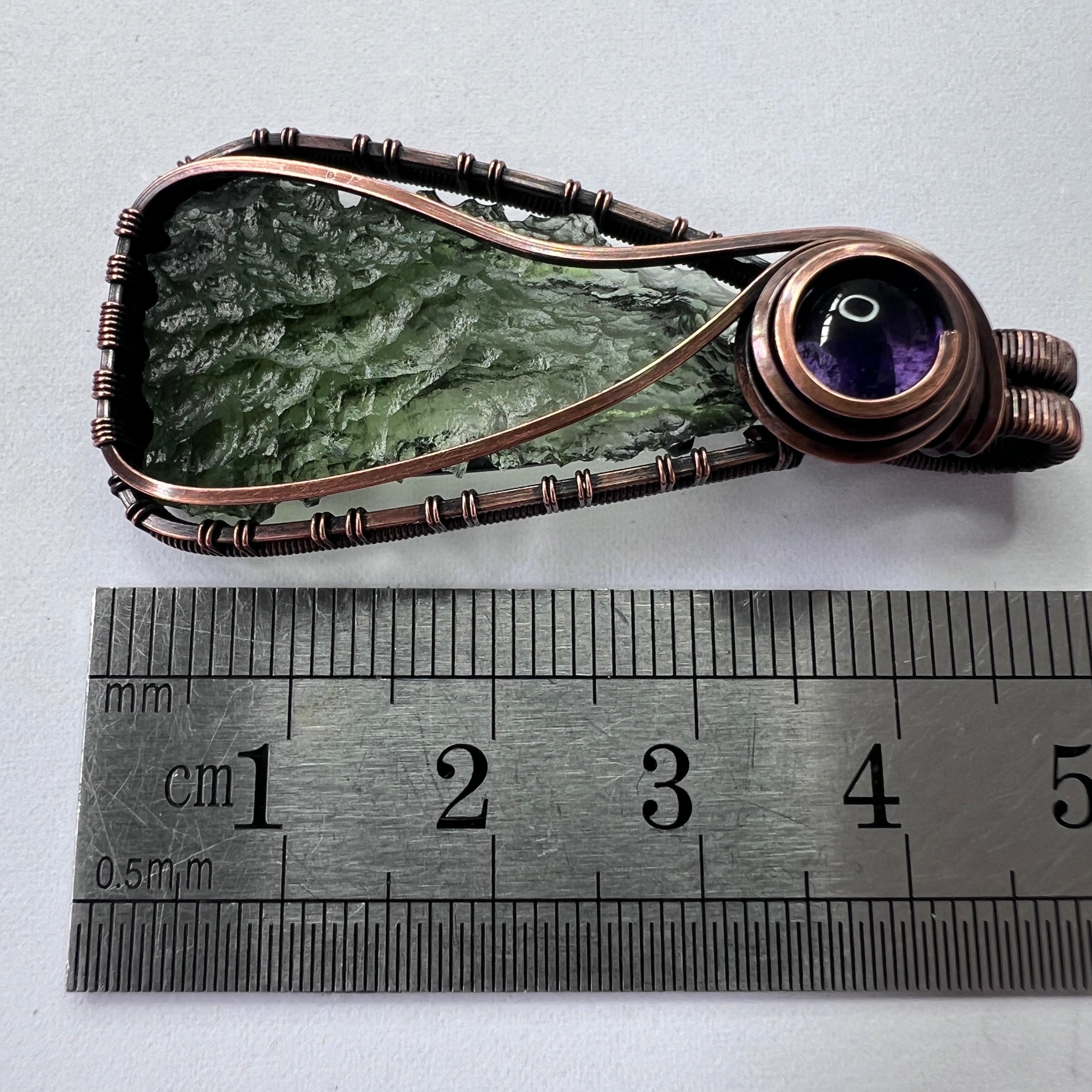 Hand wrapped in antiqued copper, this Moldavite & Amethyst pendant features a beautifully textured Moldavite weighing 2.39 grams, paired with the rich violet tones of Amethyst. The deep green of the Moldavite contrasts elegantly with the calming purple hues, while the copper wrap adds warmth and an old-world charm to the overall design.