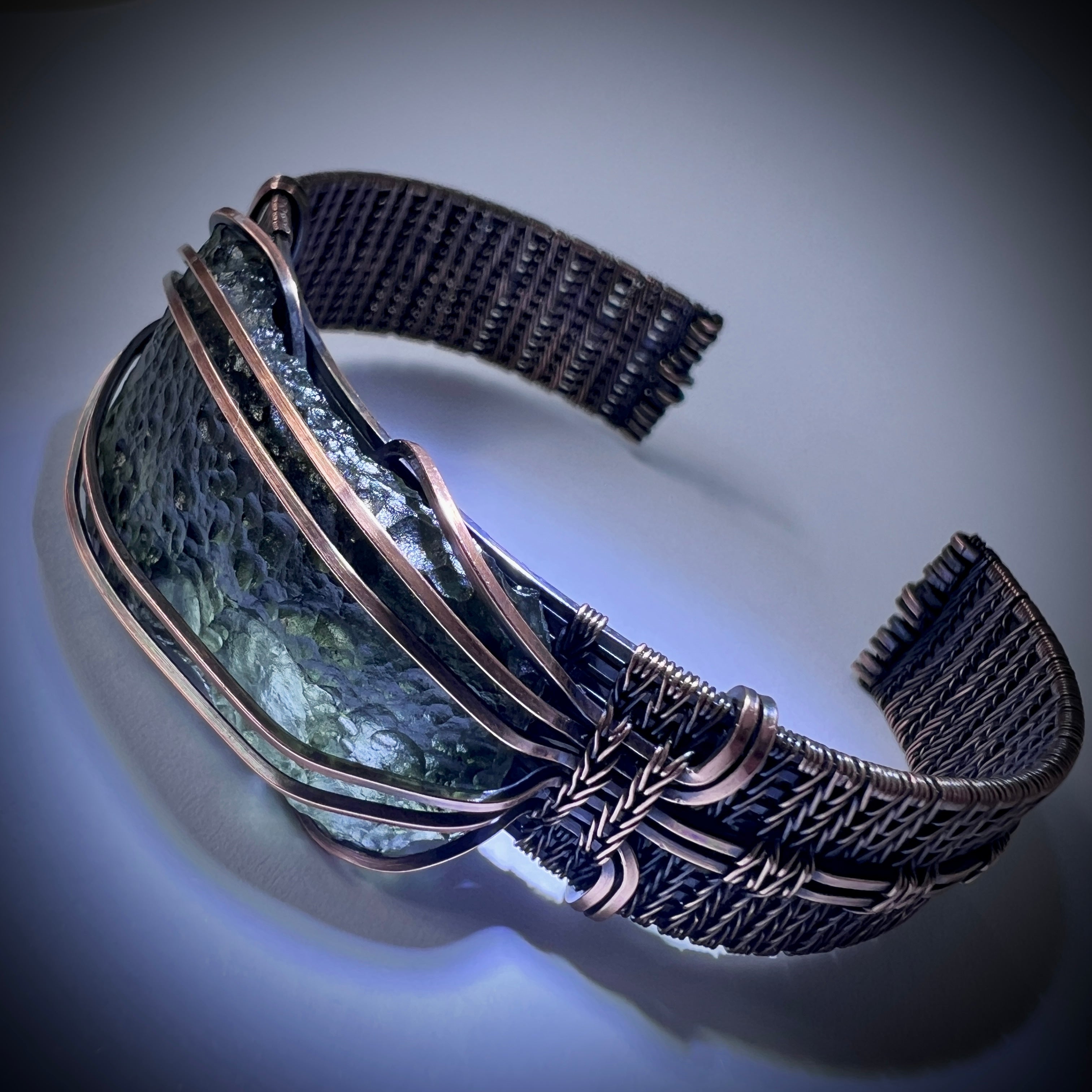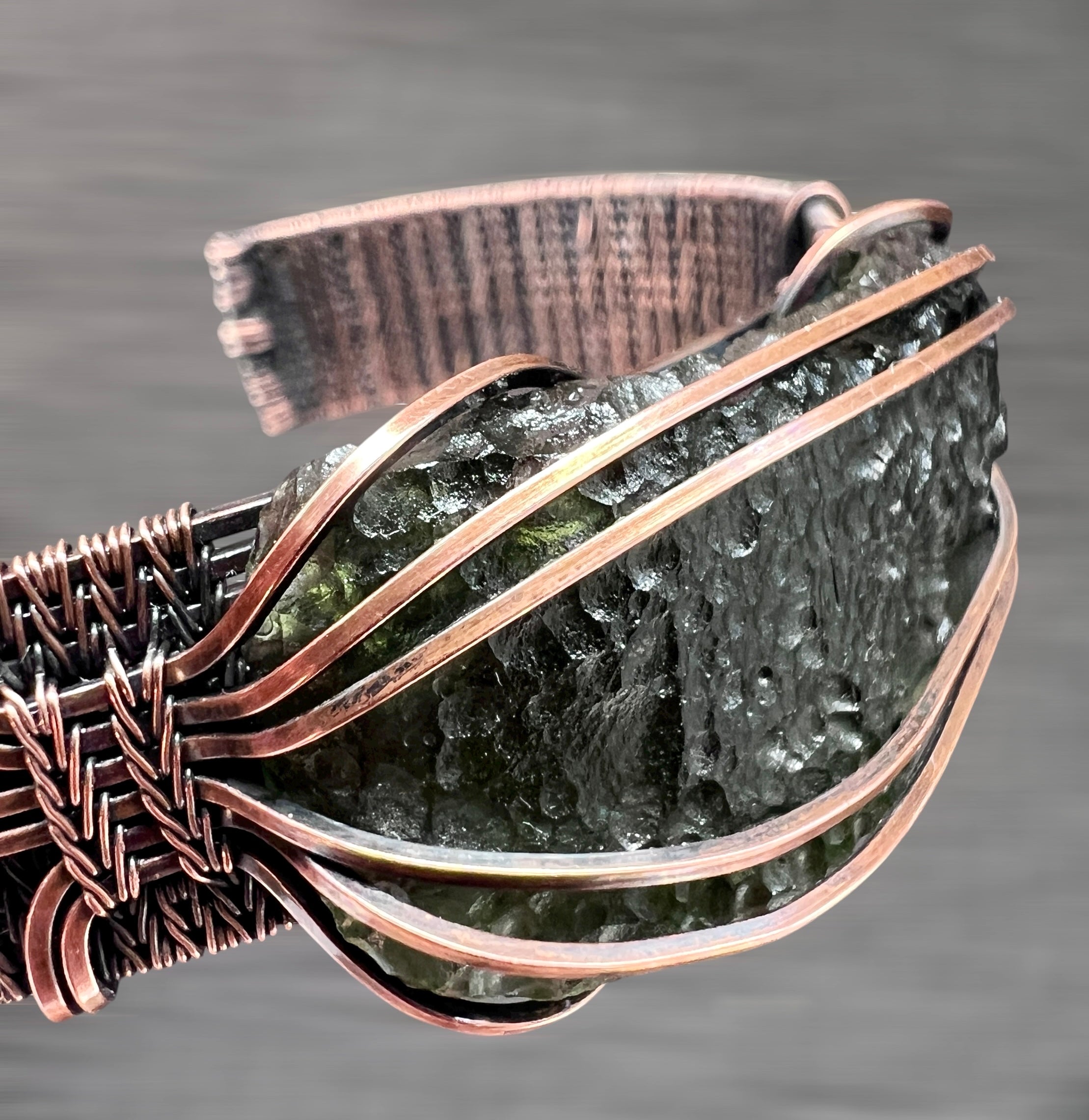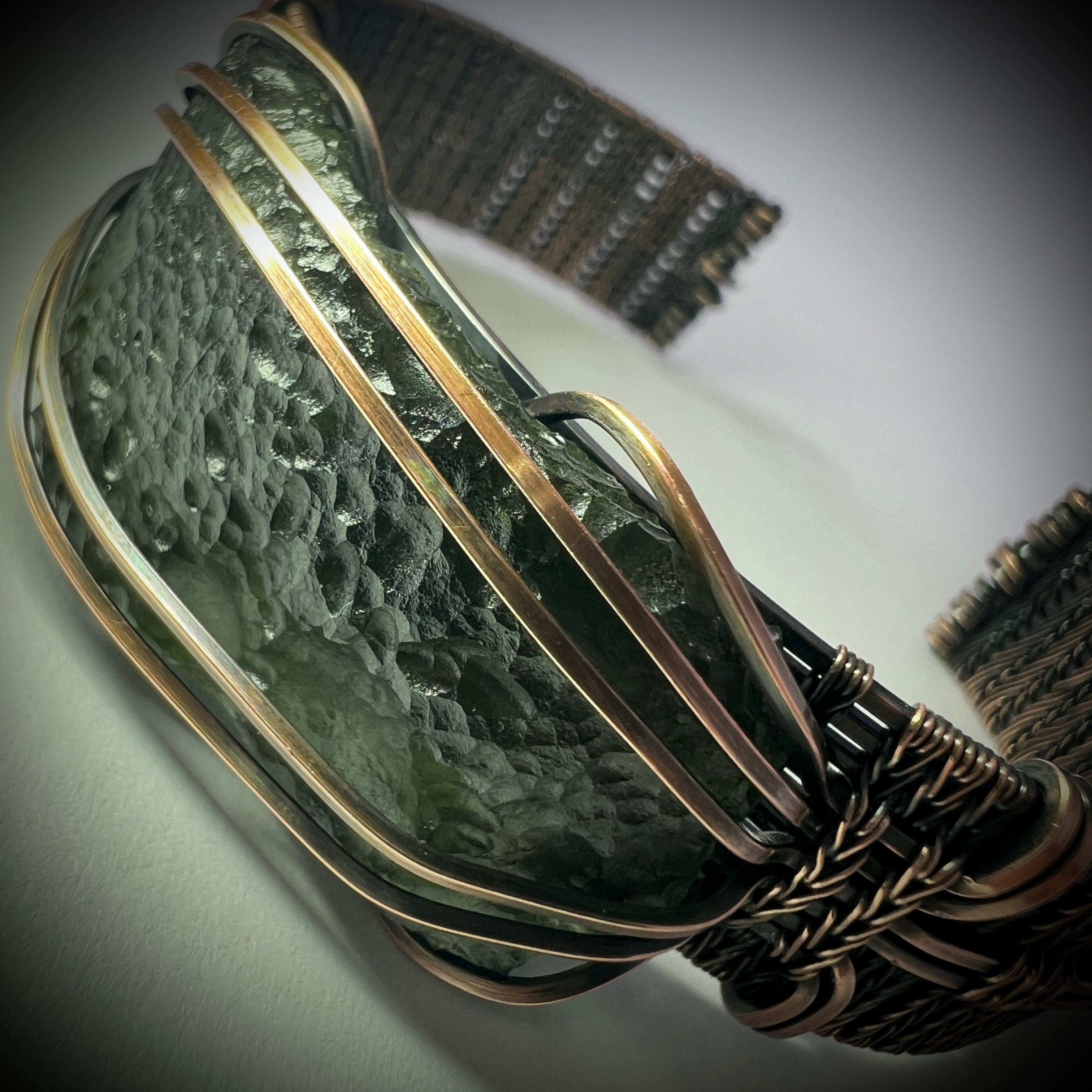 Exquisite Moldavite Bracelet — Handwoven in Antiqued Copper