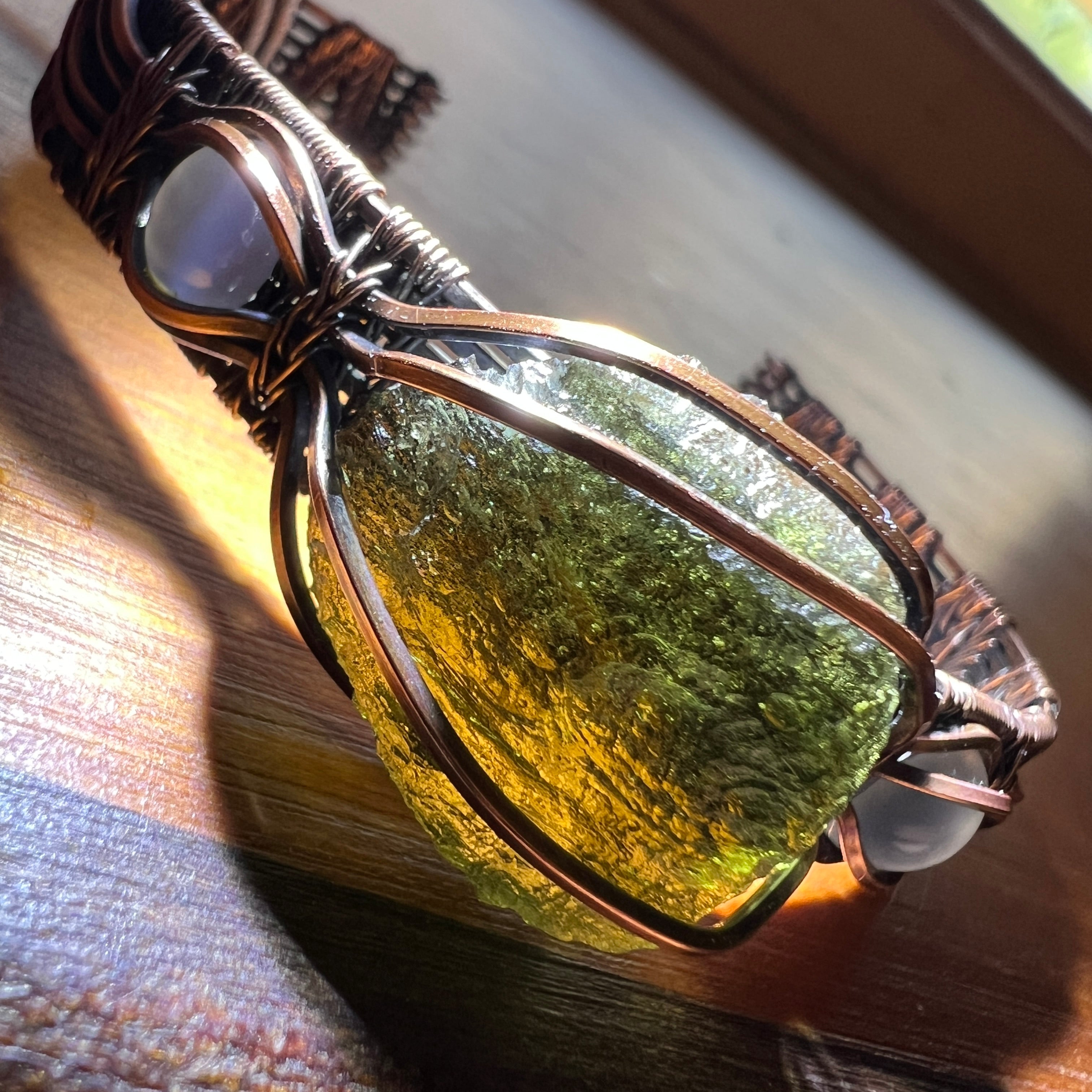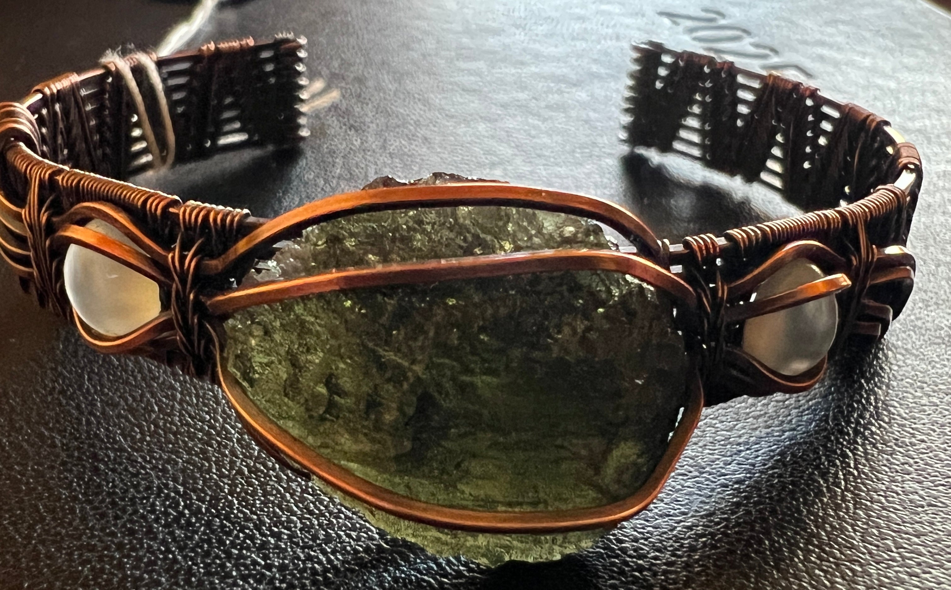 This exclusive Moldavite bracelet features a genuine 2.8g Moldavite specimen from Chlum. Crafted in antiqued copper with added moonstone accent stones on either side of the Moldavite. This adjustable bracelet is currently sized at approximately 19 cm in circumference.