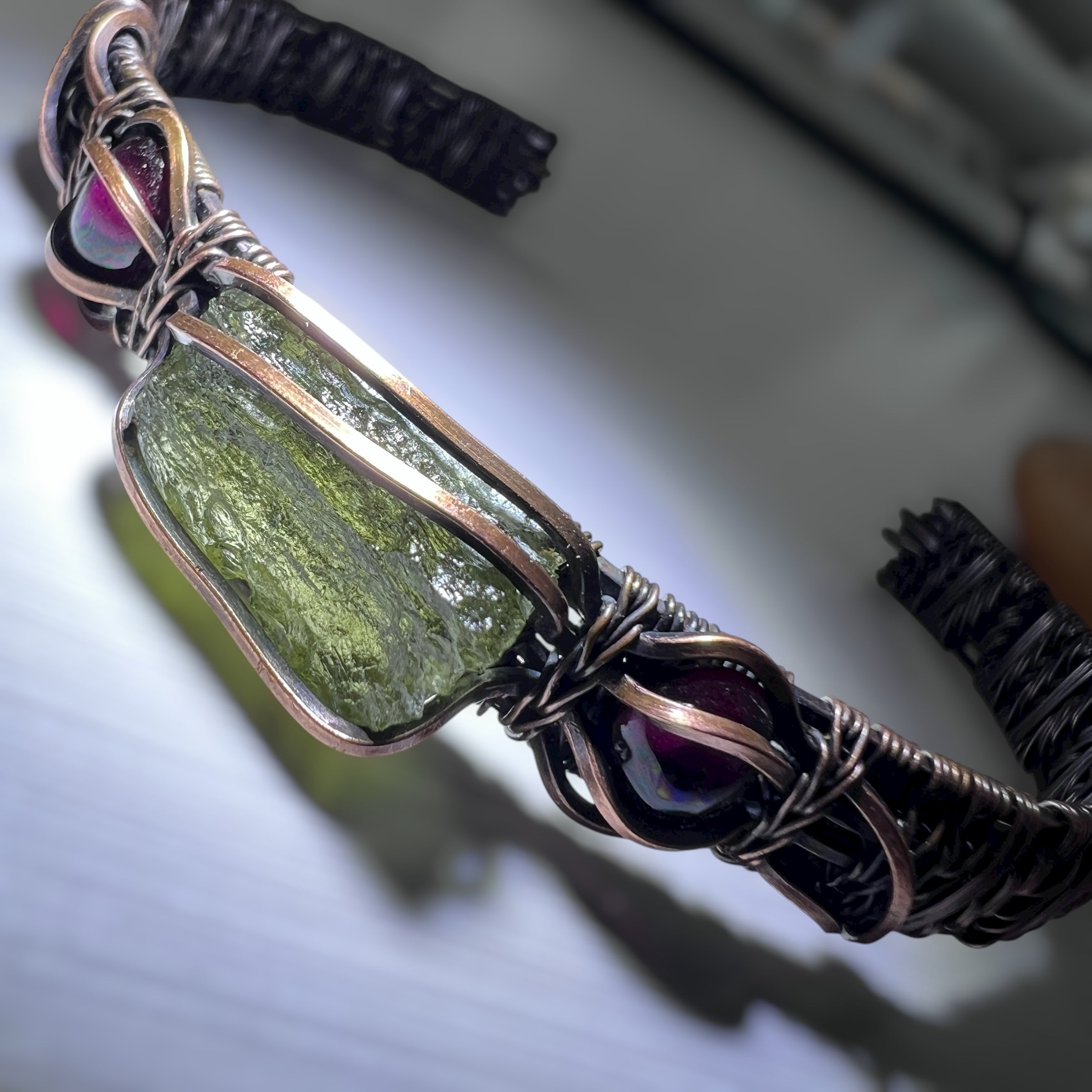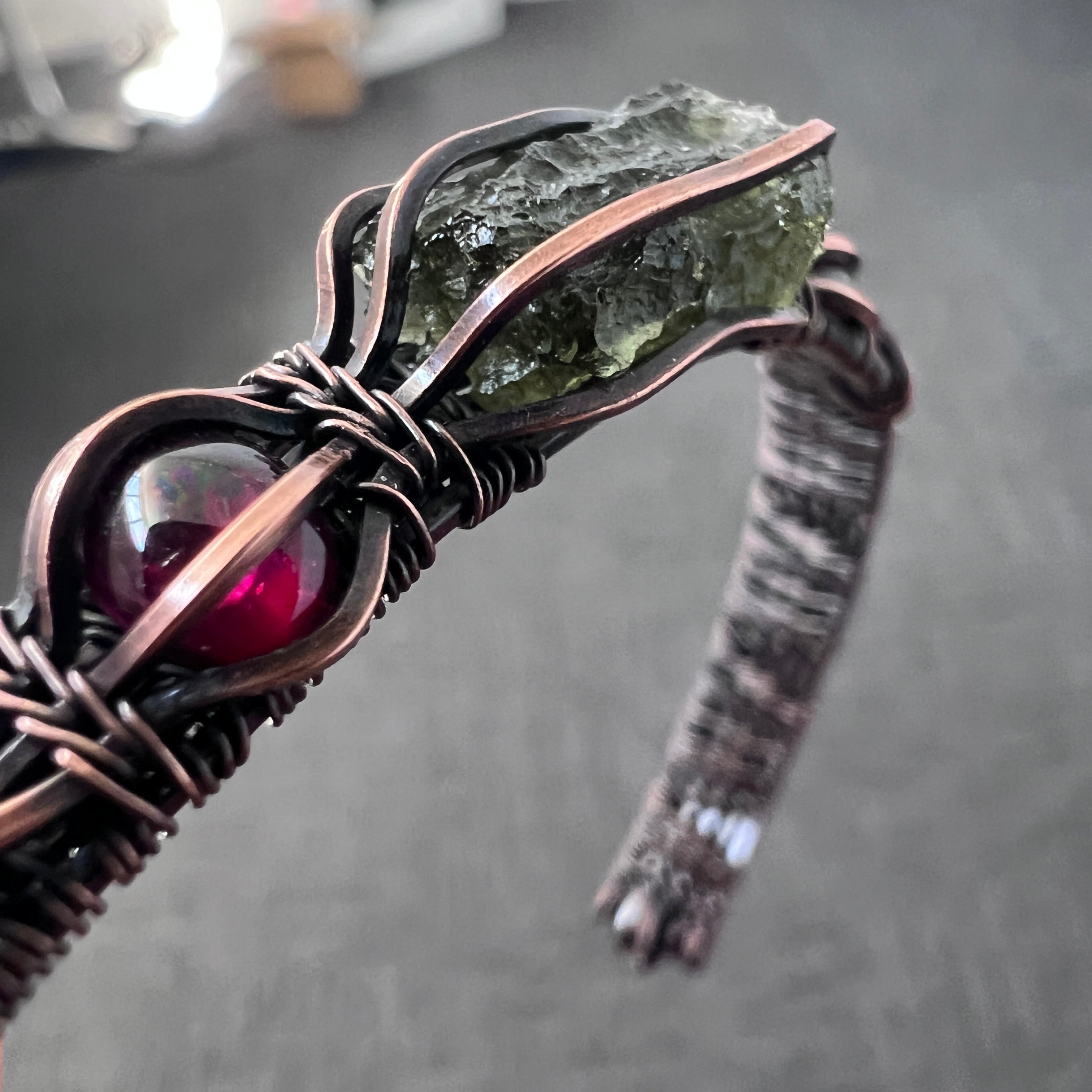 Intricately woven Moldavite bracelet in antiqued copper wire, accented with vibrant Garnet.