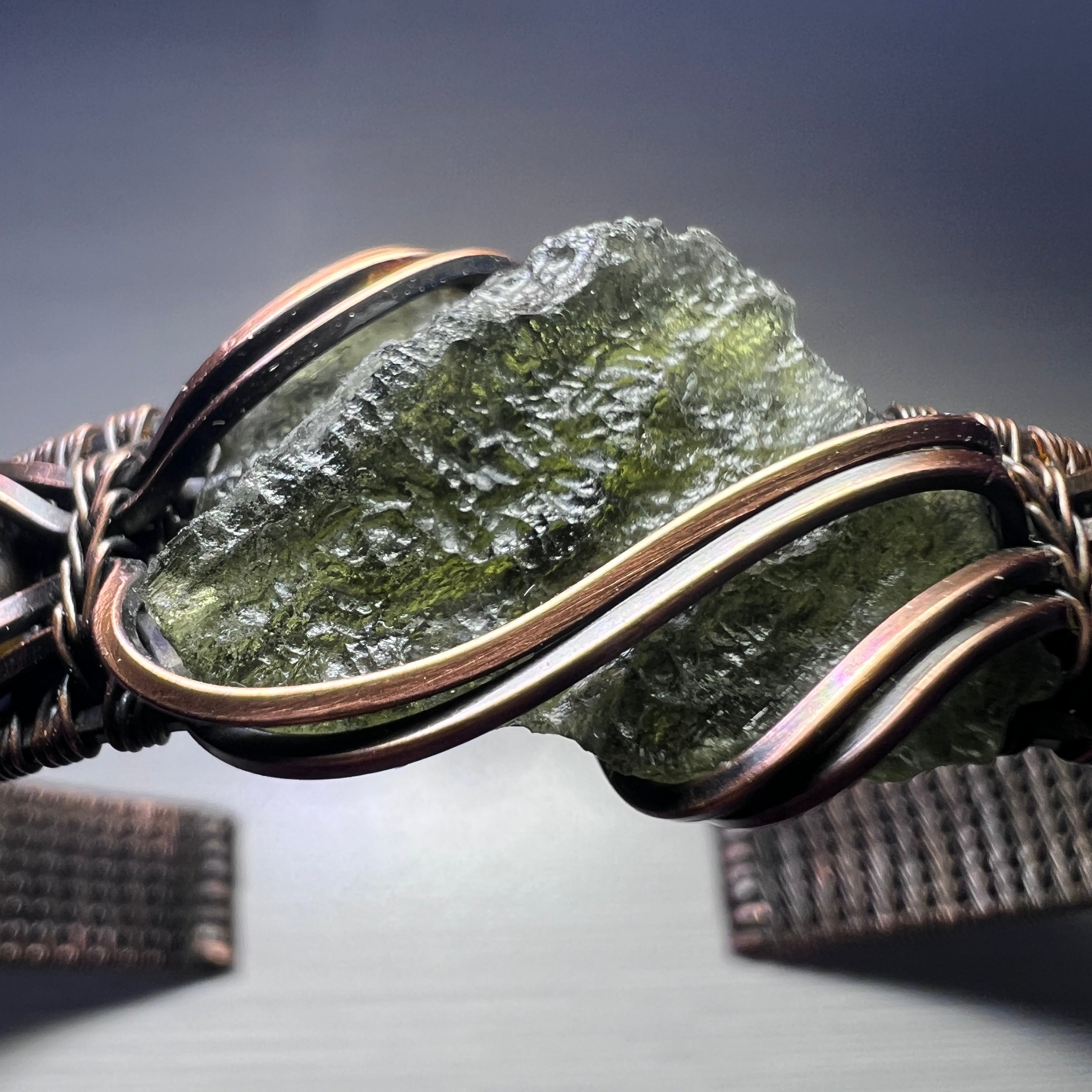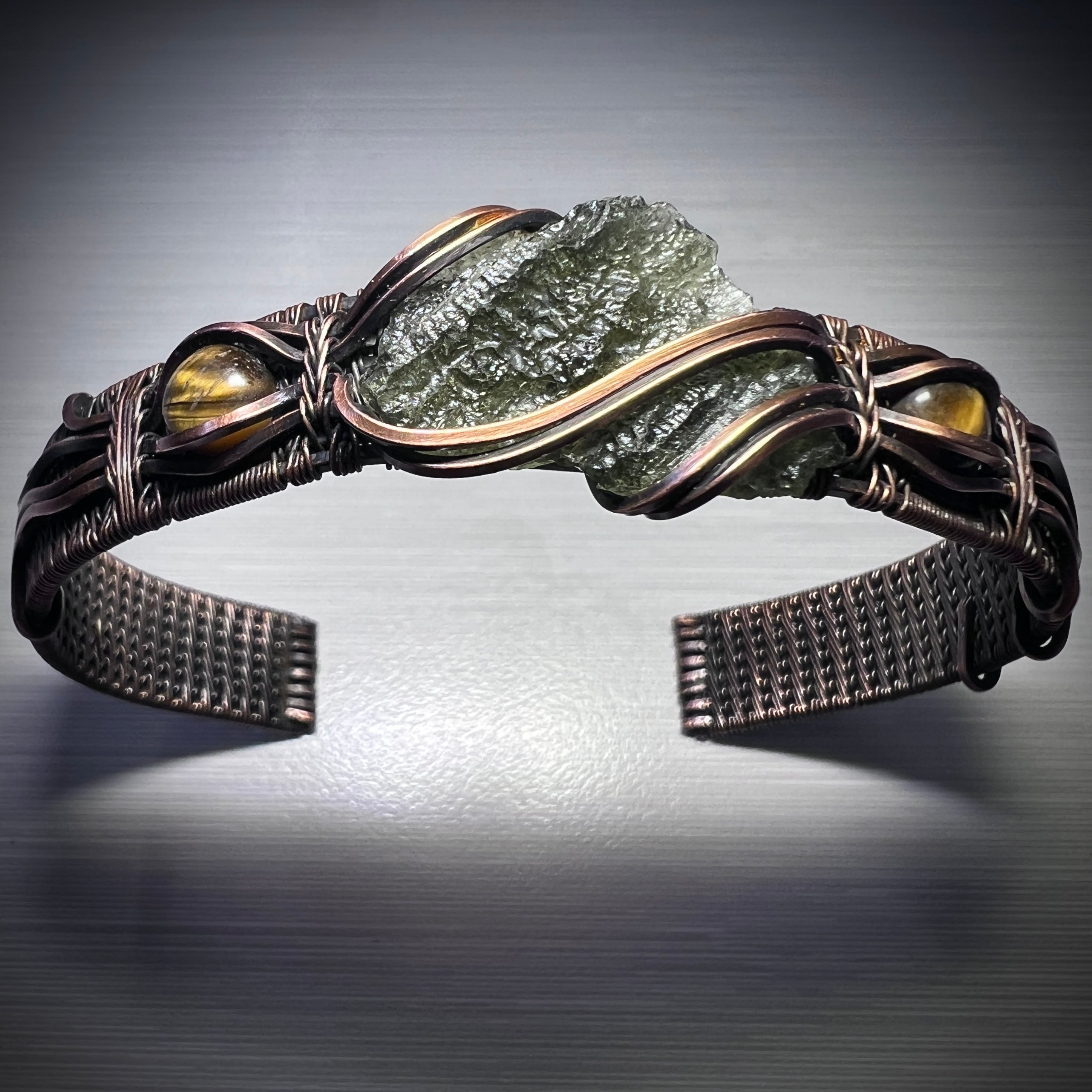 A handcrafted bracelet featuring a genuine 1.8-gram Moldavite from the renowned Chlum locality in the Czech Republic, paired with Tigers Eye. Intricately hand woven in antiqued copper.