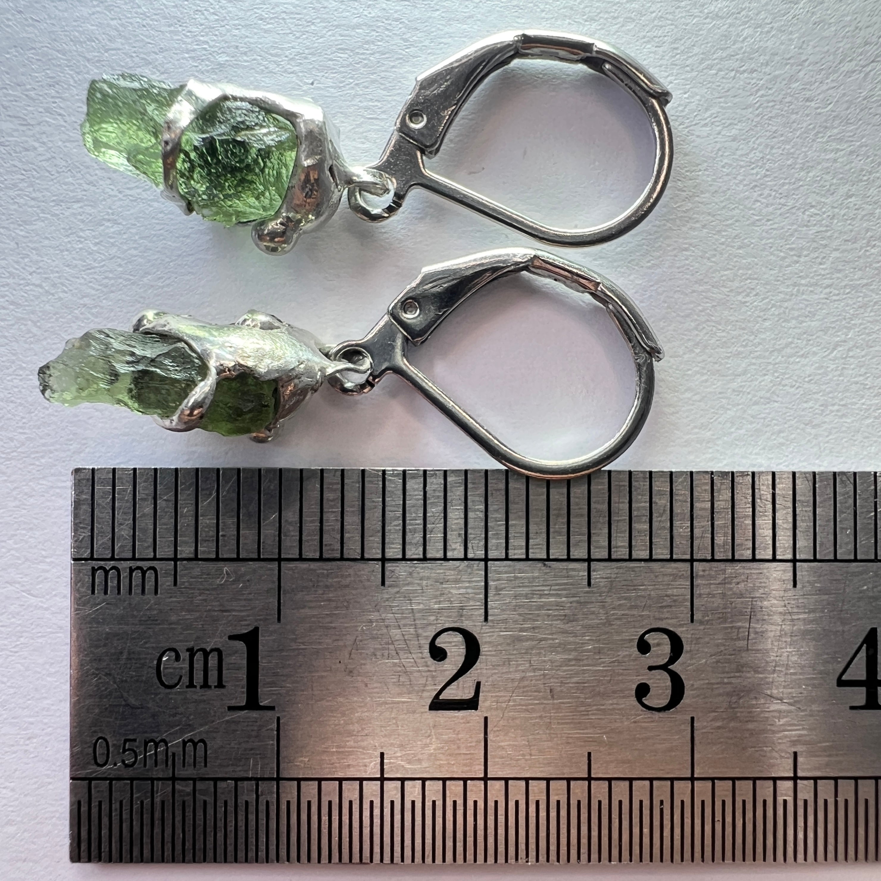 A charming and petite pair of Moldavite earrings, naturally shaped and sourced from the renowned Chlum locality in the Czech Republic. The raw combined weight of the Moldavite specimens is 0.9g.