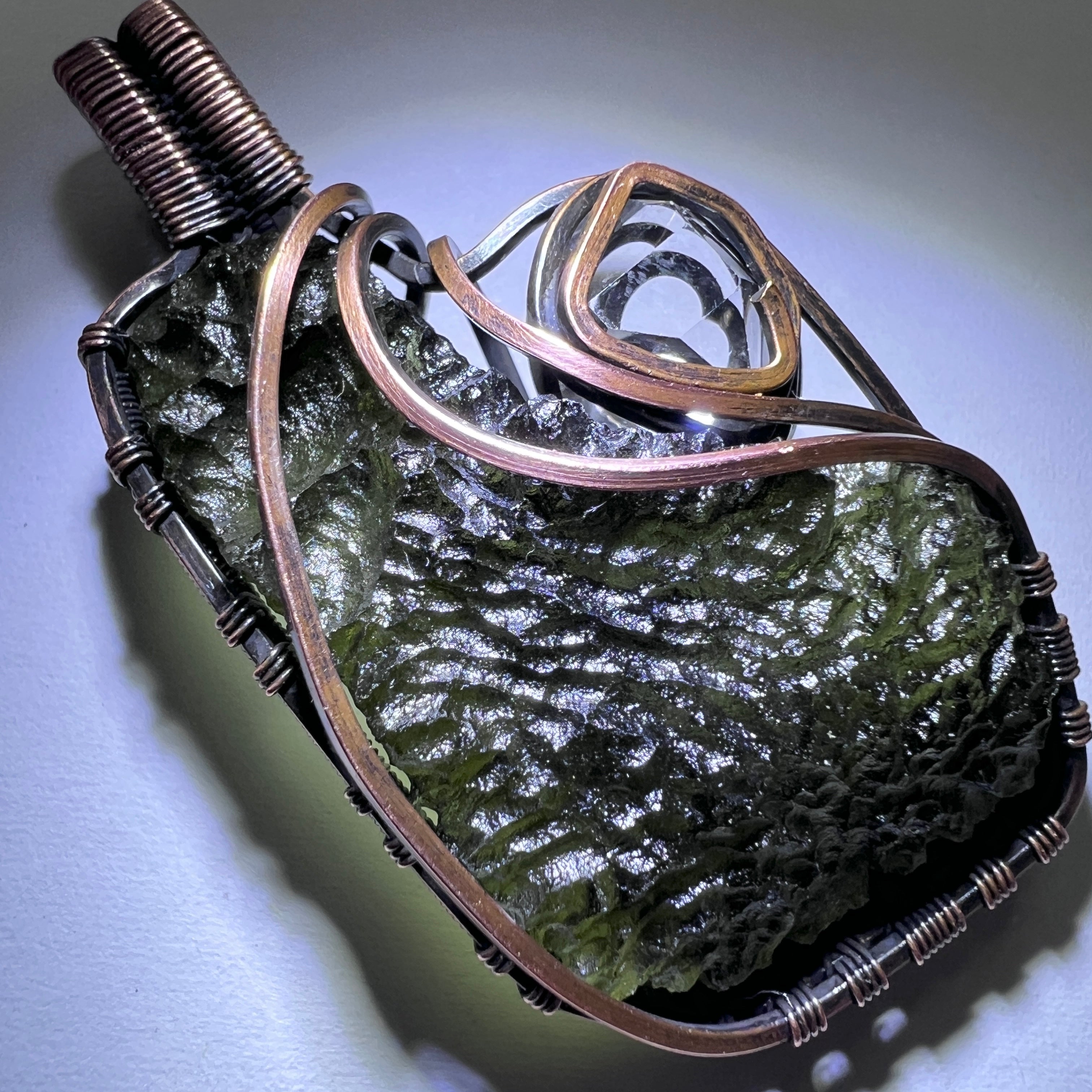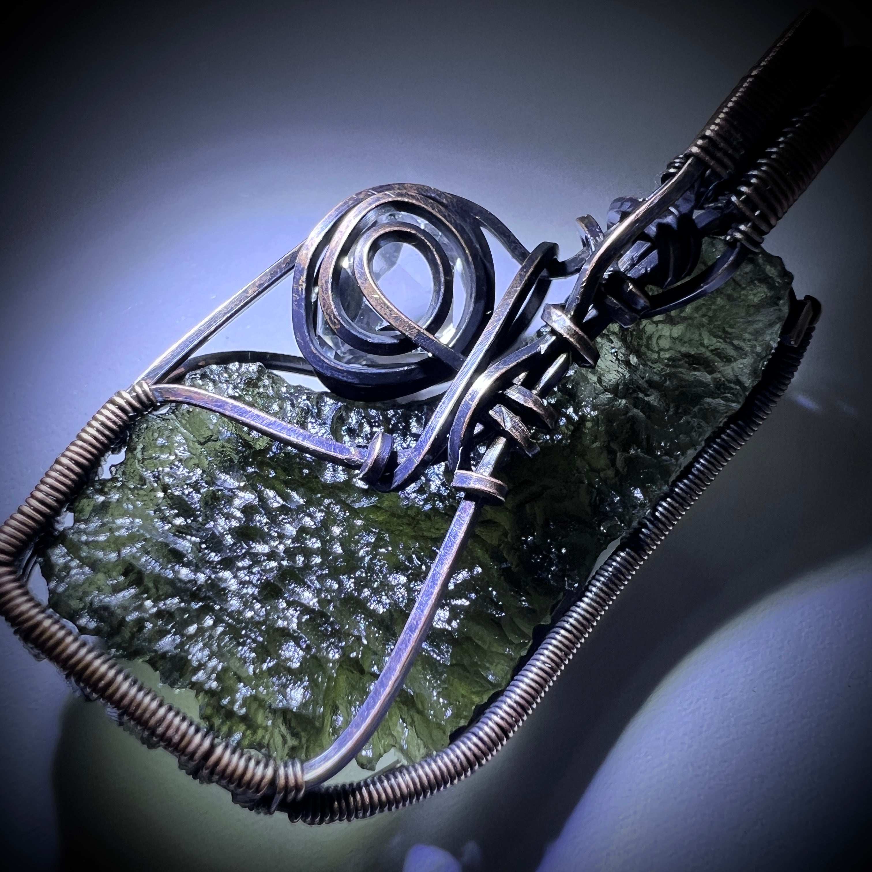 Moldavite & Herkimer Quartz pendant hand wrapped in antiqued copper. The centrepiece is a beautifully textured Moldavite specimen from Maly Chlum weighing 4.64 grams, paired with a brilliant Herkimer Quartz that adds light, contrast, and balance to the piece. The warm tones of antiqued copper suit the natural character of both stones beautifully, resulting in a pendant with strong presence and a distinctly earthy, artisanal feel.