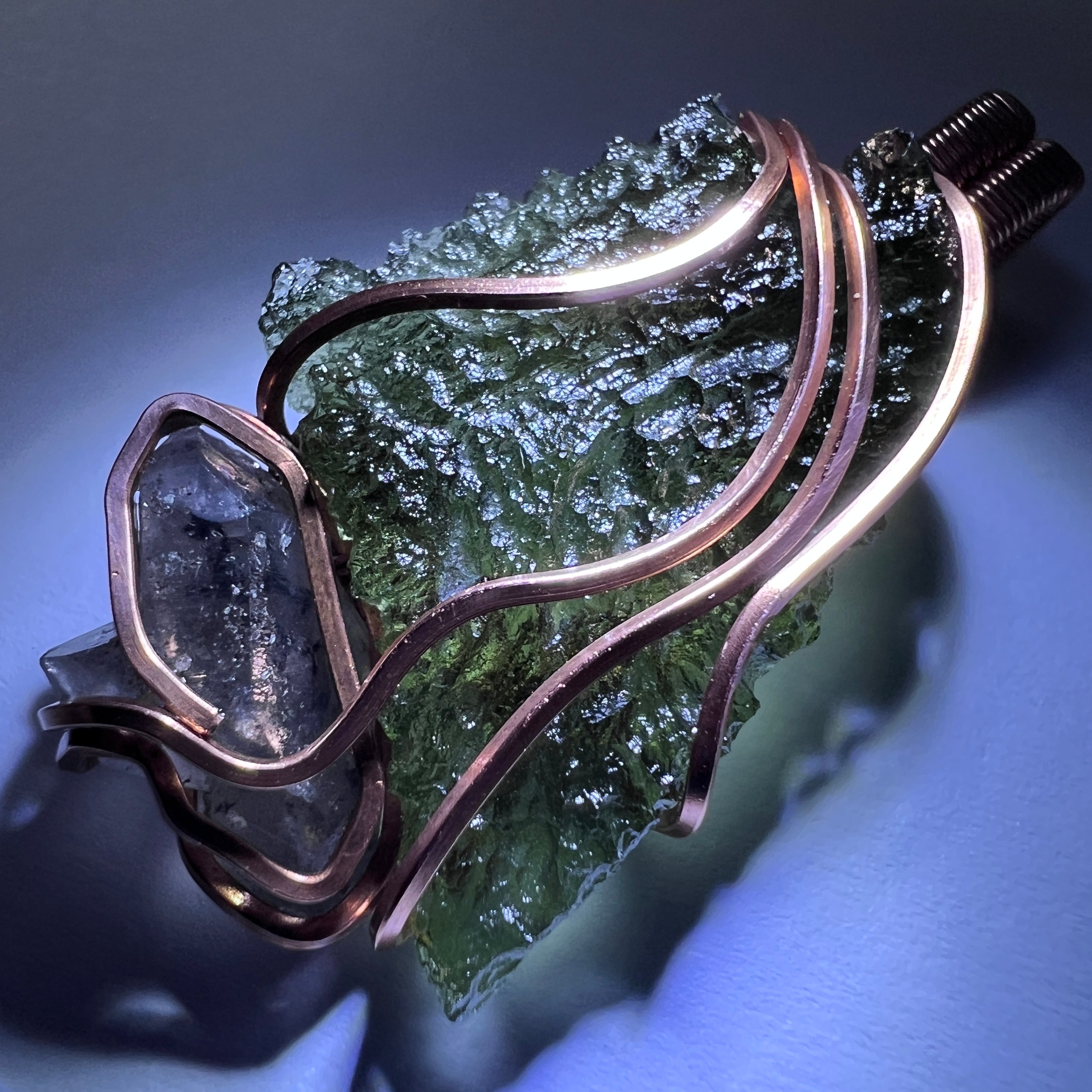 Both stones are tastefully wire wrapped in bright, unantiqued copper, allowing the natural colours of the Moldavite and quartz crystal to stand out. The copper has been left clean and vibrant, creating a fresh and elegant look.
