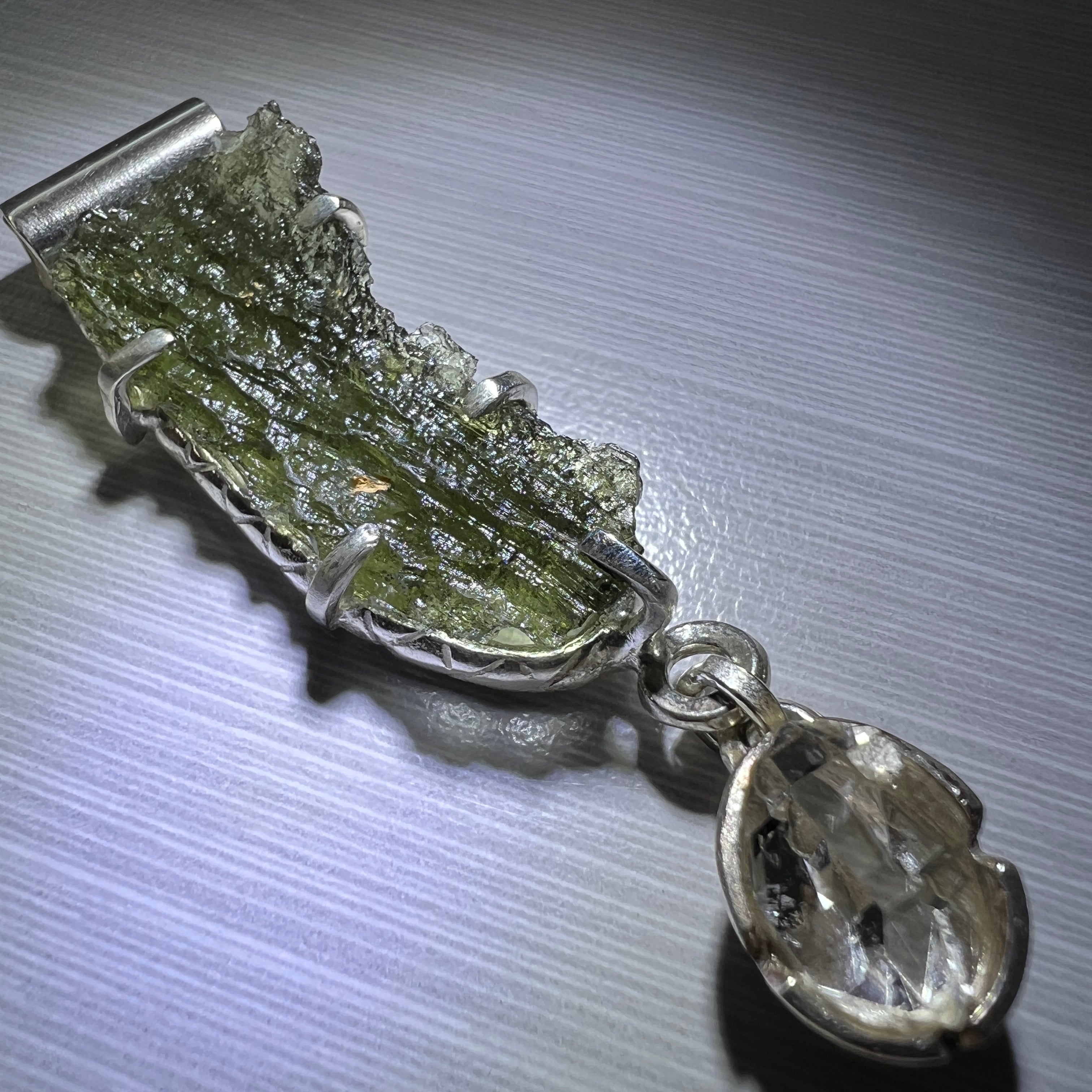 Suspended above it is a beautifully clear Herkimer diamond, positioned to complement the Moldavite perfectly.