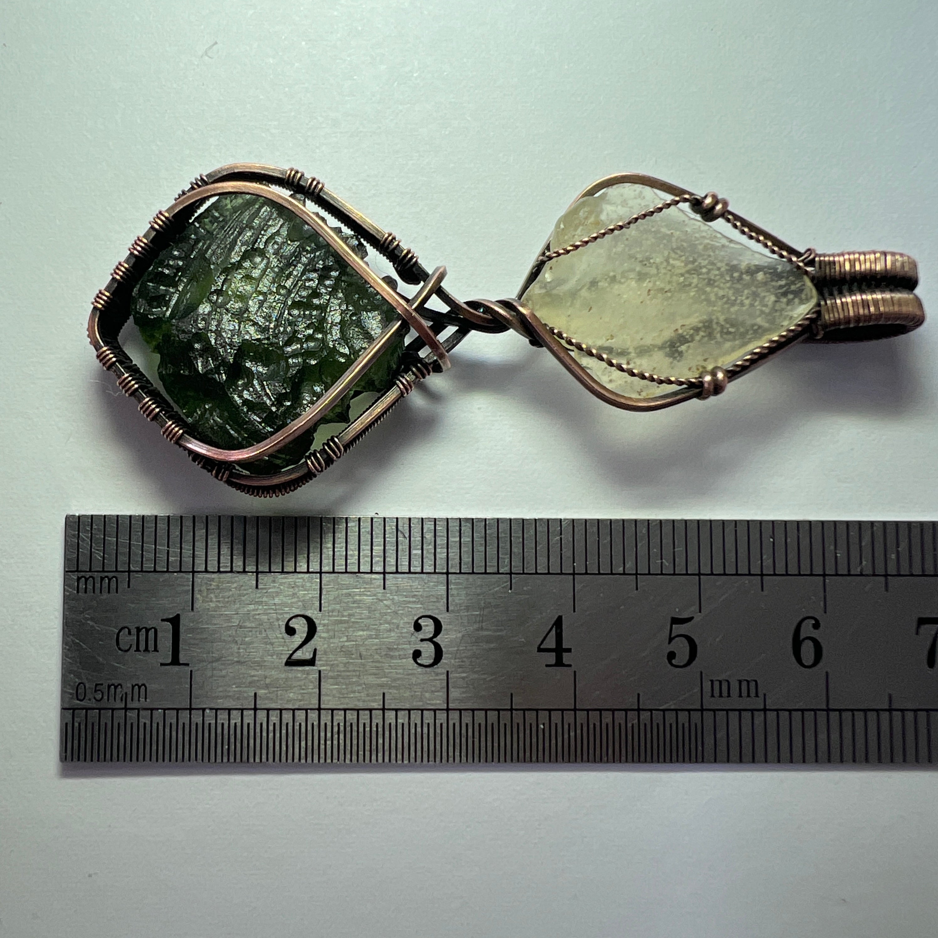 Moldavite, born from a Central European meteorite impact, carries powerful transformational energy, while Libyan Desert Glass, formed in the heart of the Sahara, radiates clarity, manifestation, and inner strength. Together, they form a dialogue between two ancient worlds—green and gold, European forest and Saharan sands, two separate impact events now united in one extraordinary pendant.