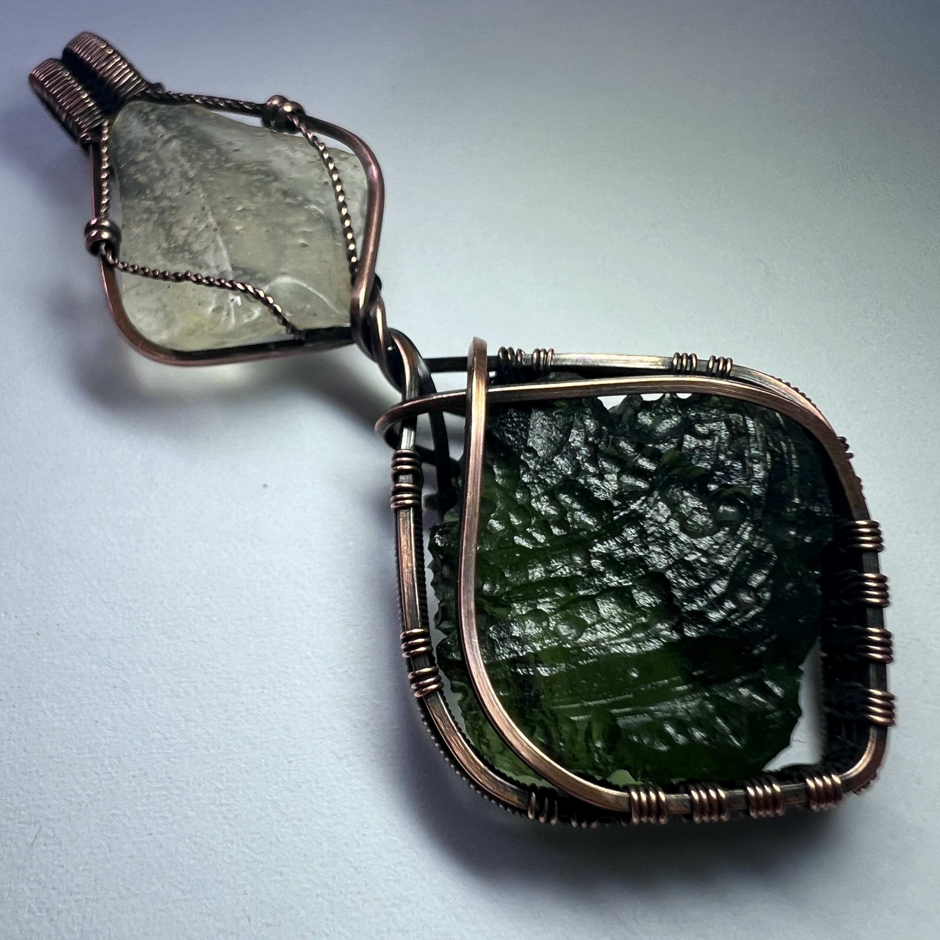 This Moldavite & Libyan Desert Glass pendant, weighing 3.01 grams, showcases the deep forest green of Moldavite alongside the warm golden glow of Libyan Desert Glass. Hand-wrapped in antiqued copper, the piece blends raw energy with timeless craftsmanship, creating a pendant that feels both grounded and otherworldly.