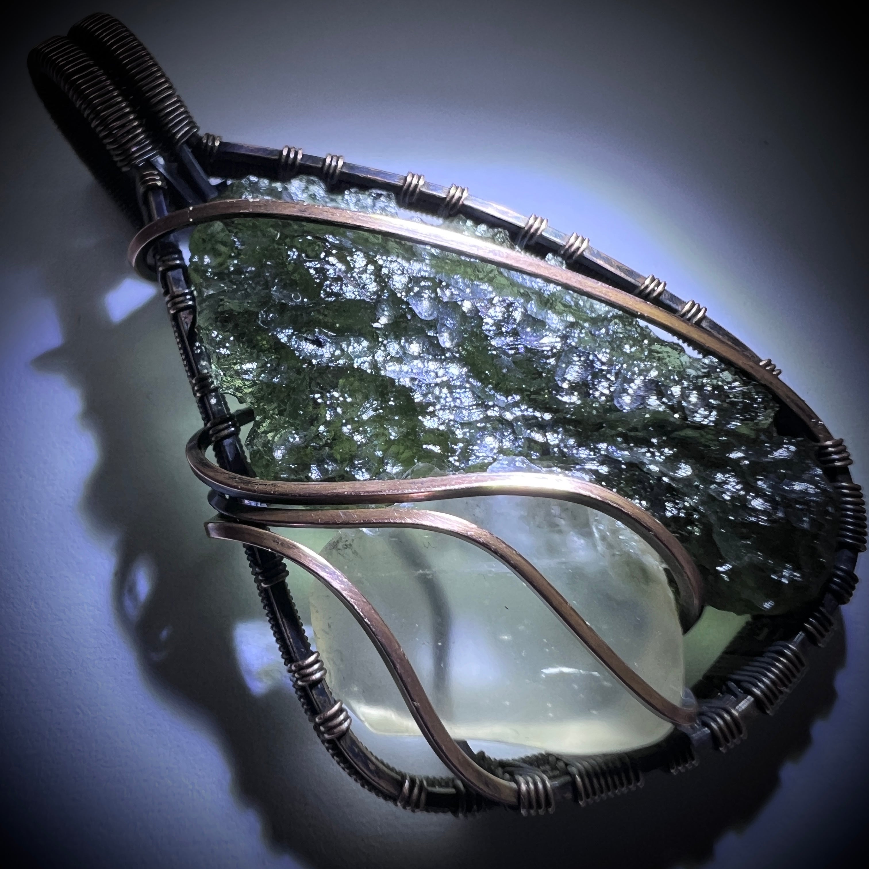 This Moldavite & Libyan Desert Glass copper pendant features a beautifully textured Moldavite weighing 4.38 grams, paired with the warm, golden glow of Libyan Desert Glass. Hand-wrapped in antiqued copper, the design carries a bold, grounded presence—balancing raw natural form with a timeless, rugged finish.