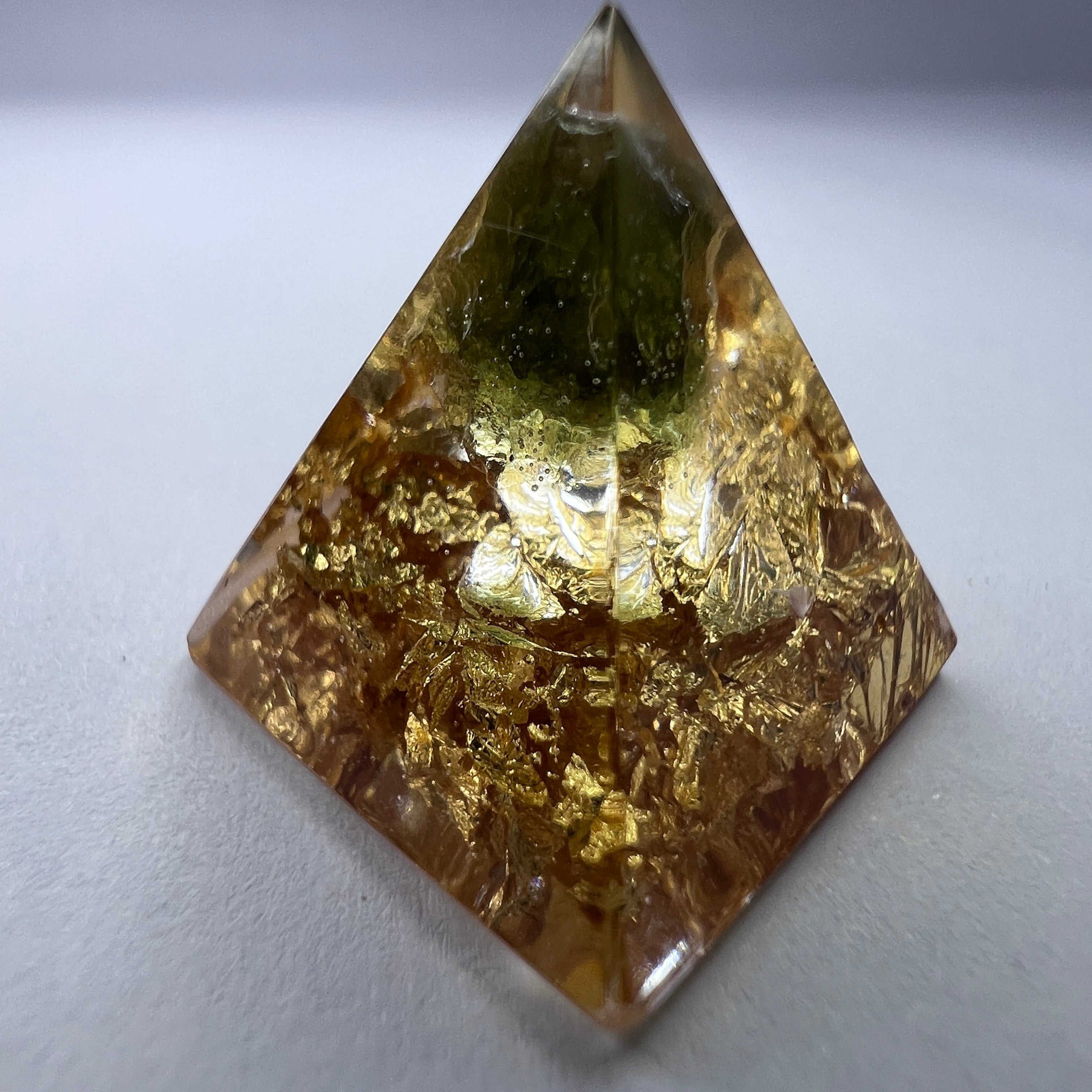 The 24ct gold leaf is sourced from Agoleaf (agoleaf.com), ensuring purity and high vibrational integrity. Moldavite, a rare tektite formed from a meteorite impact over 15 million years ago, amplifies the pyramid’s energetic field and is prized for its transformative and awakening properties.