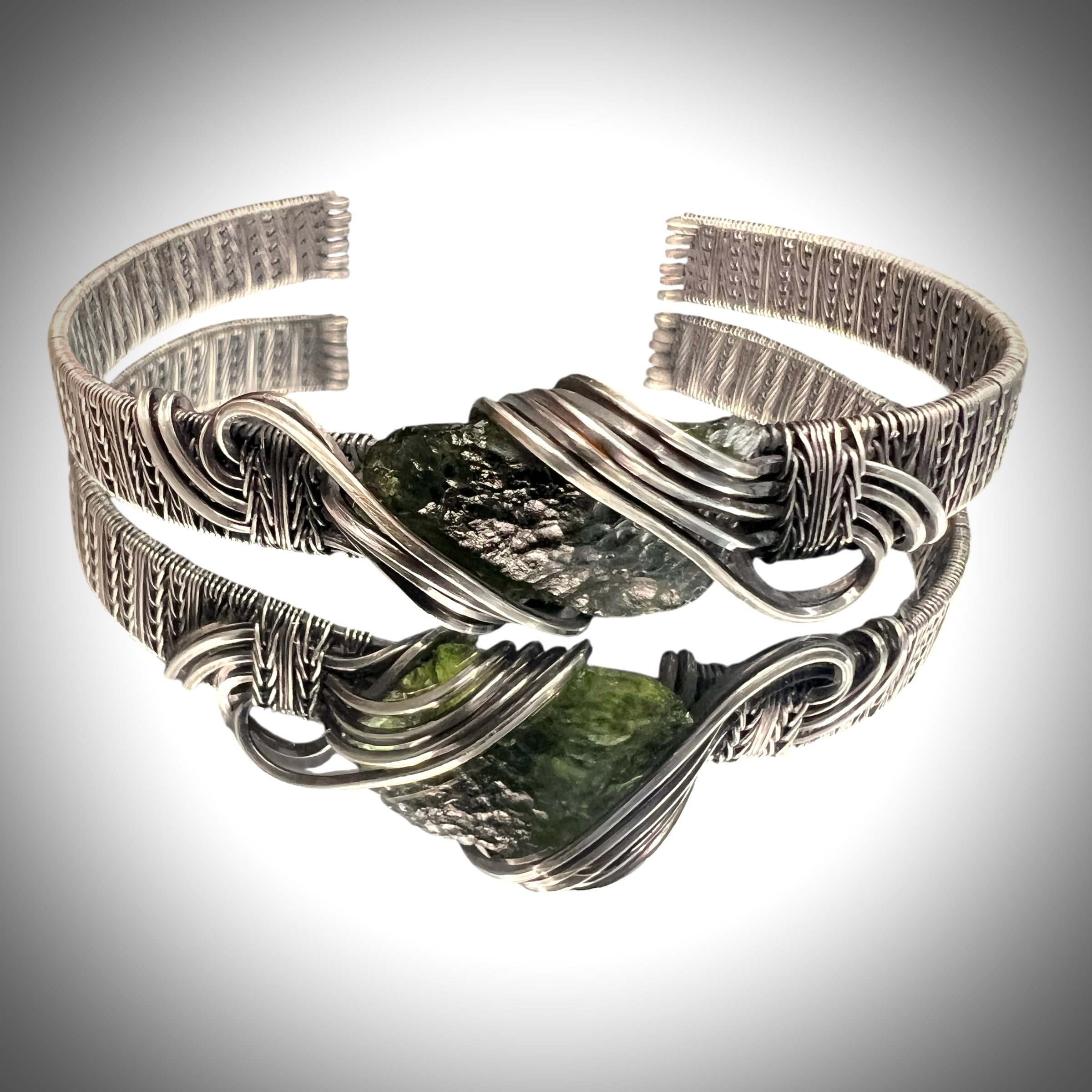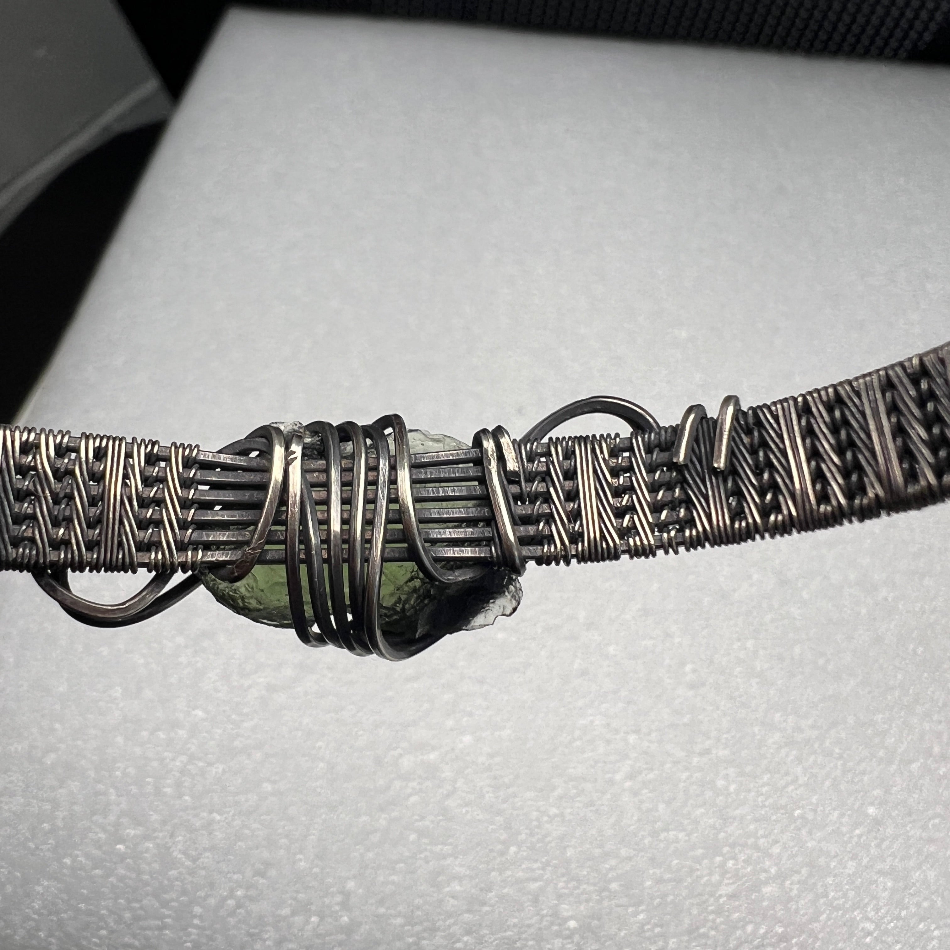 This exquisite piece features a 1.4 g Moldavite specimen from Chlum, securely wrapped in a refined sterling silver weave that enhances both beauty and durability. The design carries a subtle antique finish, giving it depth and character.