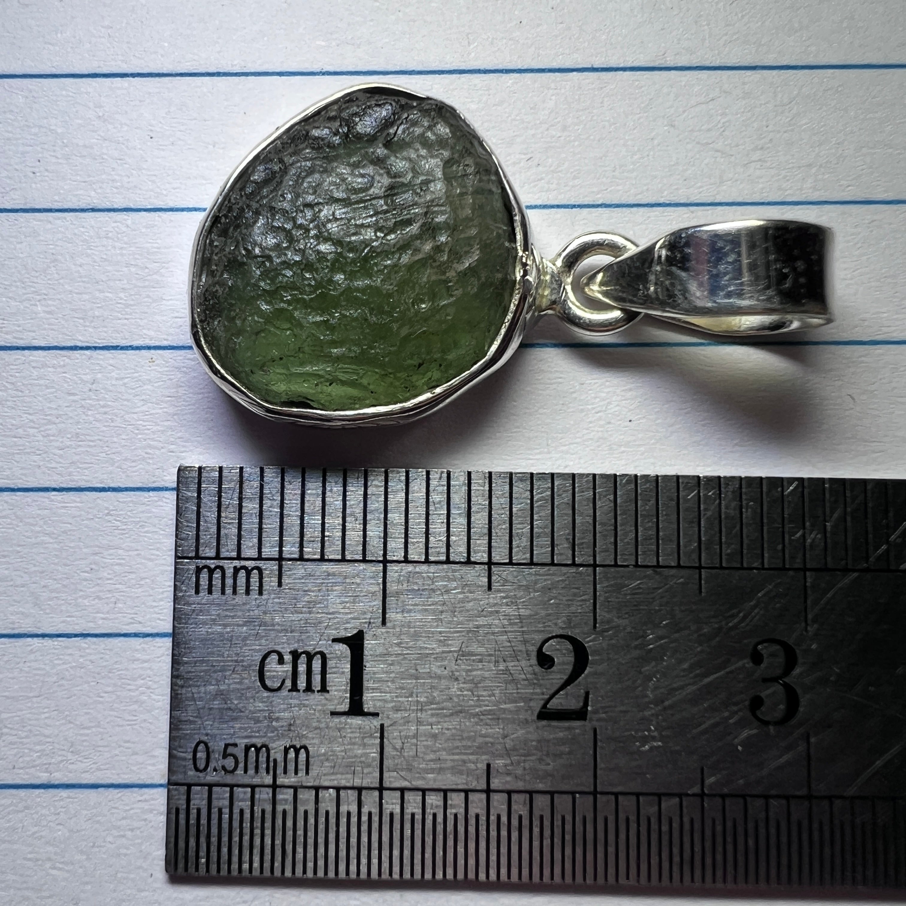 Genuine Moldavite pendant set in solid sterling silver. Moldavite sourced from the Vrabce deposits. Full weight of pendant including Moldavite and the Silver bezel setting is 3.65g.