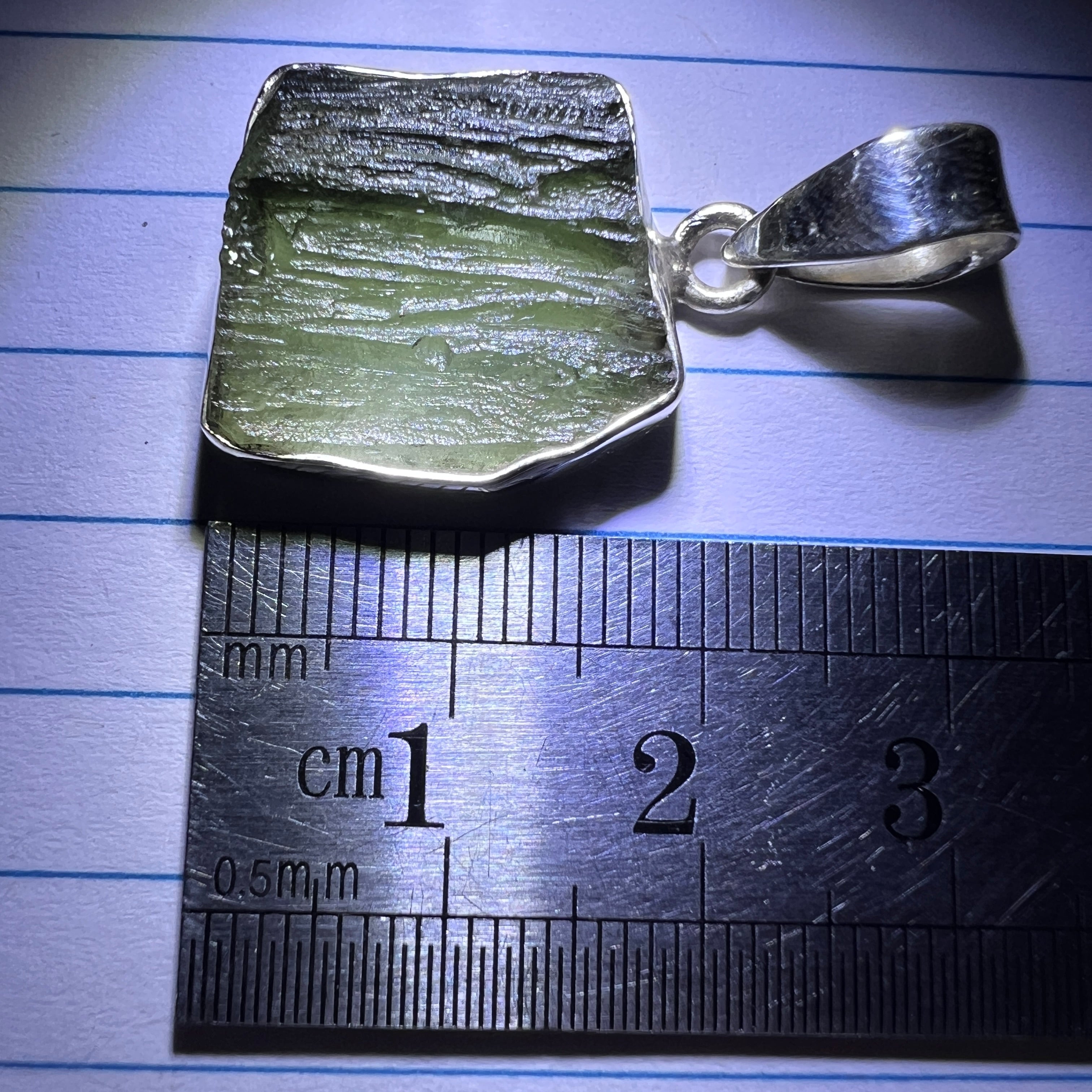 Genuine Moldavite pendant set in solid sterling silver. Moldavite sourced from the Chlum deposits. Full weight of pendant including Moldavite and the Silver bezel setting is 4.24g.