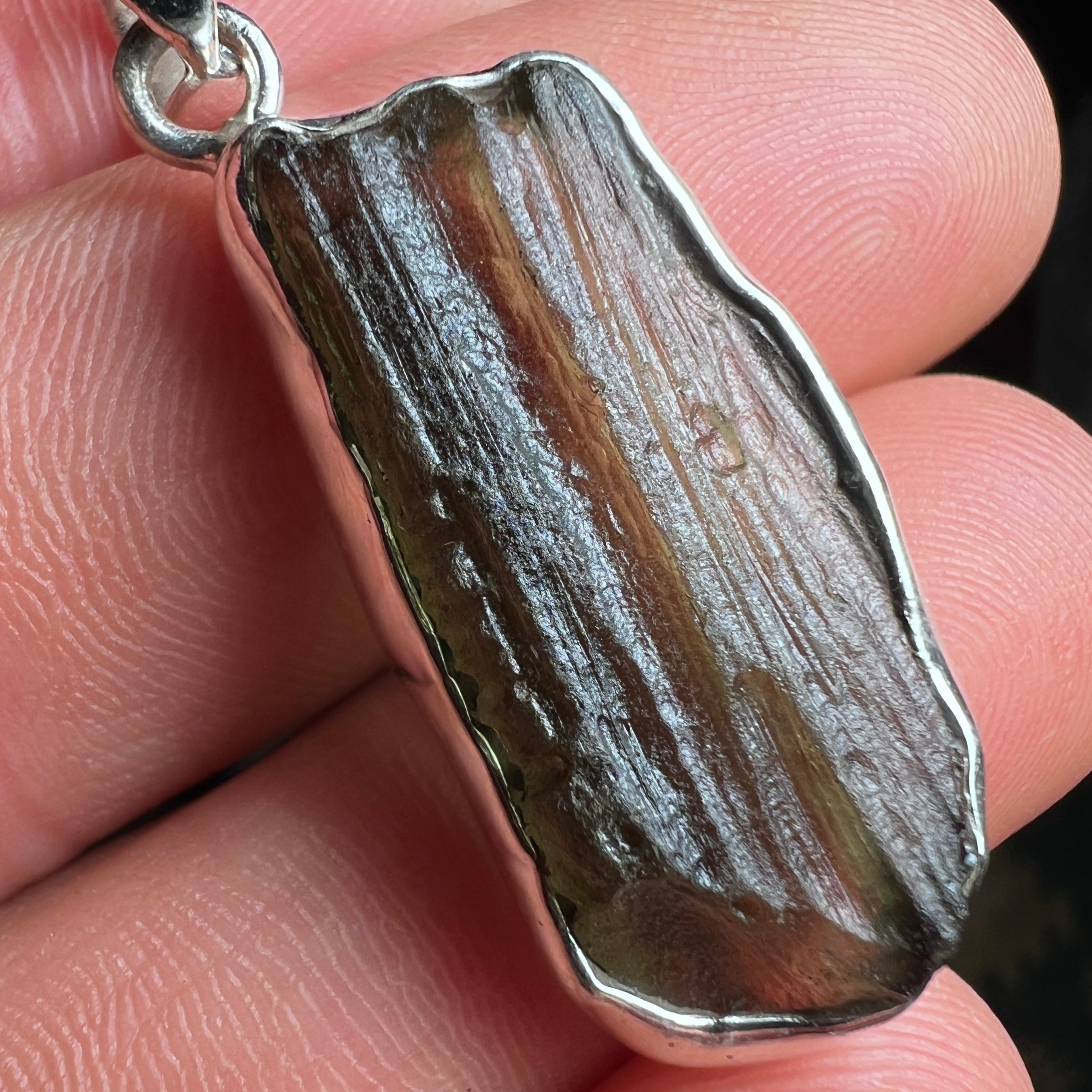Genuine Moldavite pendant set in solid sterling silver. Moldavite sourced from the Chlum deposits. Full weight of pendant including Moldavite and the Silver bezel setting is 4.96g.