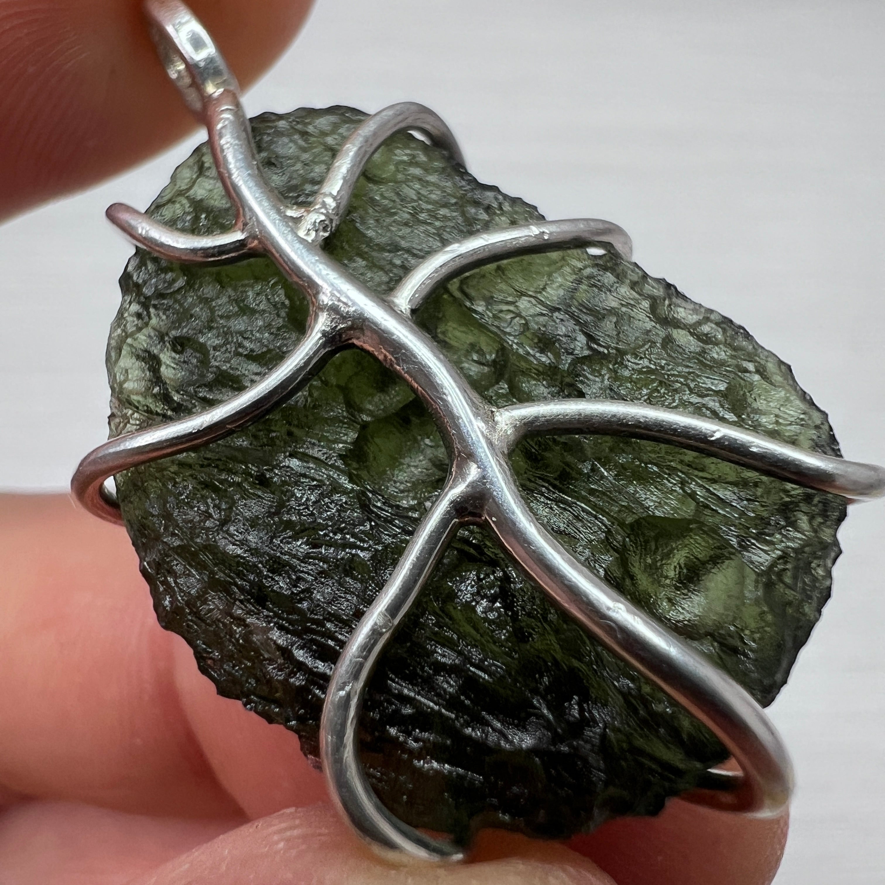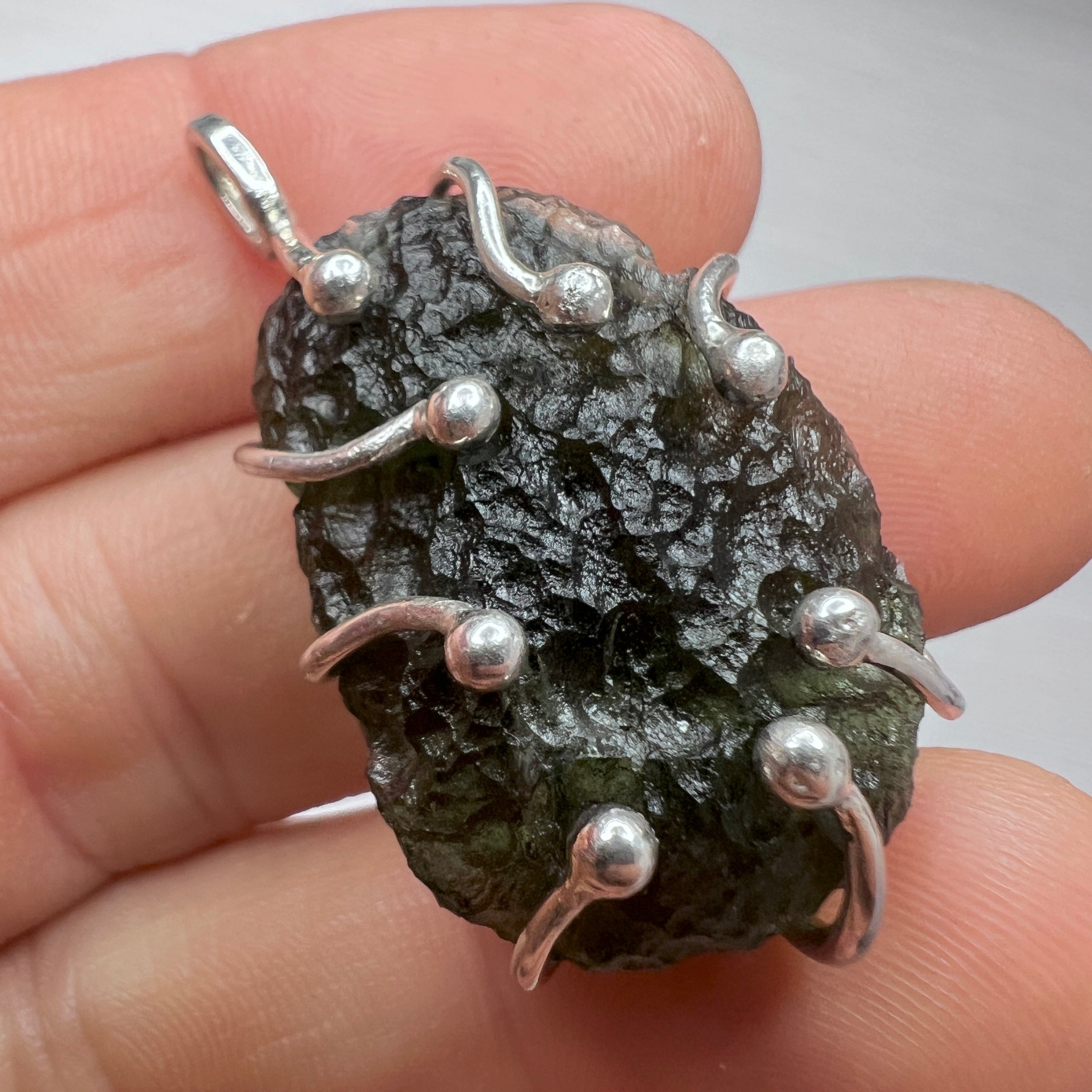 Impressive Moldavite pendant featuring an elegant tentacle-like design in solid sterling silver. Set with a sizeable 8.53 gram Moldavite from Chlum, this specimen displays beautiful natural etching along with excellent clarity and translucency. A striking piece with strong presence, combining artistic silverwork with the unmistakable character of authentic Czech Moldavite.