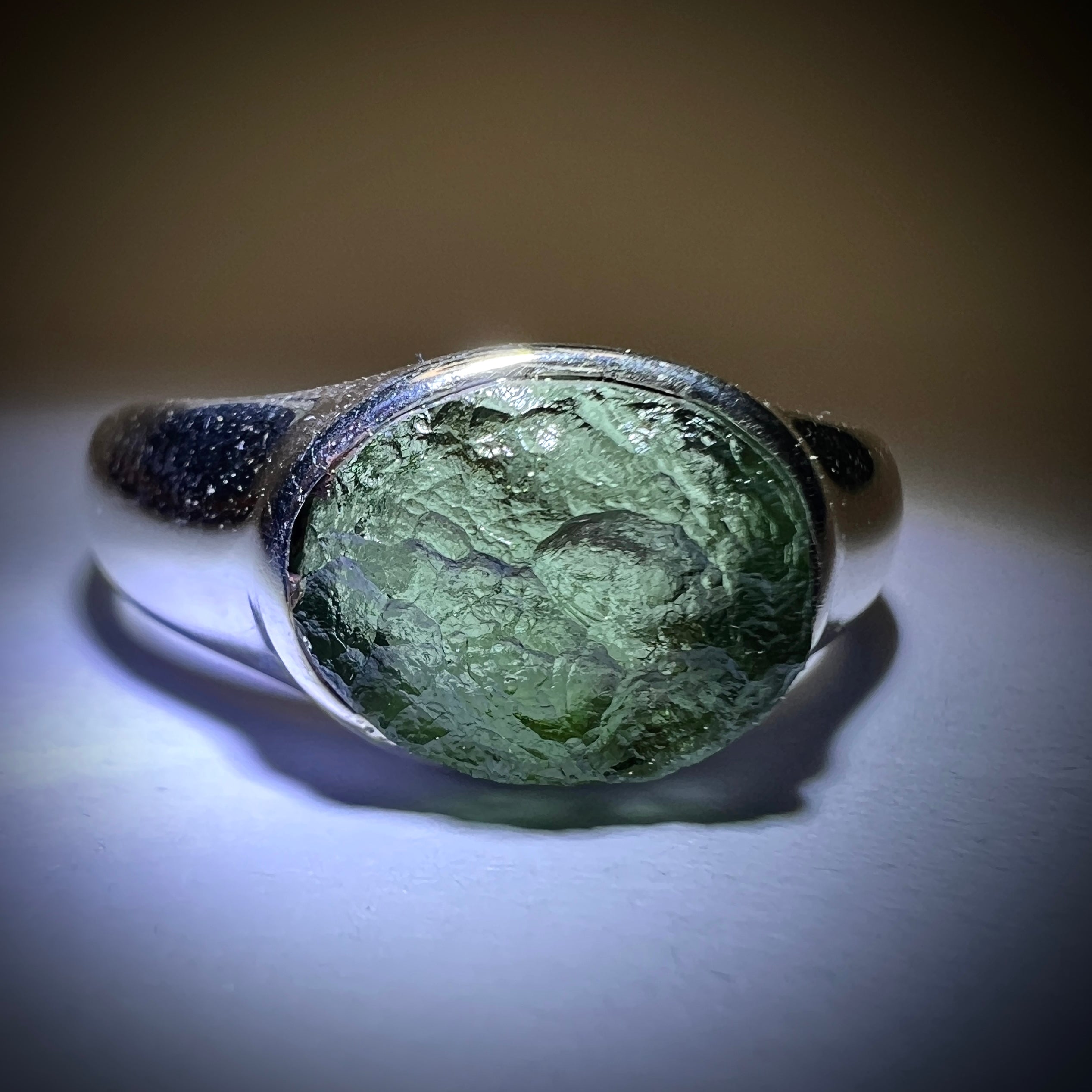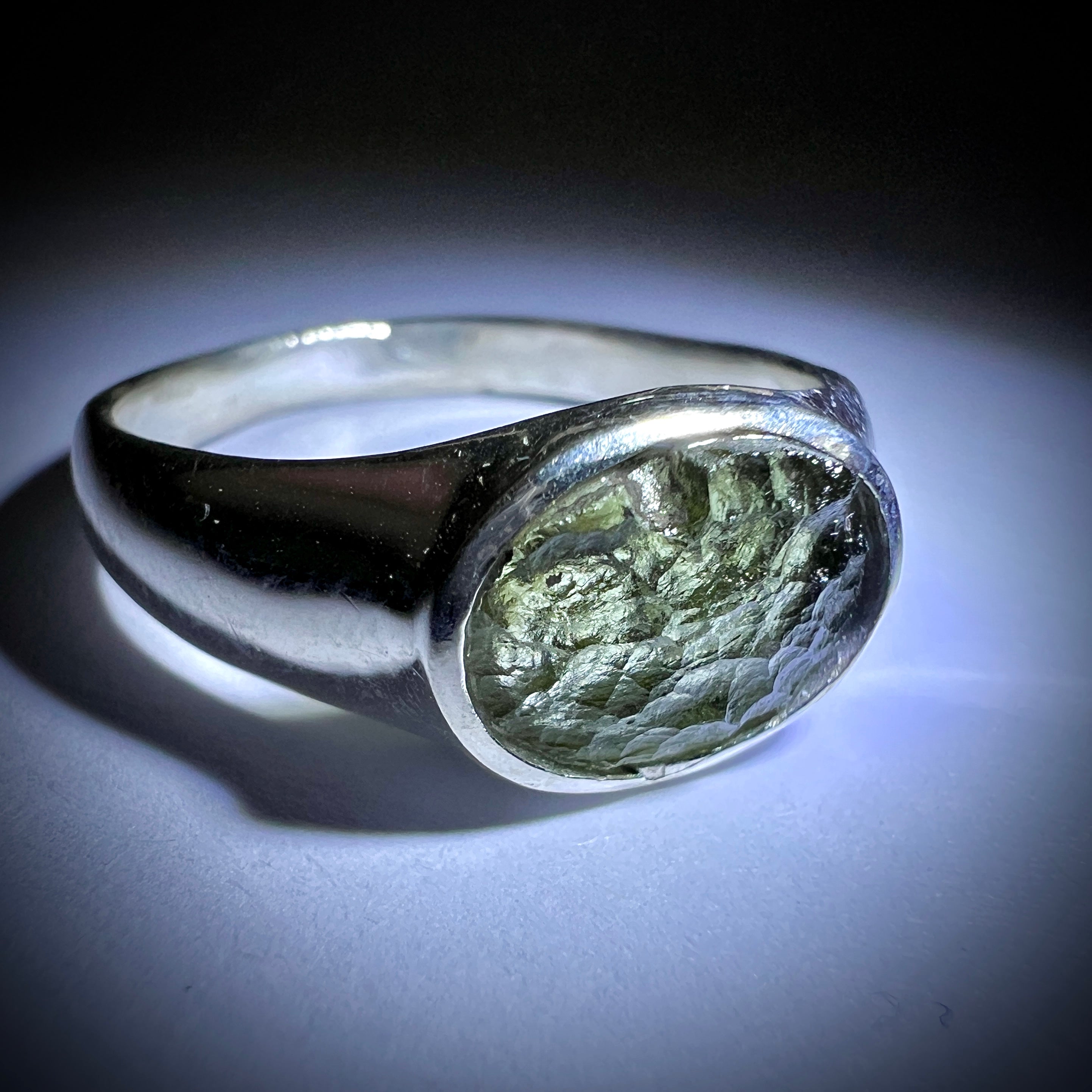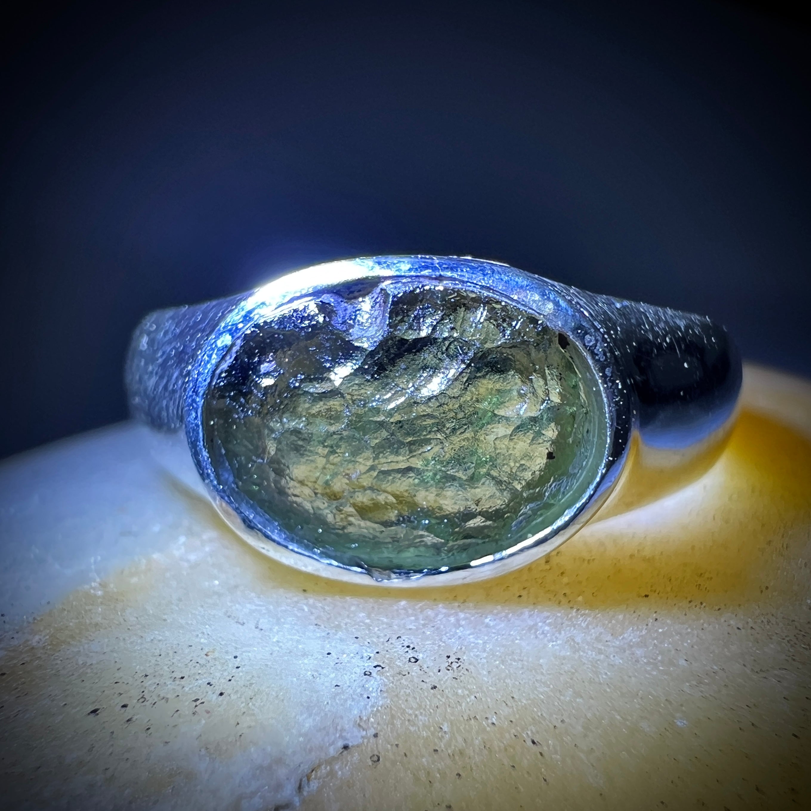 Moldavite is a rare tektite or meteoric glass, caused by an asteroid impact 15mil. years ago. The intense, 10,000°c+ temperatures of the strike vapourised the asteroid, target rock and sand, flinging the molten substance high into the atmosphere.