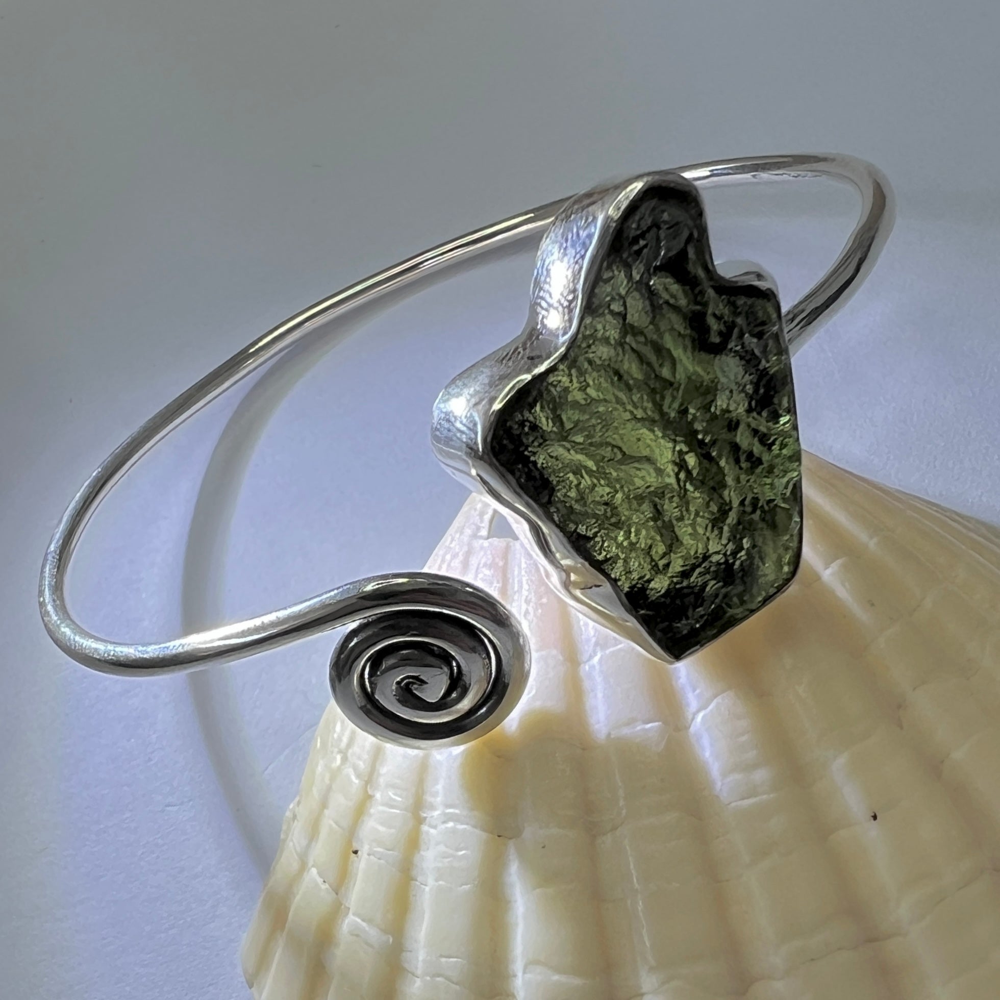 Adding a touch of ancient symbolism, the silver band terminates in a graceful spiral motif, which sits opposite the moldavite for a balanced, modern aesthetic. With a circumference of 18cm and a polished finish, this cuff is designed for comfort and slight adjustability. It is a stunning piece that merges the raw, cosmic energy of genuine Czech Moldavite with elegant, fluid silver work.