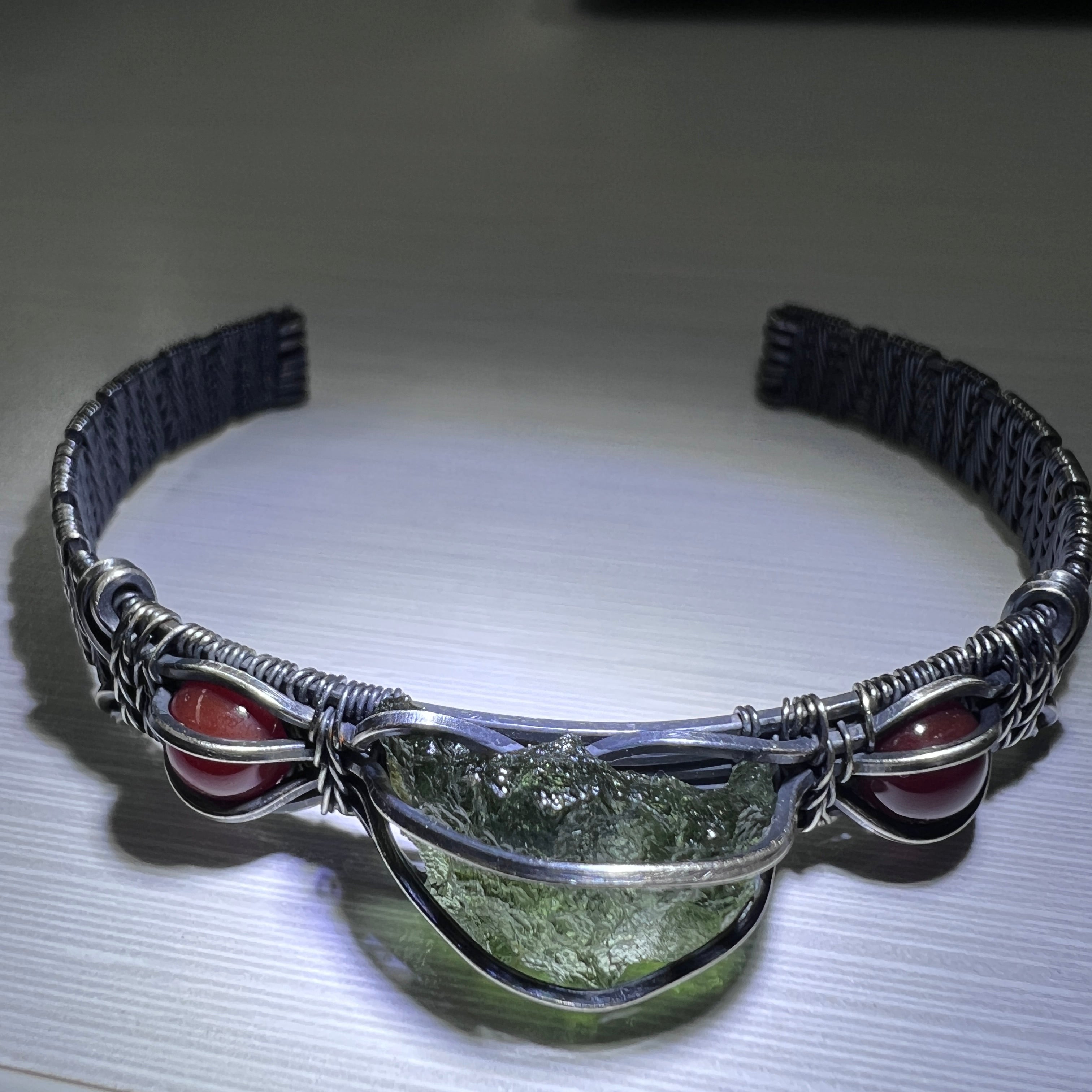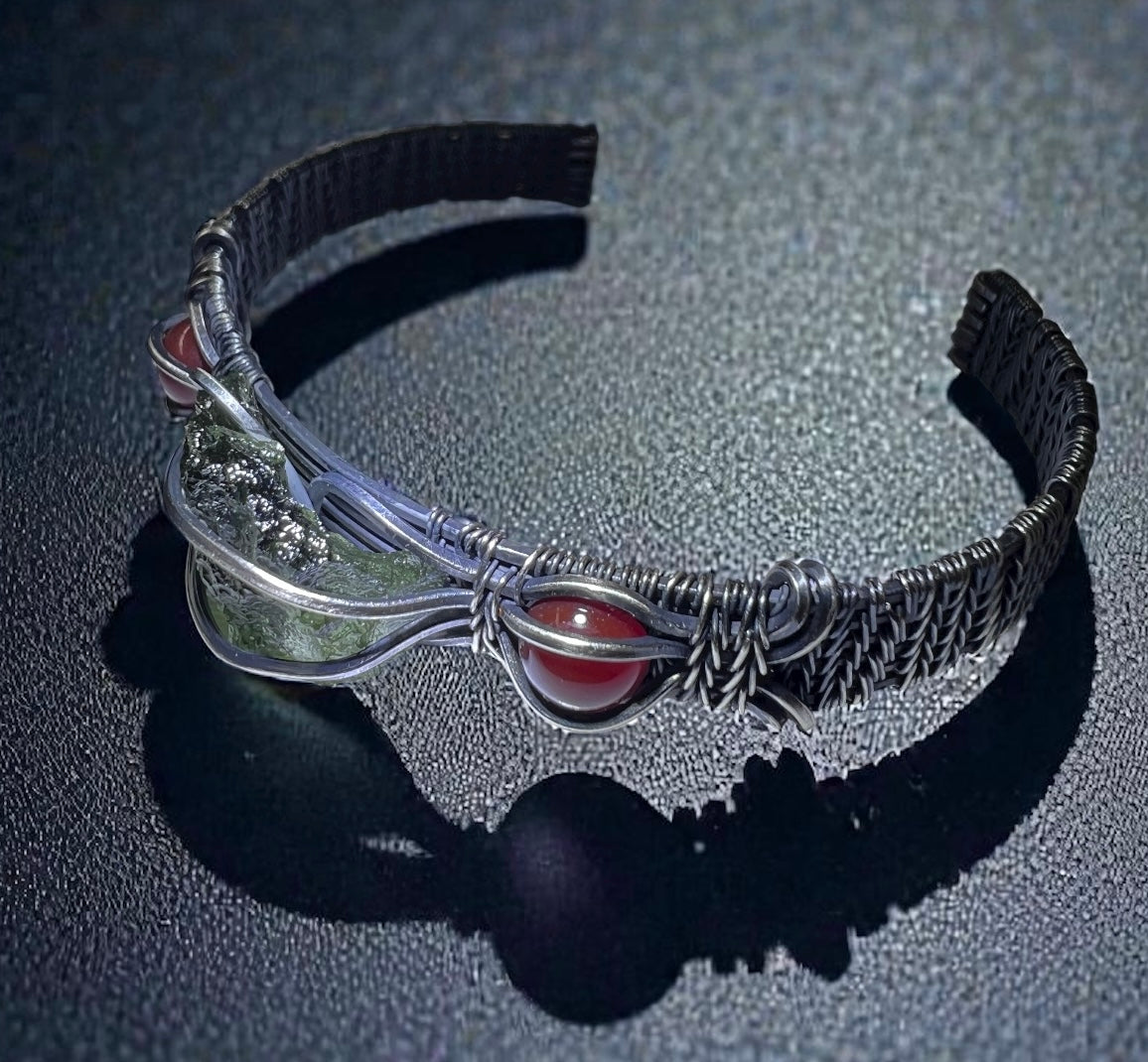A beautifully handcrafted copper bracelet featuring a 1.1g Chlum Moldavite at its centre, intricately woven in a detailed wire-wrap design. On either side sit two luminous Sunstones, chosen for their warm, uplifting energy and gentle balance to Moldavite’s transformational pull.