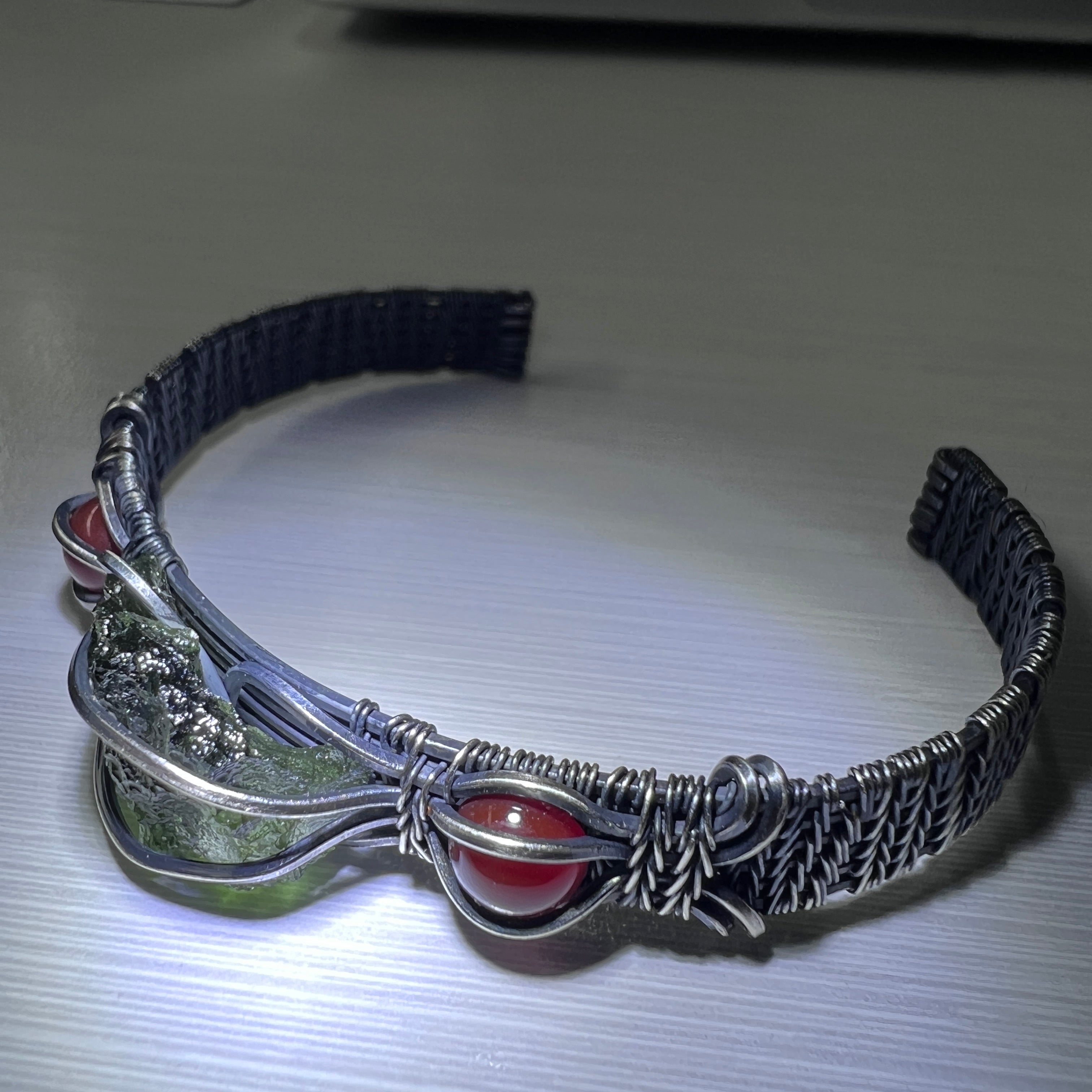 Each bracelet is individually hand-woven using two different gauges of copper wire, then dipped in sulphur, repolished, and sealed to achieve its distinctive antiqued finish. The result is a harmonious blend of craftsmanship and energy — Moldavite and copper complement each other perfectly, both aesthetically and energetically, enhancing the piece’s grounding and transformative properties.