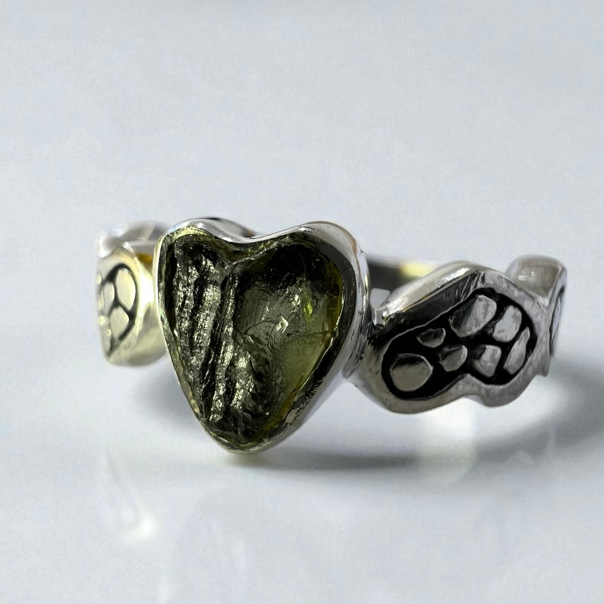 Set in a handcrafted .925 sterling silver band, the elongated heart design symbolizes emotional strength, openness, and spiritual renewal. Each Moldavite is one of a kind, carrying its own natural contours and cosmic fingerprint that make every piece truly unique.