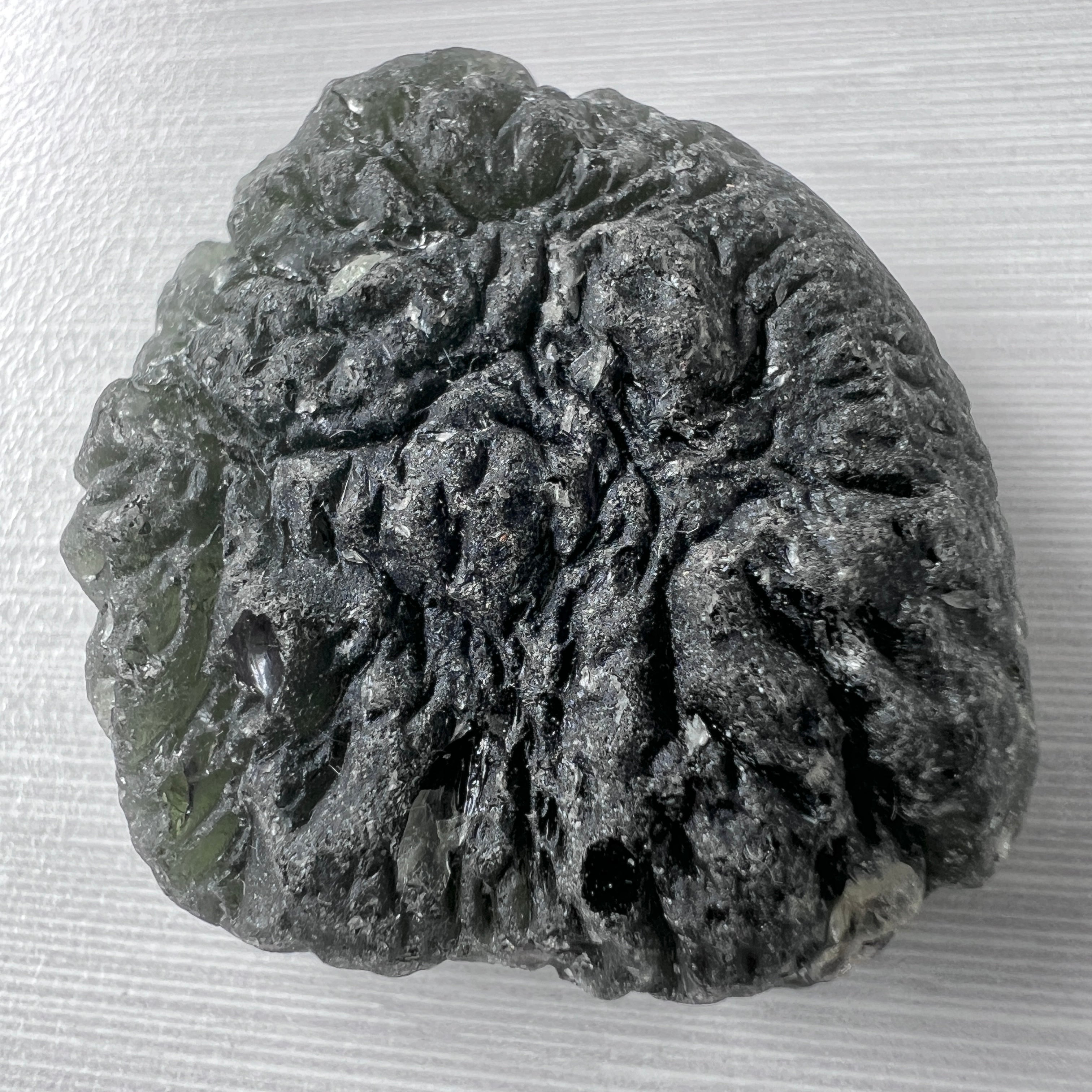Unlike pieces that lay buried deep in the earth, untouched for millions of years, this Moldavite has spent much of its 15-million-year existence near the surface. The result is a strikingly weathered exterior that speaks to its long journey through time and the elements. The natural wear is not damage—it is history etched into stone, giving this specimen a raw and authentic personality collectors deeply admire.